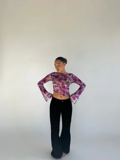 Glamorous Womens Blurred-Purple Floral Asymmetric Crop-Top. We absolutely love this fun crop top! Featuring an asymmetric lettuce hem, and split flared sleeves, this crop top has loads of interesting details, and the blurred purple floral print is stunning! Pair with your favourite pair of jeans fora unique day look!