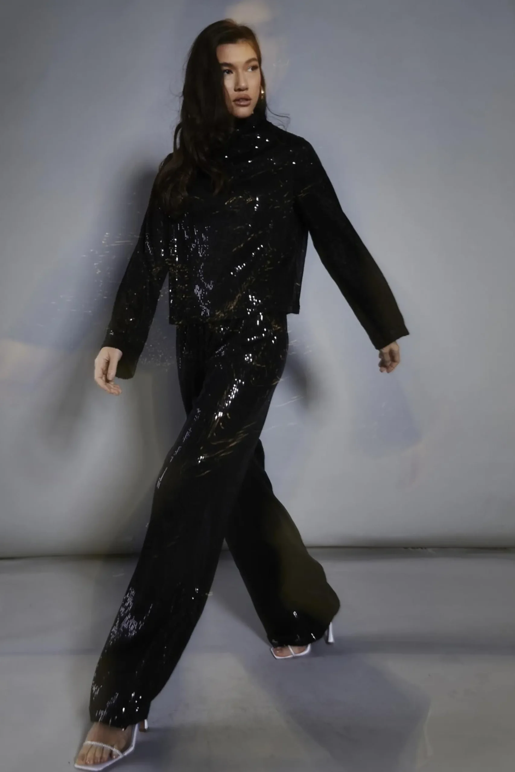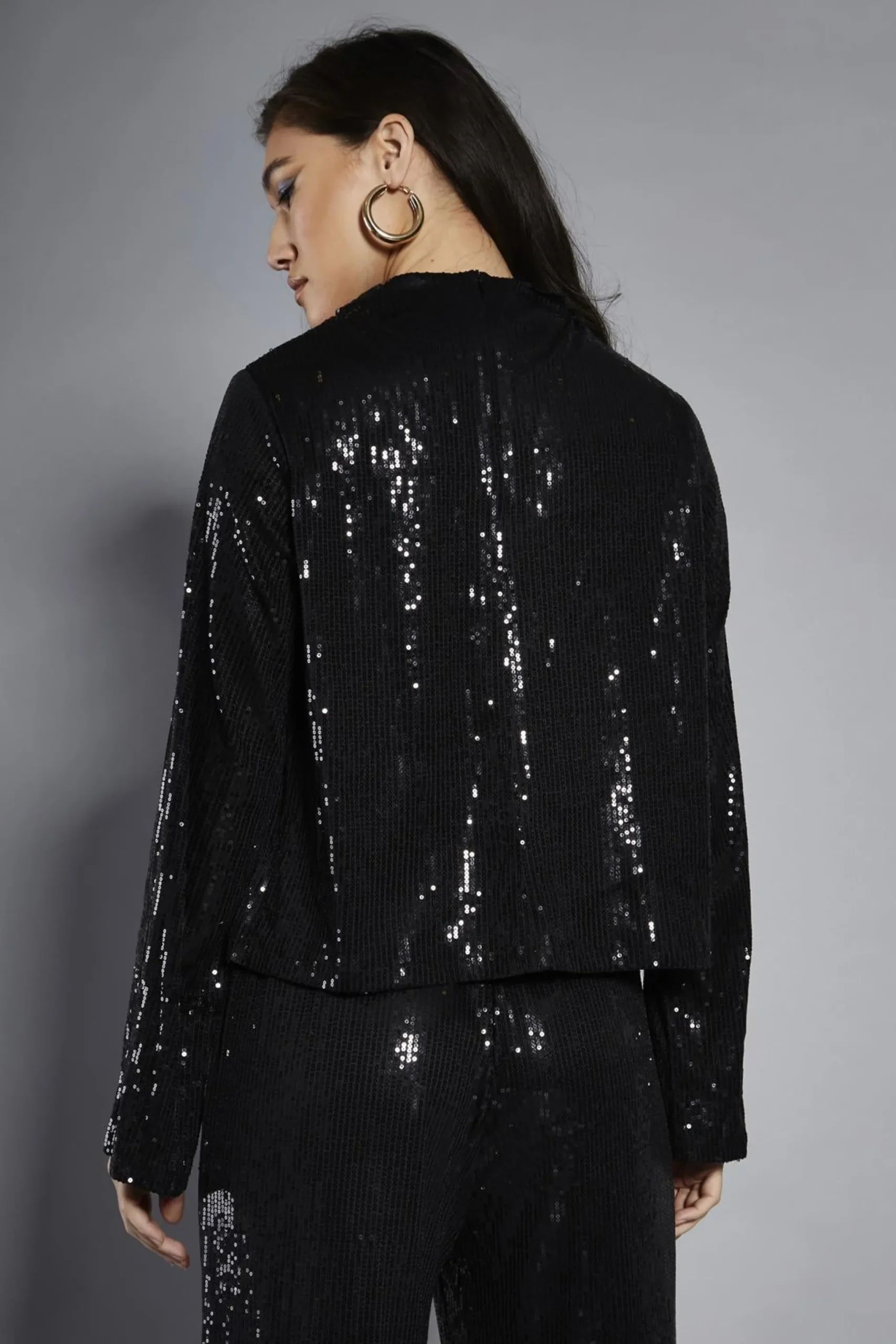 Glamorous Studio Women’s Black Sequin High-Neck Long Sleeve -Blouse . Shine bright in this stunning black sequin long sleeve blouse that’s perfect for any festive occasion. The high-neck design adds an elegant touch, making it a standout piece in your wardrobe. Each sequin catches the light beautifully, creating a dazzling effect that will turn heads wherever you go. The long sleeves offer just the right amount of coverage while keeping the look chic and sophisticated. A concealed zip fastening at the back ensures a smooth fit, allowing you to move with ease. This blouse pairs wonderfully with tailored trousers for a polished look or can be dressed down with your favourite jeans for a night out with friends. Add some statement earrings or a bold clutch to complete your outfit. Perfect for holiday parties, date nights, or any event where you want to make a memorable impression, this black sequin blouse is all about bringing a little sparkle into your life while keeping you stylish and comfortable.