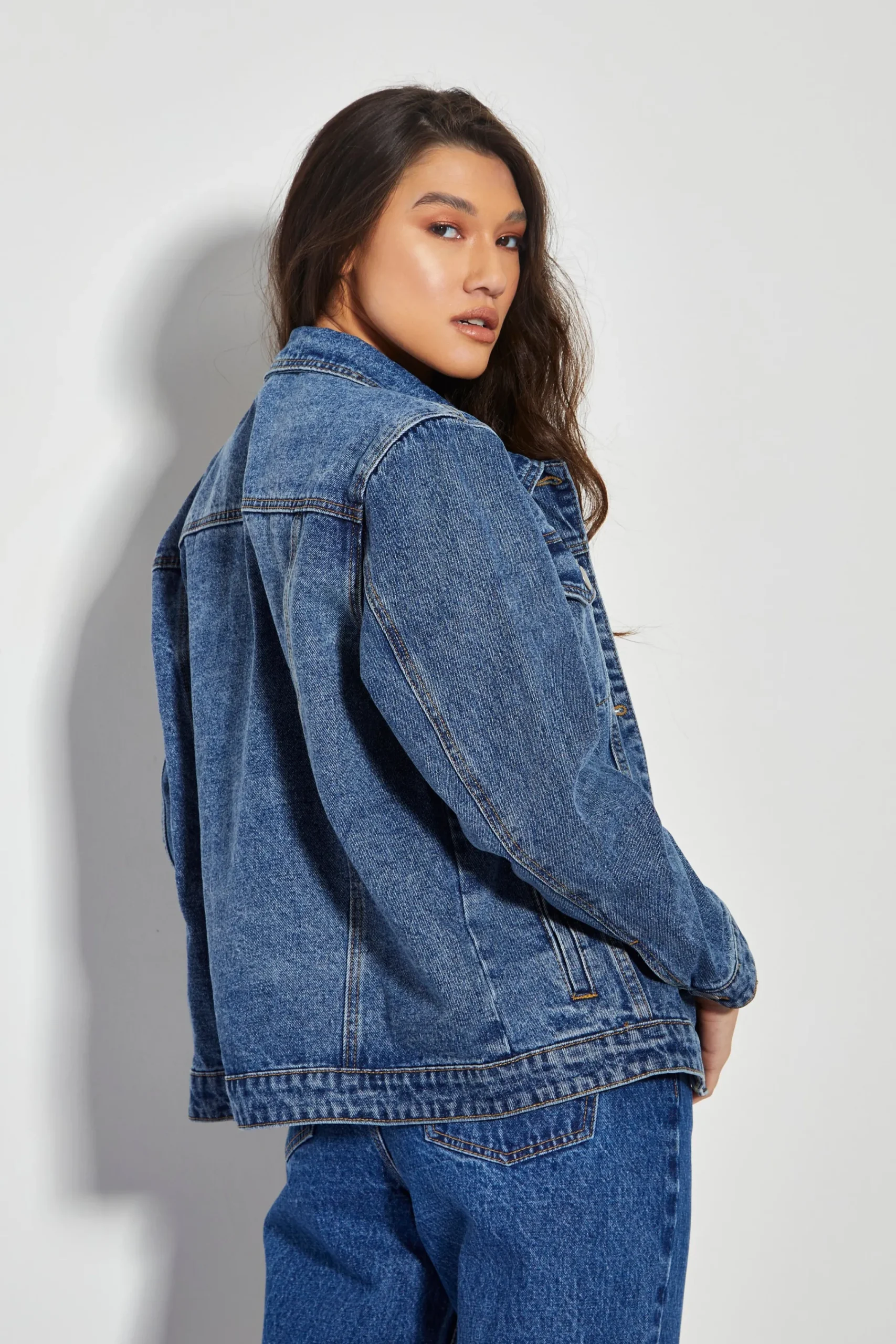 Glamorous Mid Stone Denim Jacket. You can always rely on our cropped denim mid stone jacket. This classic dark blue option looks double the fun paired with jeans.