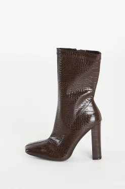 Glamorous Women’s Brown Croc Calf High Heeled Boot Wide Fit. Make a statement in these daringly stylish Croc Print Boot Boots. Perfect for adding a touch of height and attitude to your look. Featuring a concealed zip fastening, regular fit, block heel and pointed toe. Get ready for a wild night out!