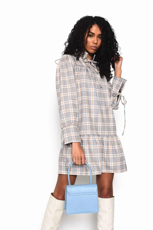 Glamorous Light Blue Multi Check Tiered Mini Dress with Neck Ruffle. This mini dress will have you feeling and looking your best. Featuring a gathered tiered design, with a high neck ruffle and tie, this dress is super flattering addition to your closet! Elevate the look with some knee high boots and a cute strappy bag for a on trend vibe.
