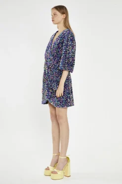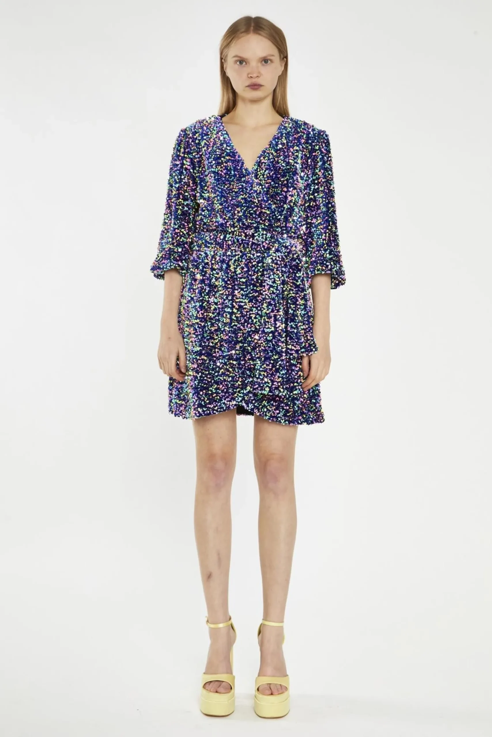 Glamorous Women’s Navy Multi-Sequin Wrap Mini-Dress. Dazzle in our Navy Multi-Sequin Wrap Mini-Dress. This eye-catching piece features a captivating sequin velvet fabric that shimmers and shines, turning heads wherever you go. The wrap design creates a flattering, figure-hugging silhouette, while the puff sleeves add a touch of drama. The mini length keeps things flirty and fun, perfect for a night out on the town. The fully lined construction ensures a smooth, comfortable fit, so you can dance the night away with confidence. Pair this statement dress with your favourite heels and accessories for a night out, or dress it down with ankle boots for a more casual vibe. Get ready to feel fabulous and make a lasting impression.