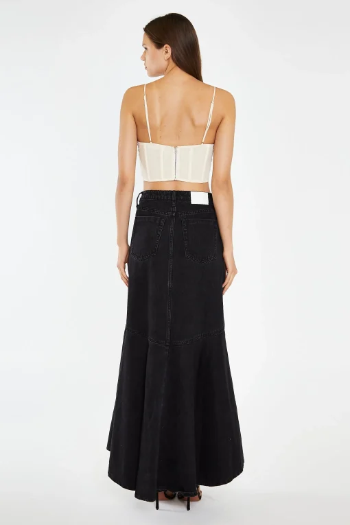 Glamorous Womens Washed Black Denim Fishtail Maxi-Skirt. Upgrade your denim game with our Washed Black Denim Fishtail Maxi-Skirt! The perfect mix of stylish and playful, this skirt features a fishtail silhouette and maxi length for a unique twist on a classic look. Made with washed black denim for a cool and comfortable fit. Say goodbye to boring skirts and hello to effortless style!