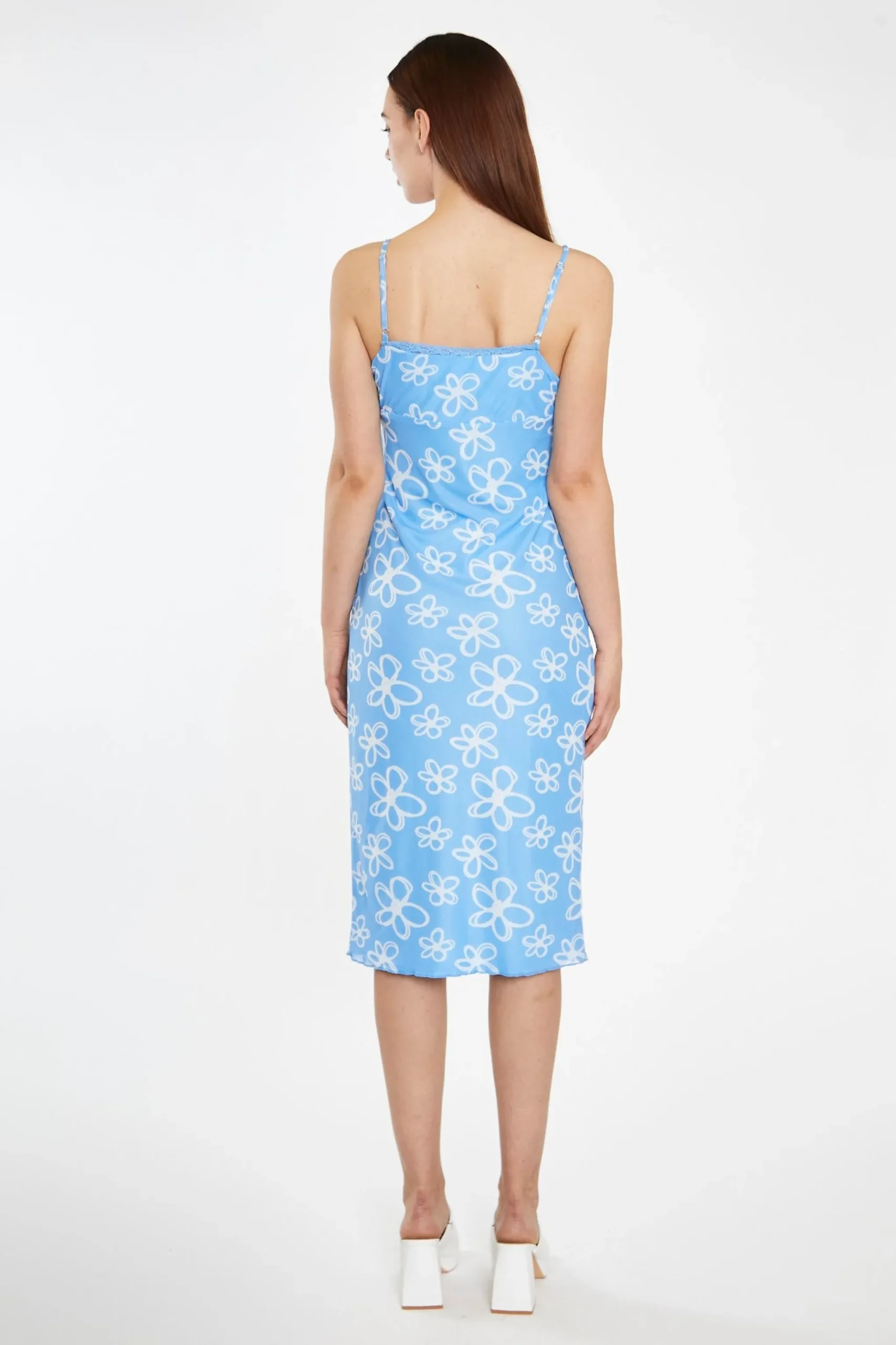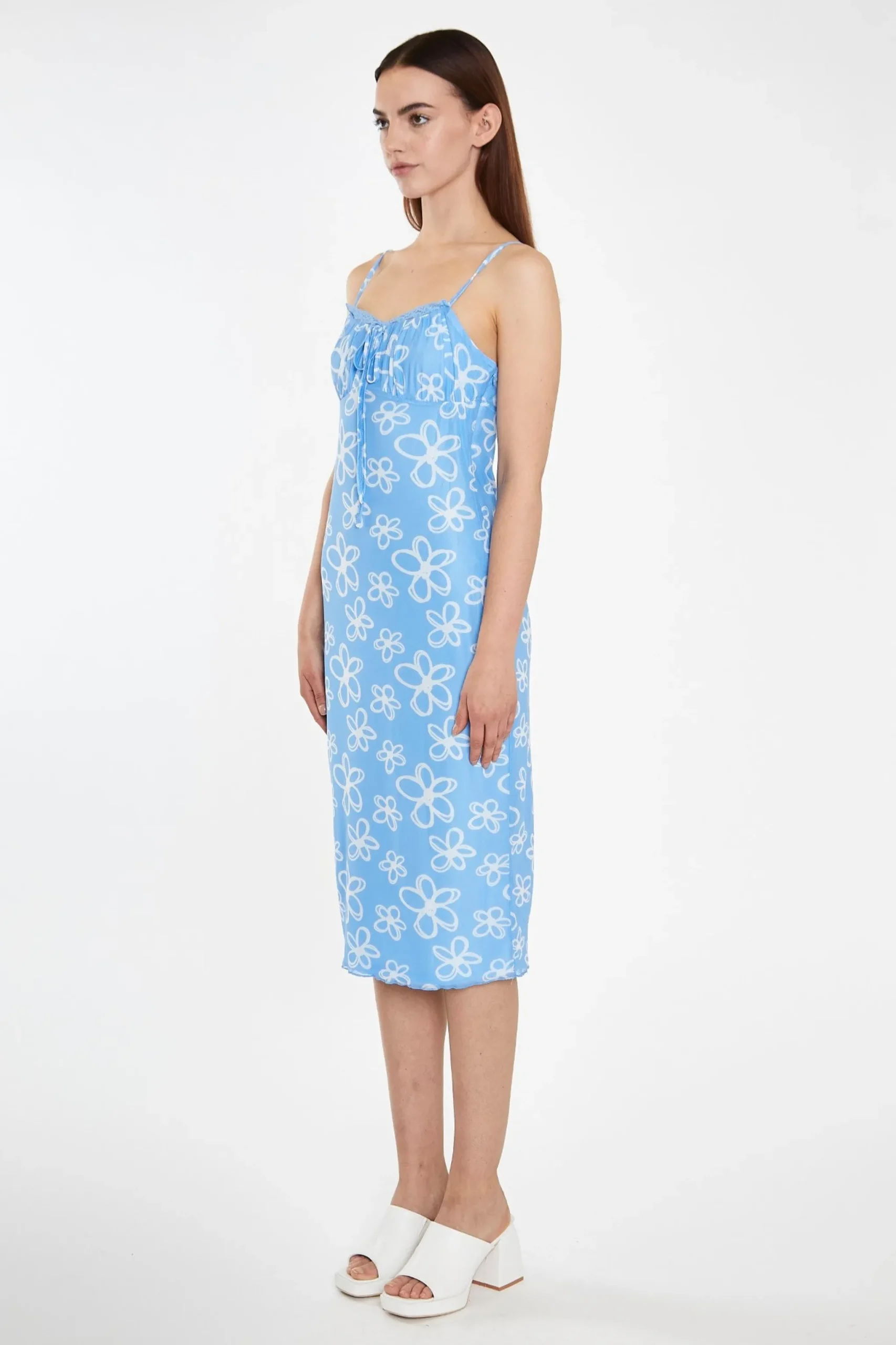 Glamorous Womens Blue Scribble-Daisy Mesh Strappy Gathered-Bust Midi-Dress. This Midi dress is giving us all the summer feels! Featuring an on-trend gathered bust design, bias-cut fit and midi length, this mesh dress will not fail you! Dress down with trainers for a relaxed chic daytime look, or dress it up with heels and a cute cardigan, you will not fail to impress!