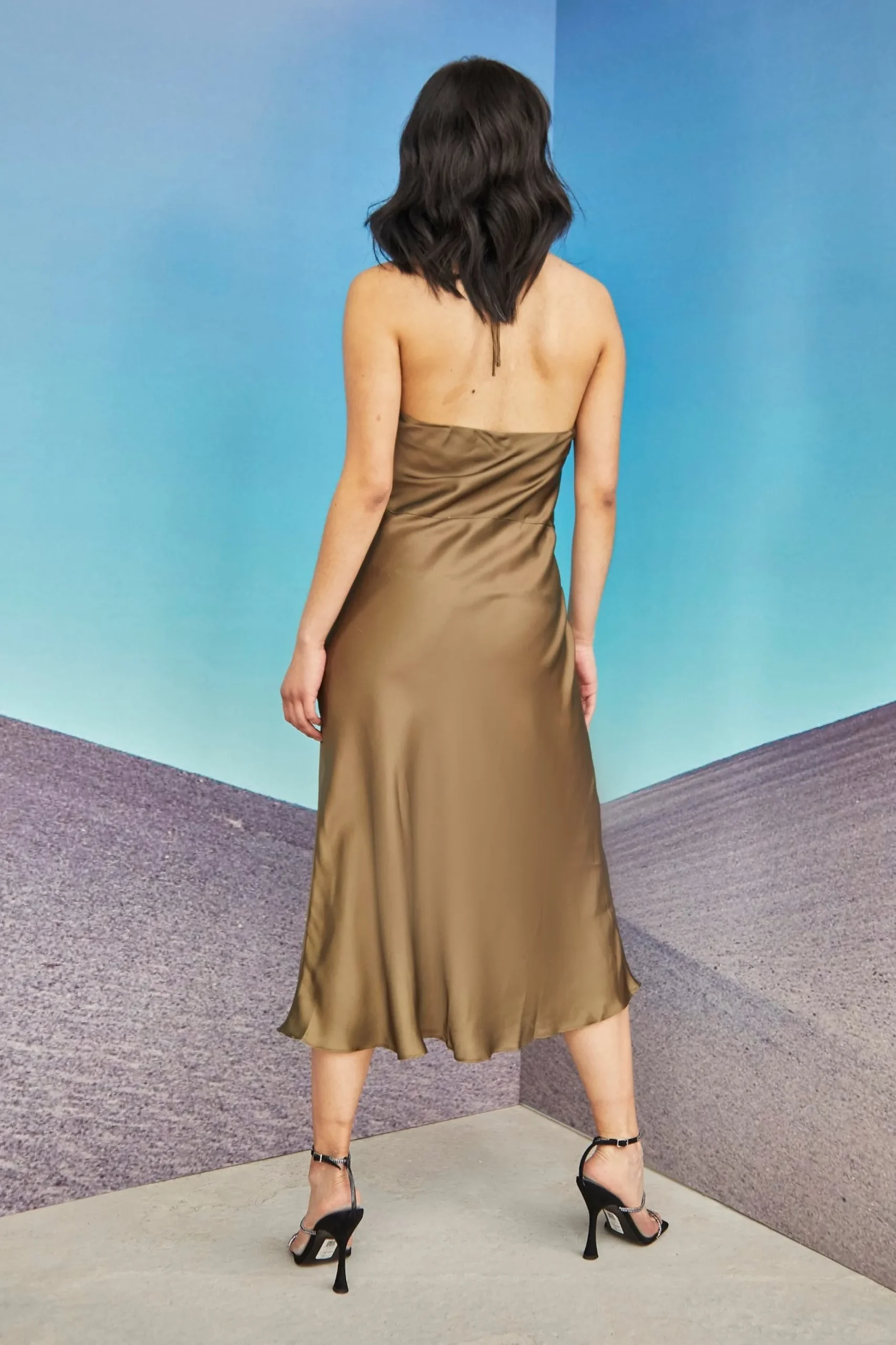 Glamorous Care Khaki Satin Cowl Neck Midi Dress We cant get enough of this midi dress featuring a super on trend flattering fit. Join our positive journey towards reducing the impact that fashion has on our planet by styling this with some heels for the evening or trainers for the daytime for the perfect environmentally friendly look.