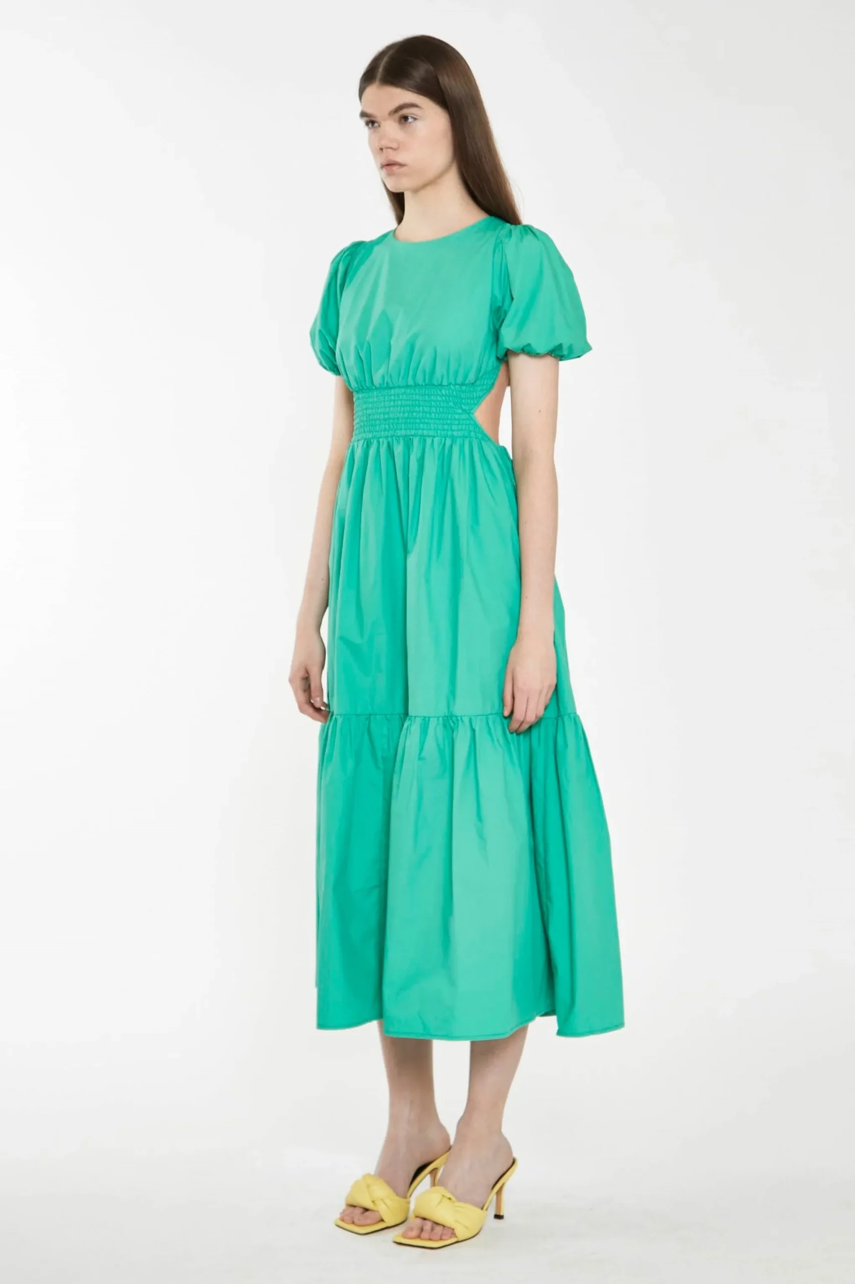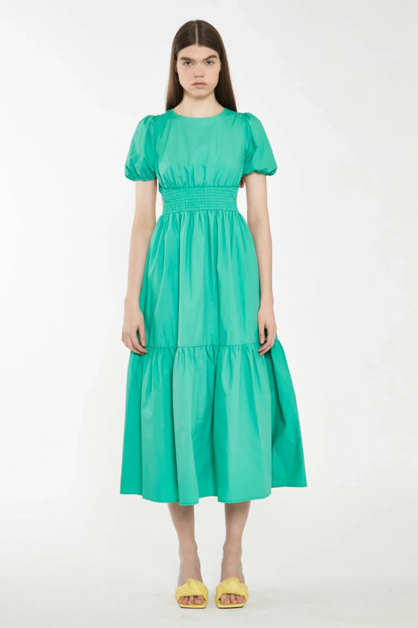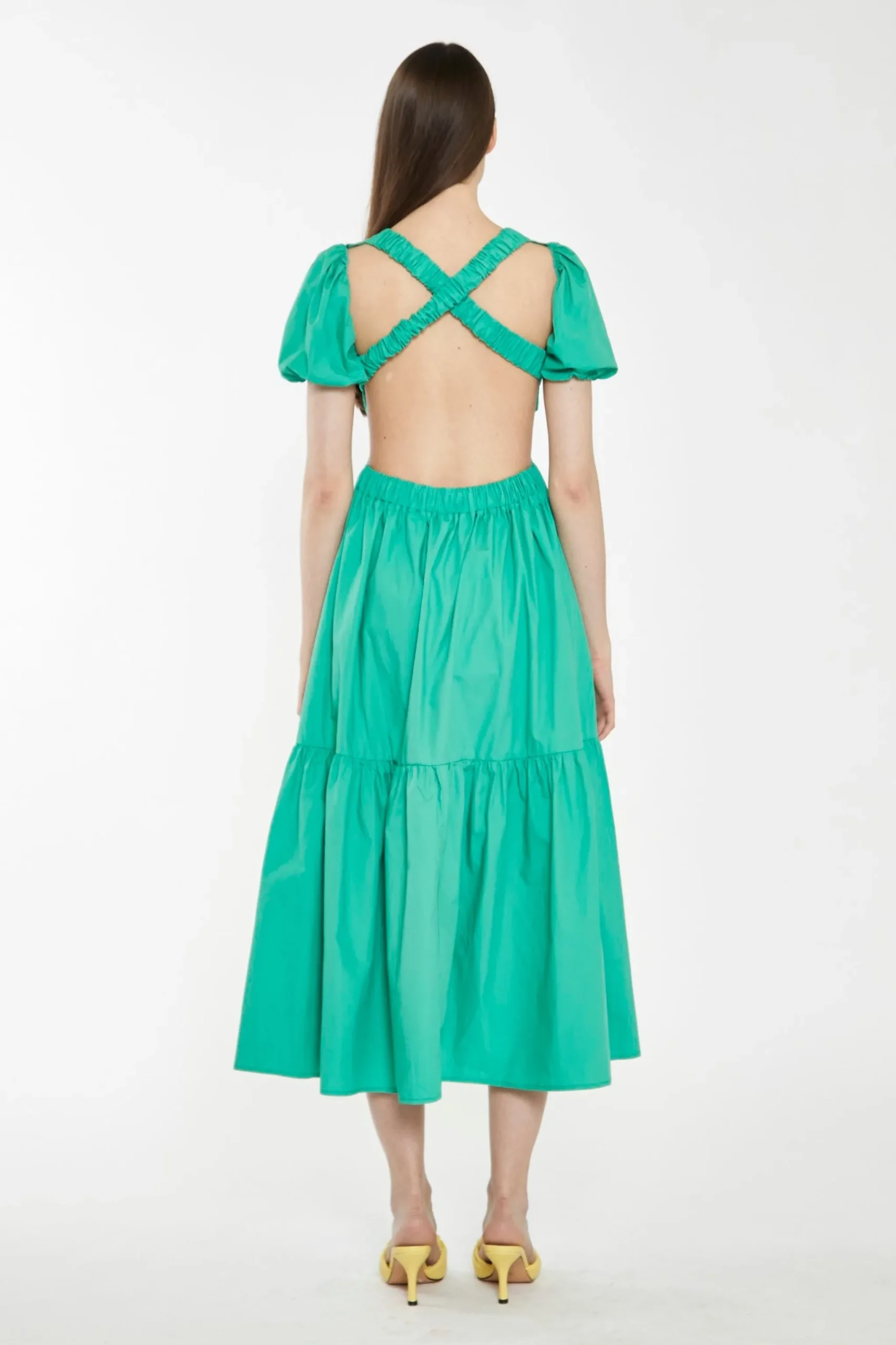 Glamorous Womens Holly Green Open-Back Maxi Dress. This gorgeous maxi dress will have you feeling and looking your best. Featuring puff sleeves and open back detail in a flattering tiered fit, this dress wont fail to impress! Style with some mule sandals for the perfect Spring look.