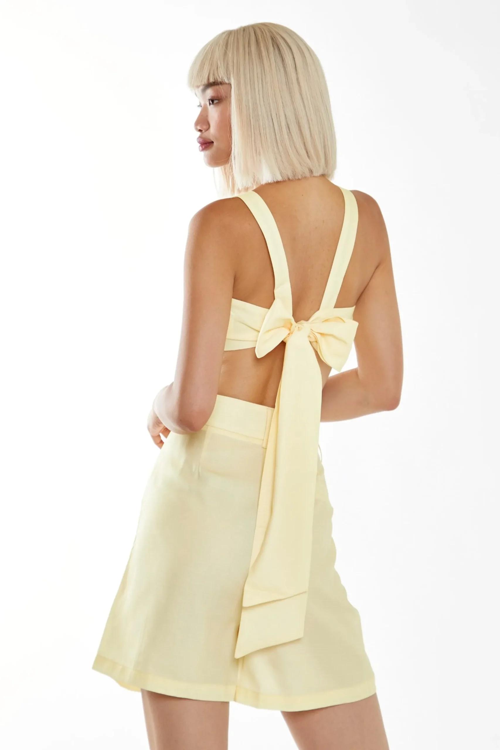 Glamorous Care Womens Pale Yellow Tie Back Crop-Top. Looking for something playful and eco-friendly? Get the Tie Back Crop Top and Matching Shorts, made of 100% recycled polyester and great for any summer activity. Style with some platform mules for a super cute summer outfit!