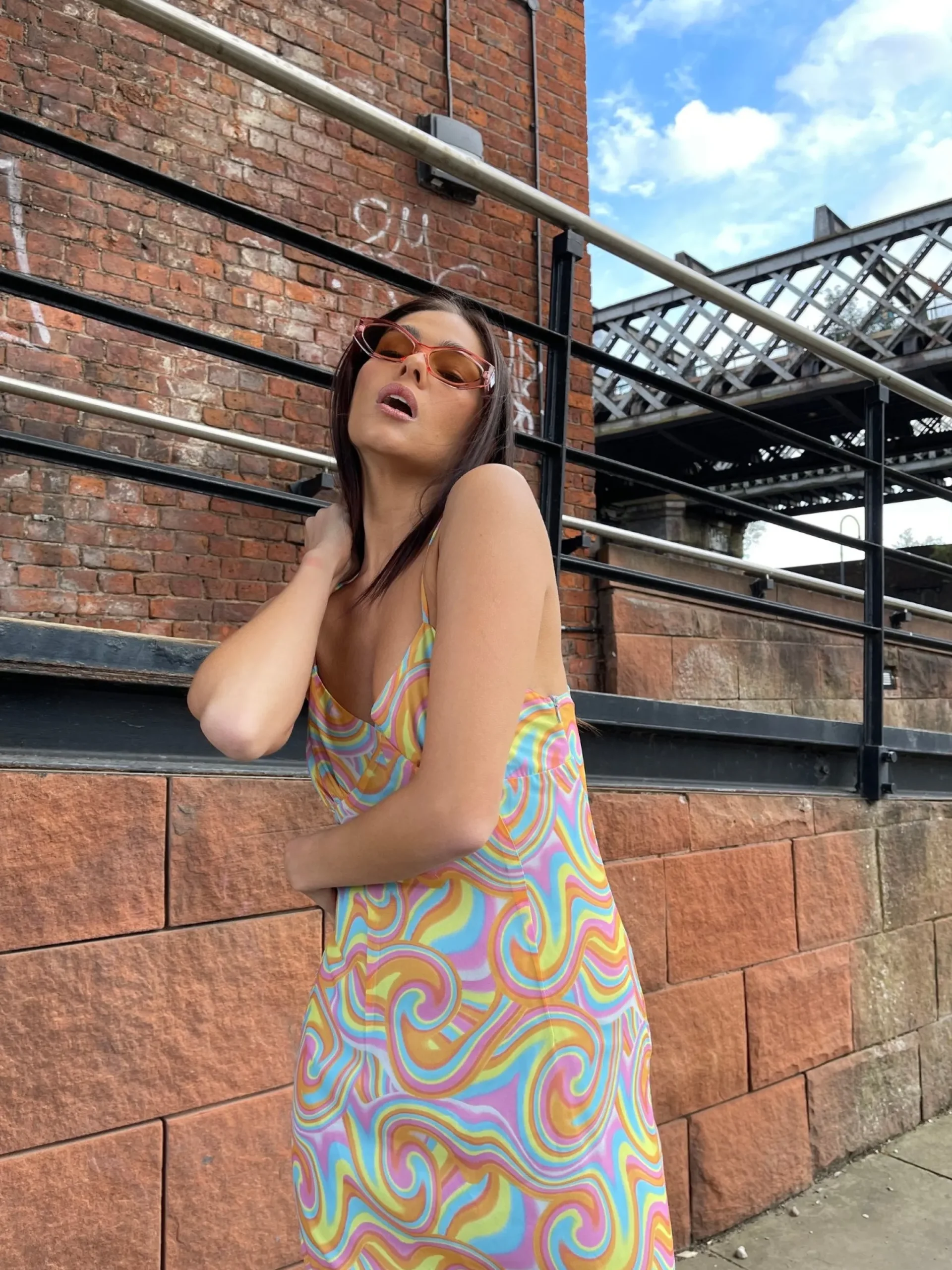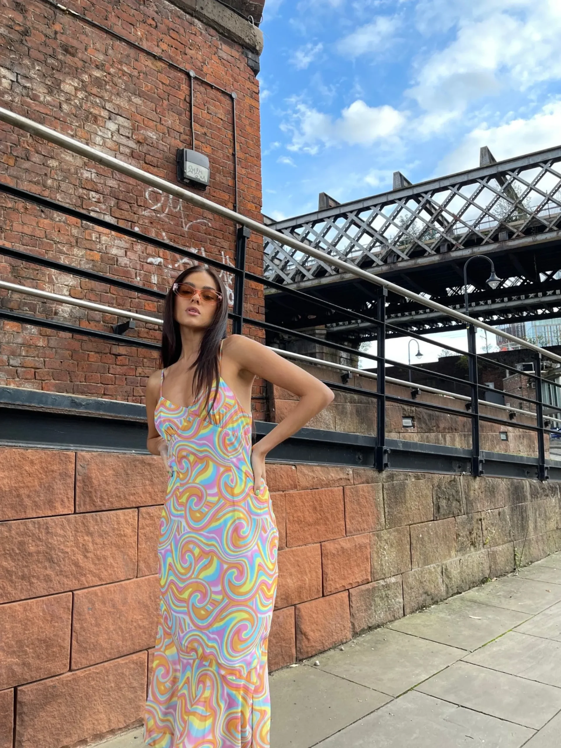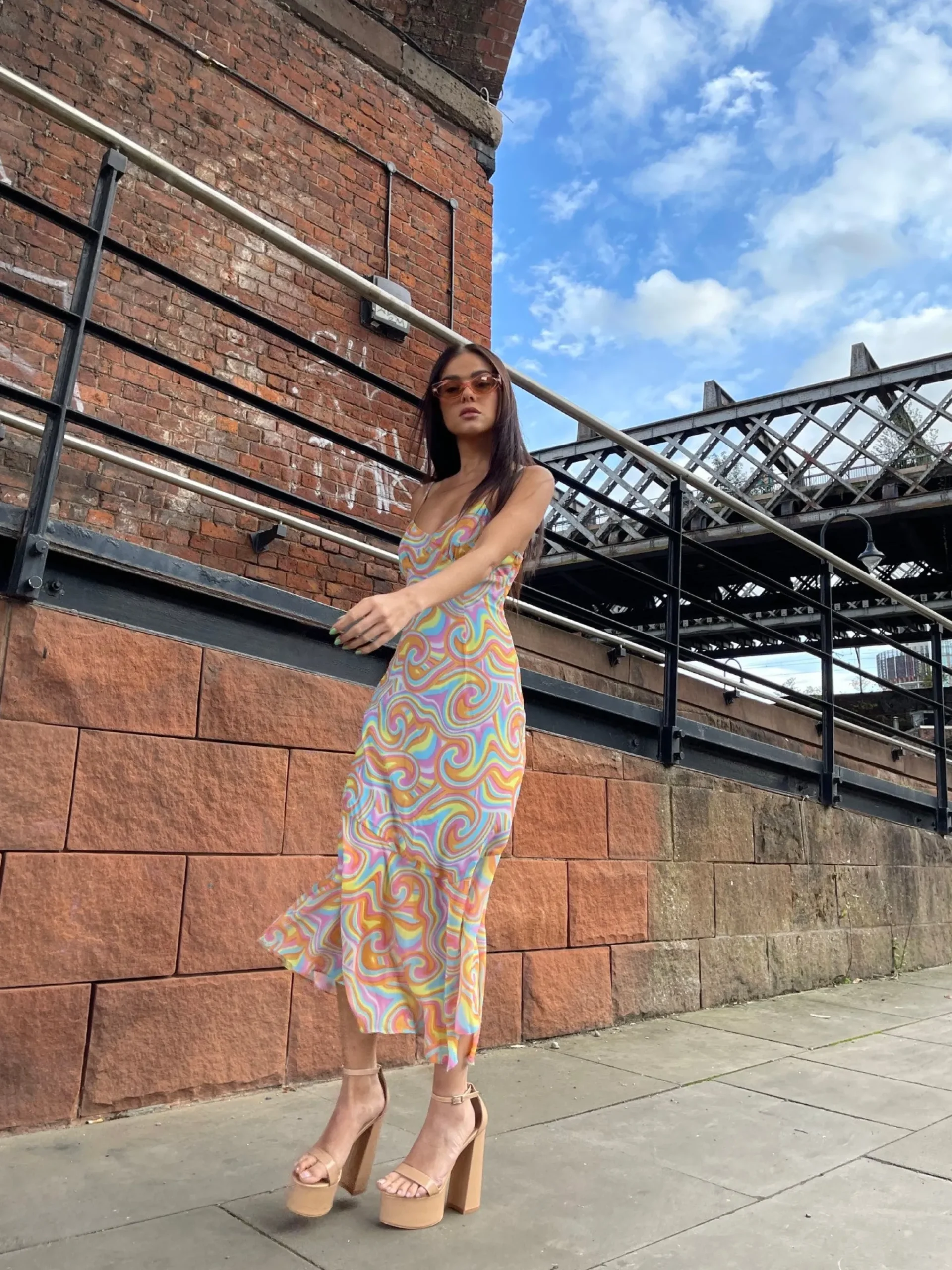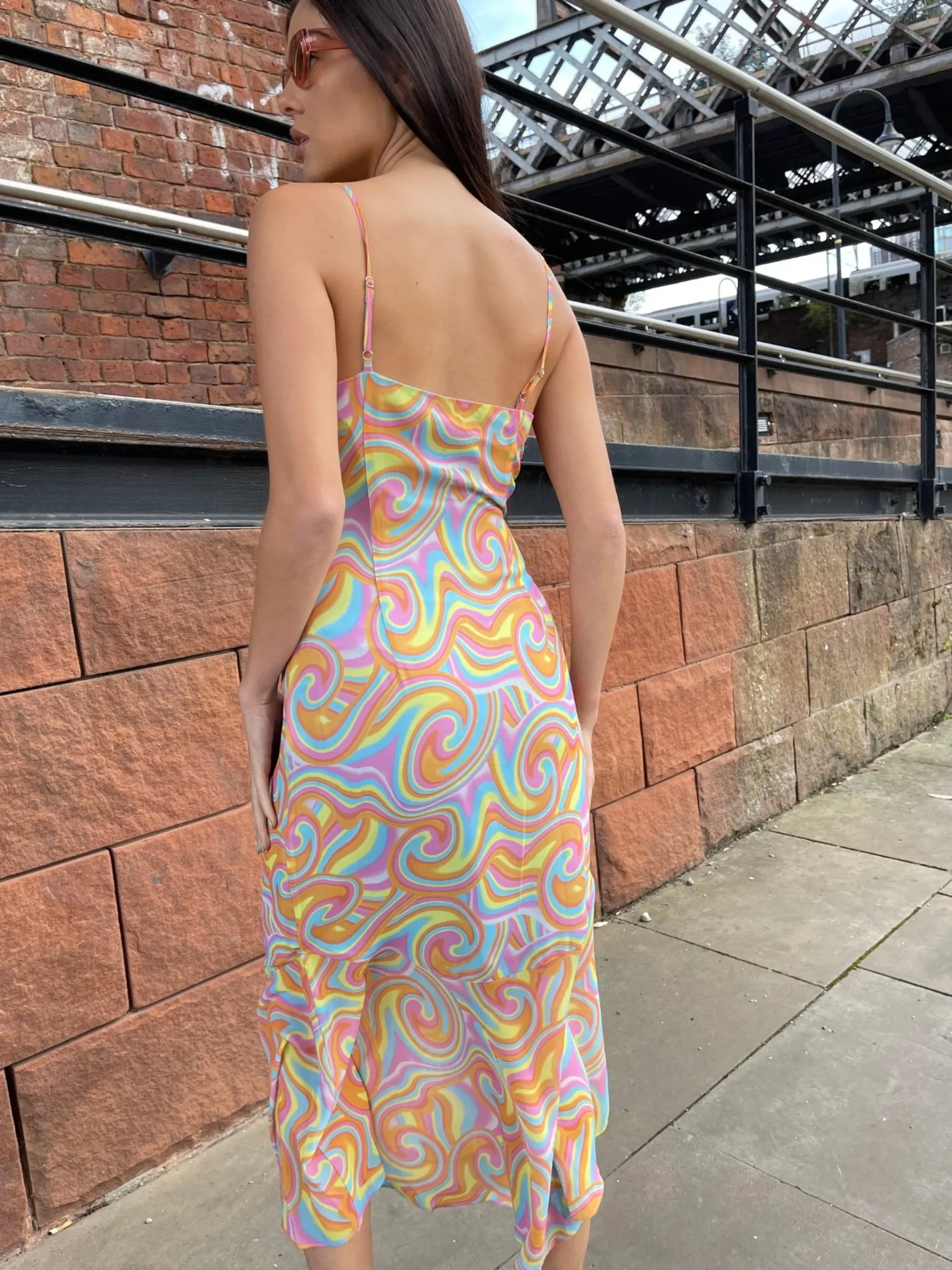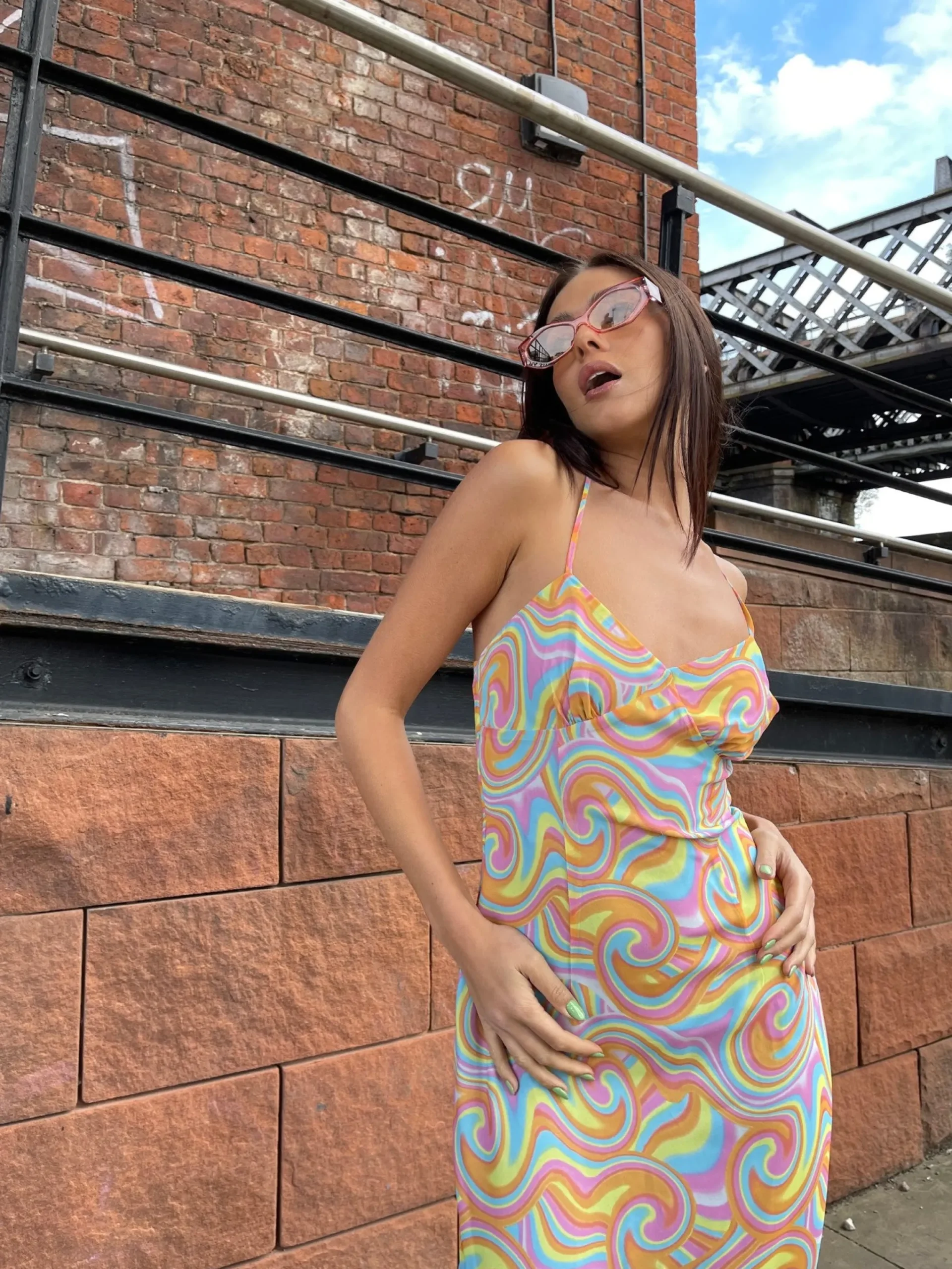 Glamorous Women’s Rainbow Swirl Asymmetric Hanky Hem Midi-dress. Get yourself ready to swirl, twirl and smile with this new design! Our asymmetric hanky hem midi dress bursts with personality and style, featuring a rainbow swirl print, gathered bust details, and a flirty midi length that’s sure to turn heads.