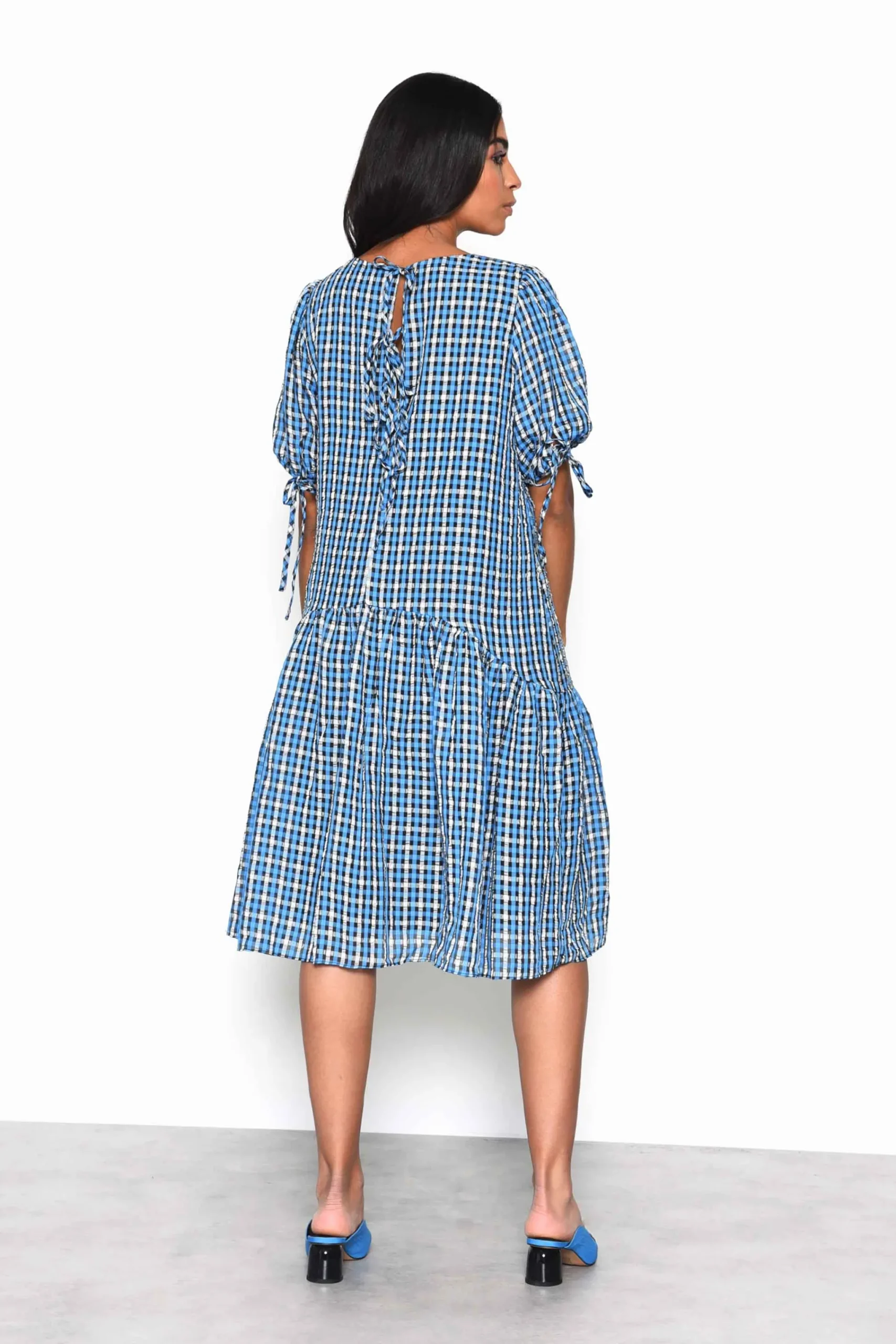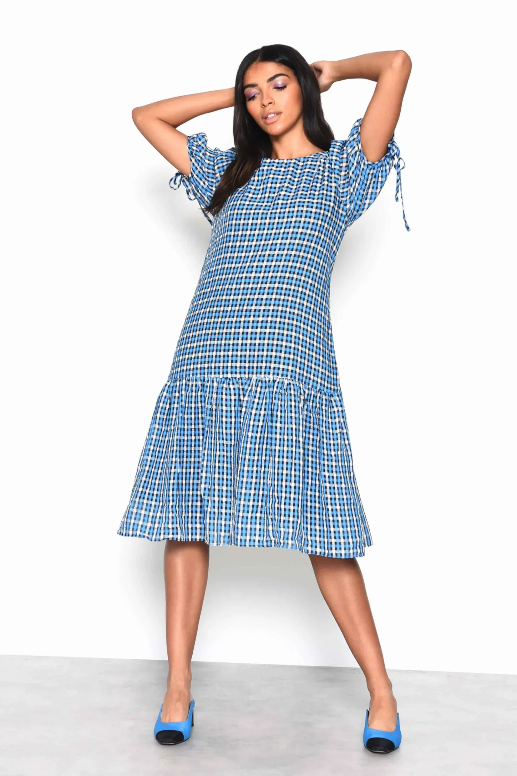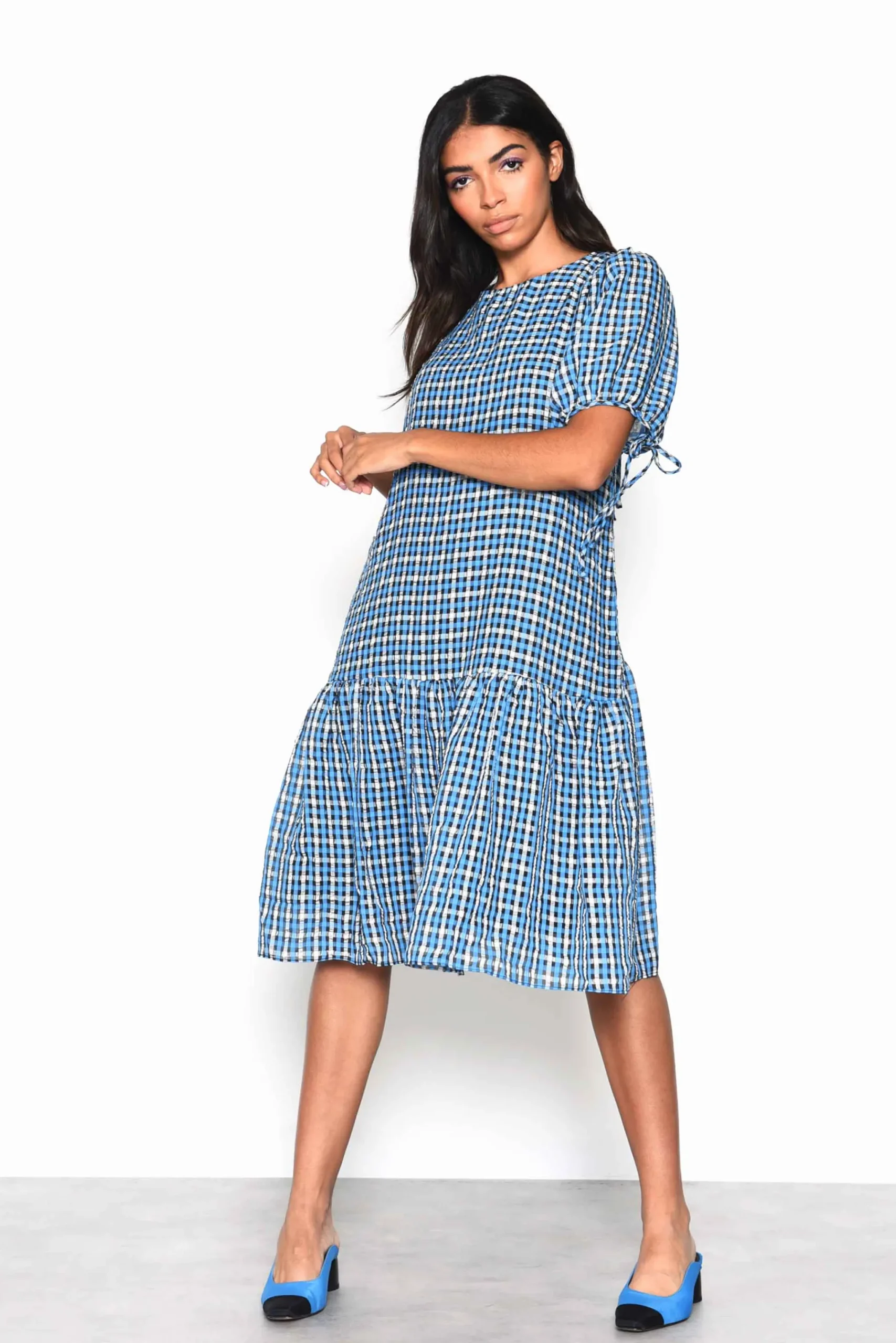 Glamorous Blue Multi Check Tiered Midi Dress with Puff Sleeves and Tie Back Detail. This midi dress is perfect for the upcoming autumn season. Featuring a tiered skirt design, tie back detailing and a flattering fit, this puff sleeve midi dress is destined for your wardrobe! Looks great teamed with chunky boots or dressed up with your favourite heels for cocktails with the girls.