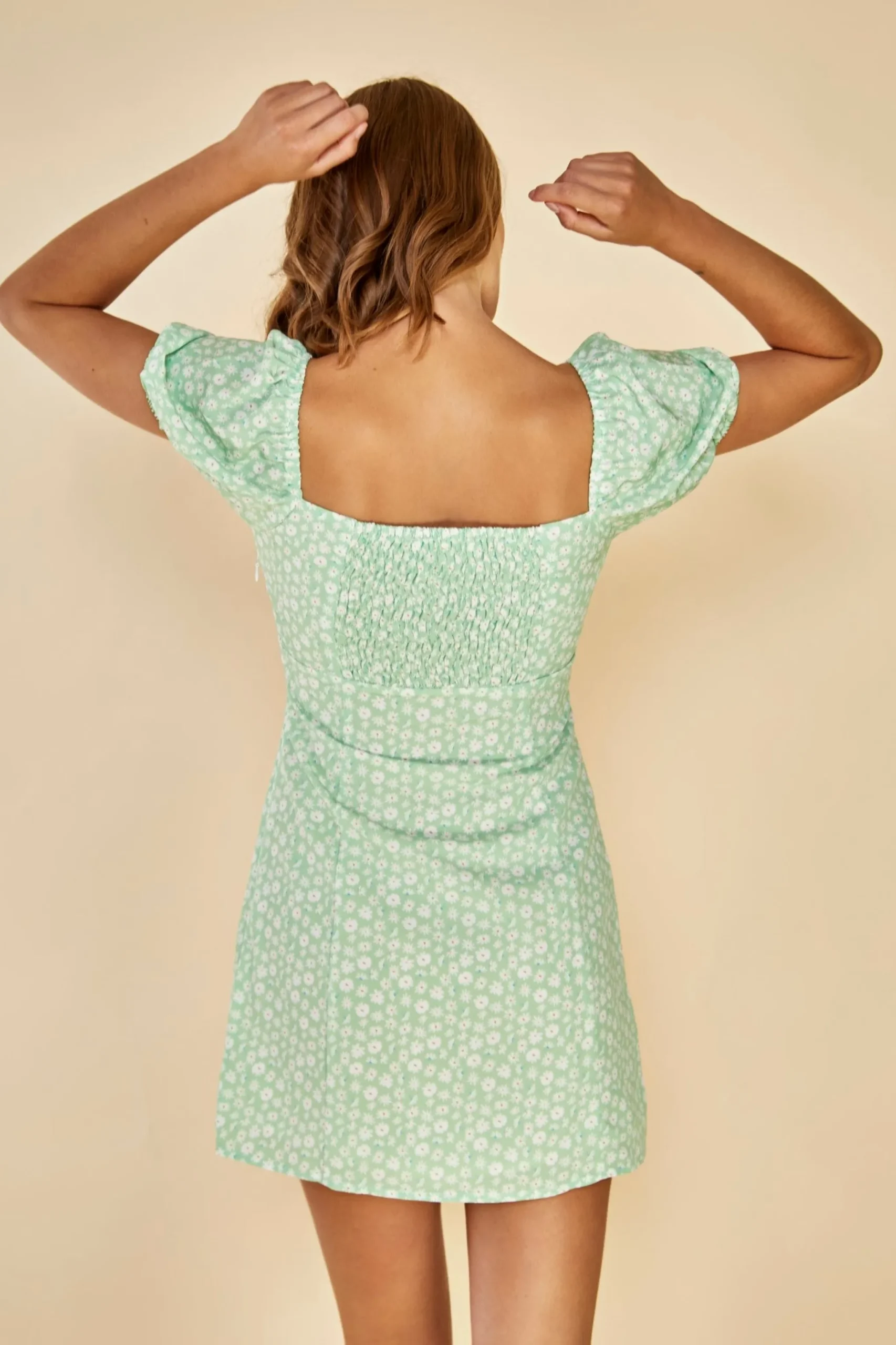 Glamorous Care Green Ditsy Flower Tie Front Empire Line Mini Dress. We love this cute empire mini dress here at Glamorous! Featuring a front tie detail, puff sleeves and smocked back panel, this dress is super flattering addition to your closet! This fashion forward sustainable look will have you turning heads wherever you go.