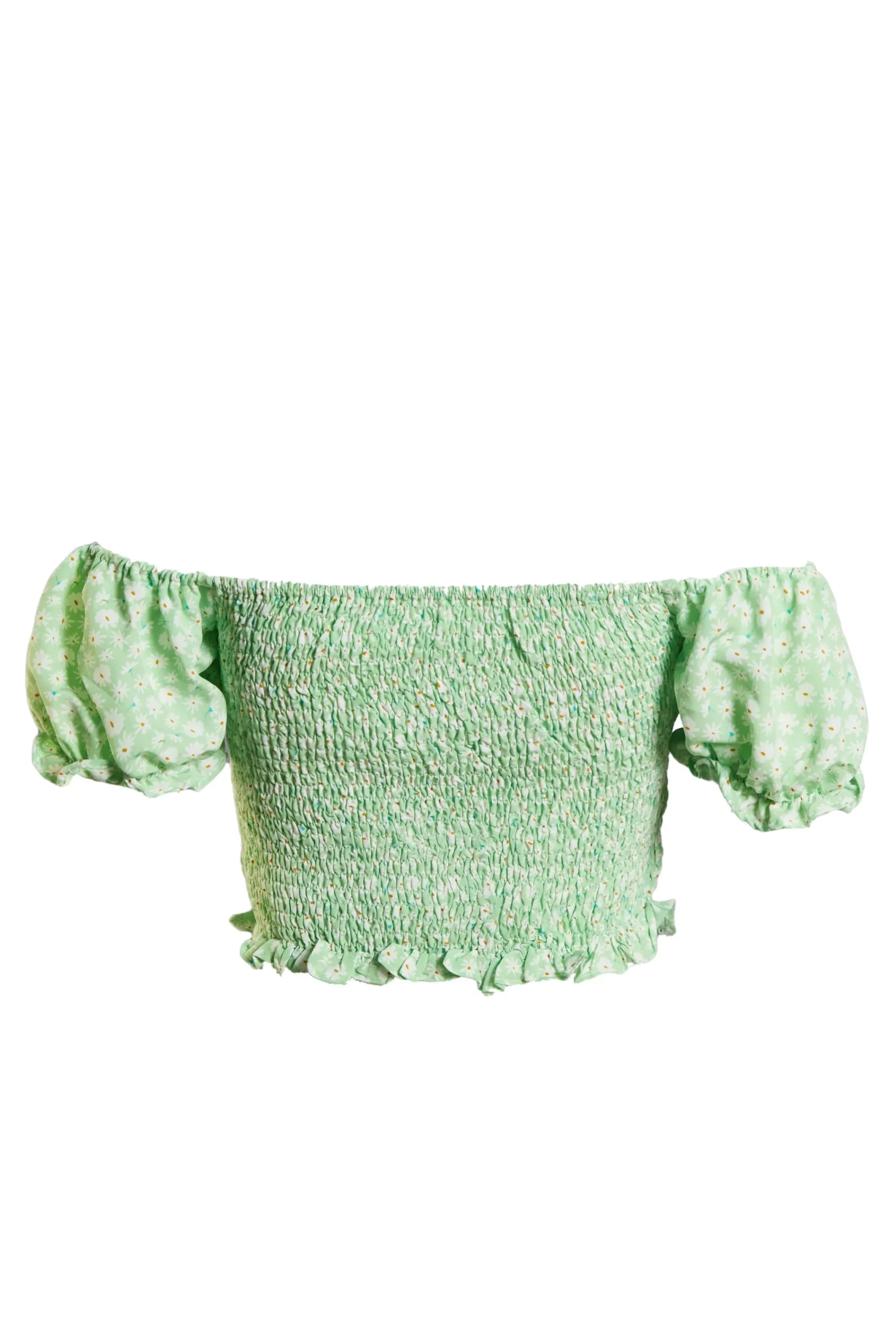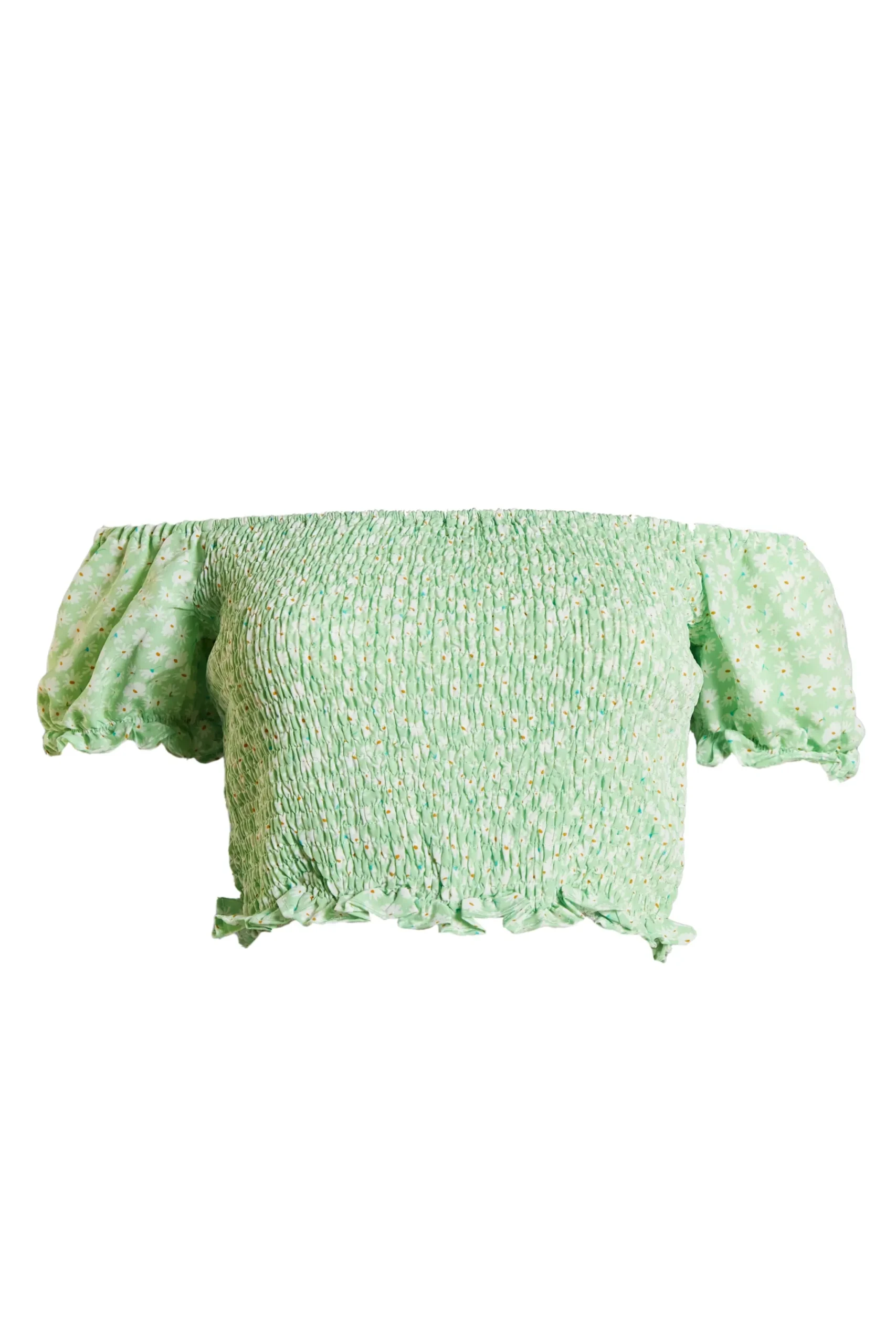 Glamorous Care Green Ditsy Flower Smocked Bardot Top with Puff Sleeves. This smocked crop top will have you feeling and looking your best. Featuring a bardot style neckline and puff sleeves, we love this sustainable piece here at Glamorous. Pair with the matching skirt and chunky sandals for an effortless daytime luxe look.