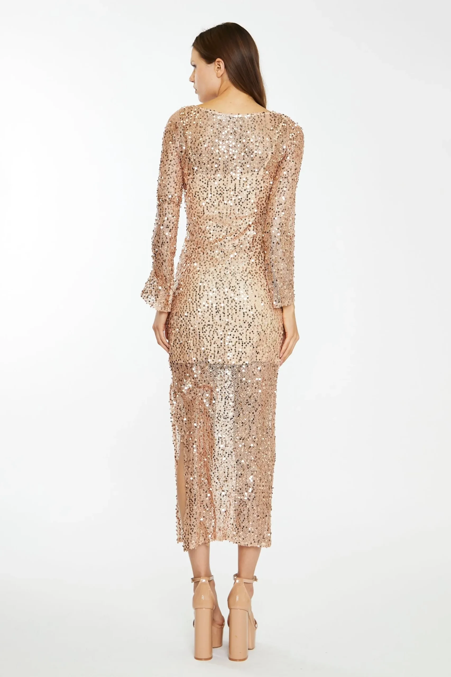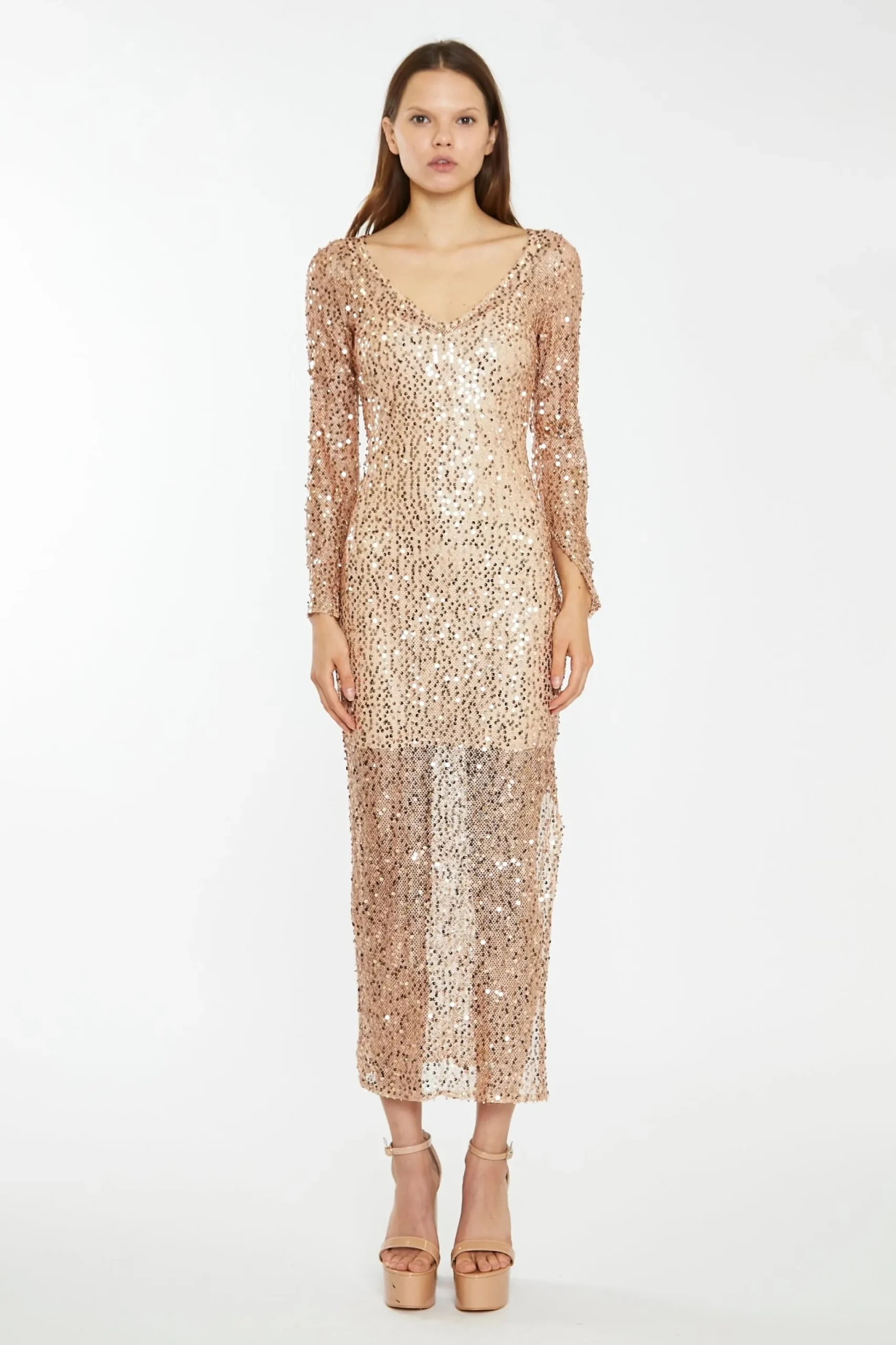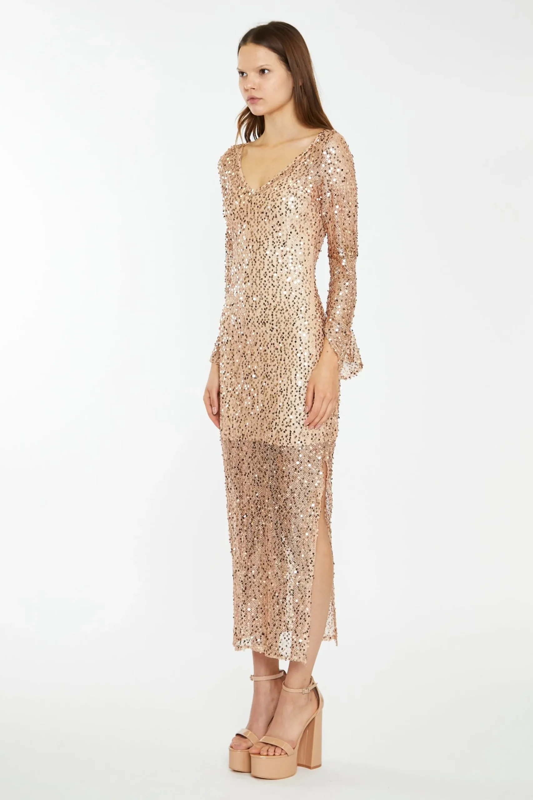 Glamorous Womens Rose-Gold Sequin Mesh V-Neck Maxi-Dress. This maxi dress is so glam! Featuring a v-neckline and flared sleeves, the sequin mesh maxi dress is a must have for all your party plans! Styles with some sleek stilettos for a chic evening look!