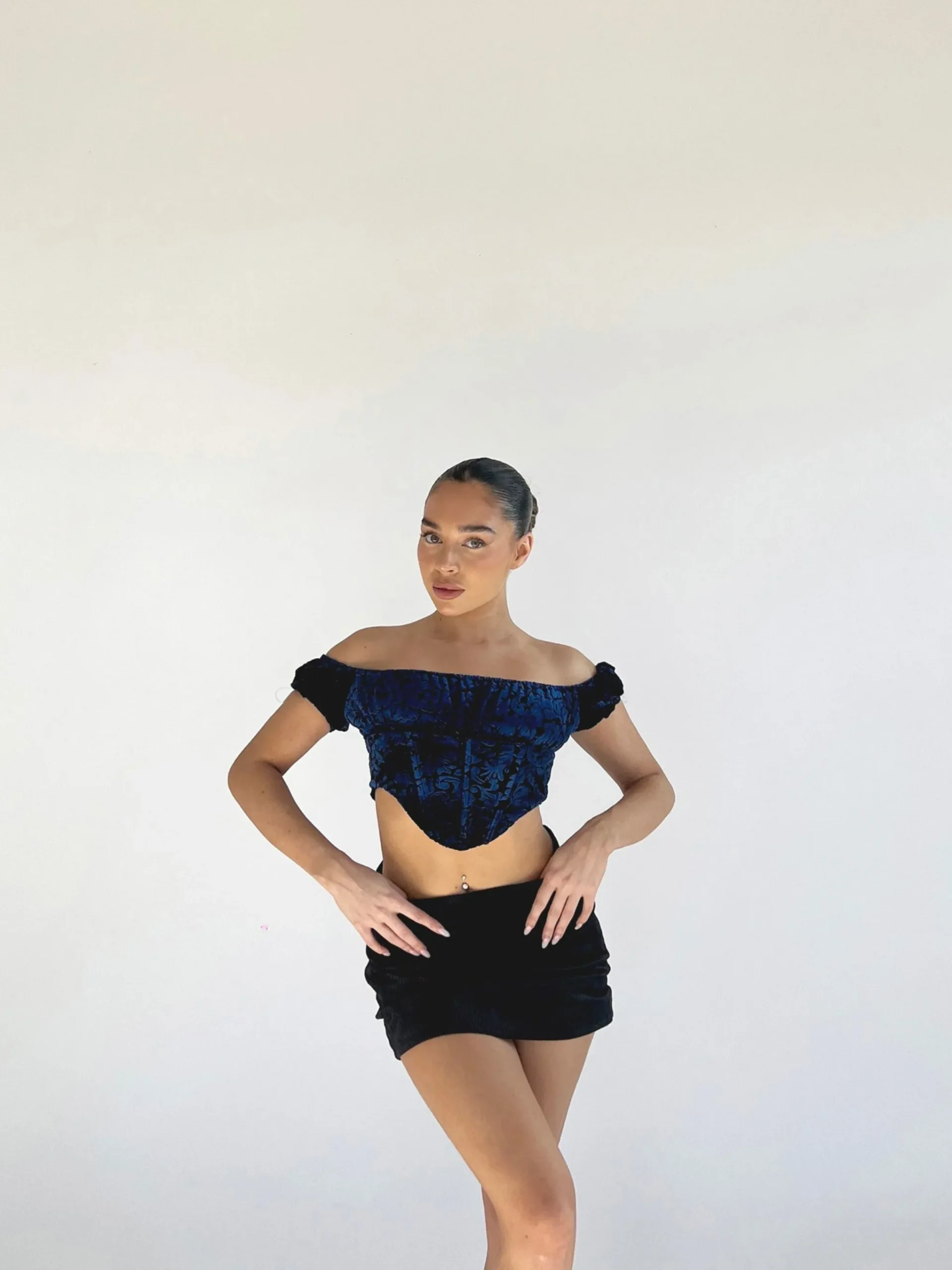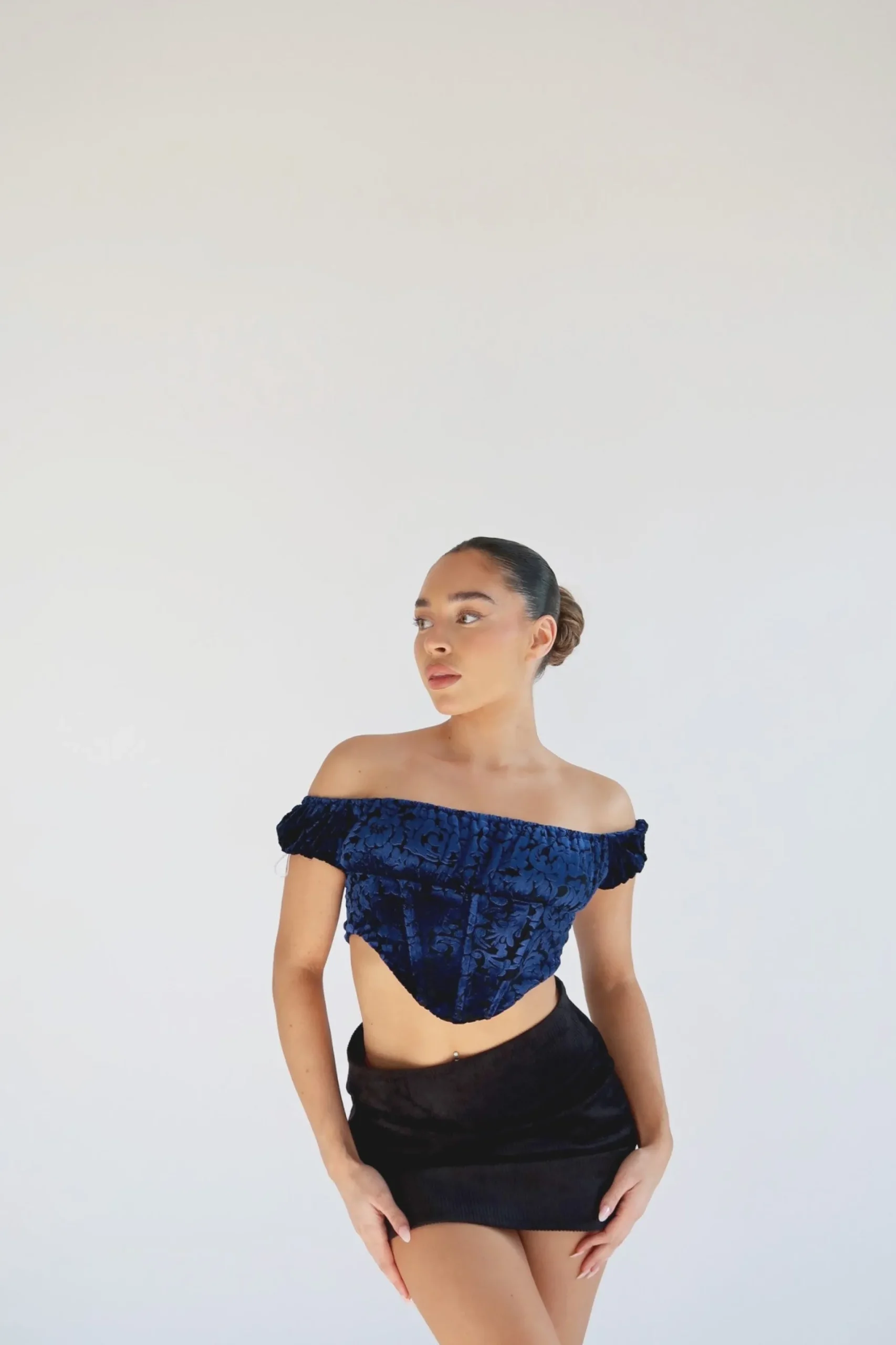Glamorous Womens Blue Floral-Devore Milkmaid Corset Top. This corset crop top is such a standout piece! Featuring a corset style boned structure and milkmaid shape, all in a gorgeous blue devore fabric, you will want to wear this top again and again! Wear this with a cute micro skirt for a trendy night out look, or more casually with some wide leg jeans, you can not go wrong!