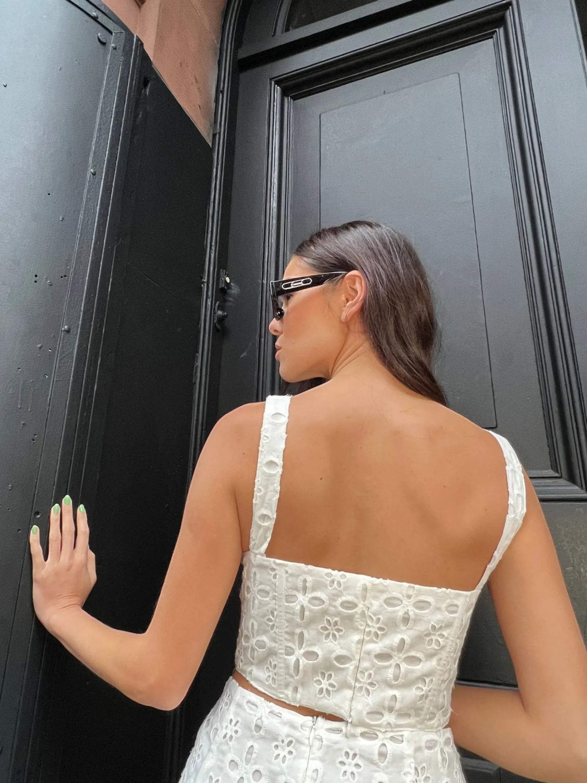 Glamorous Womens White Broderie Lace-up Corset -Top. Dress to impress in our White Broderie Lace-up Corset-Top! With its boned corset style and eye-catching lace-up design, youll look so on trend! Style with the matching skirt for a summer perfect co-ord look!