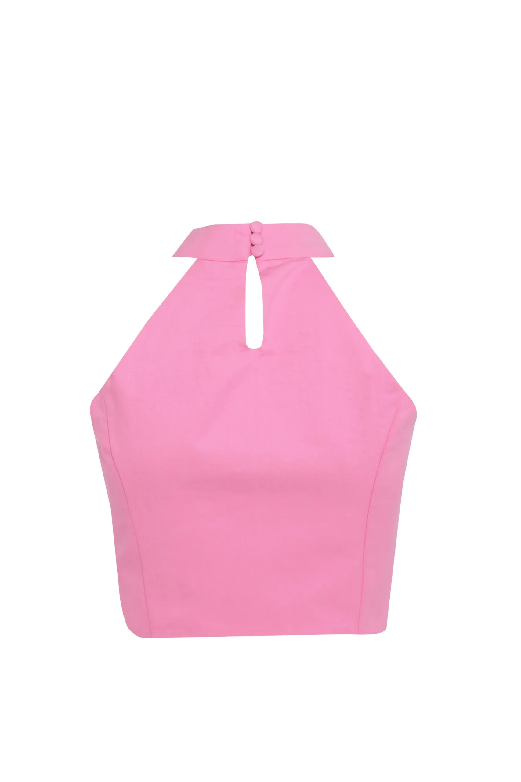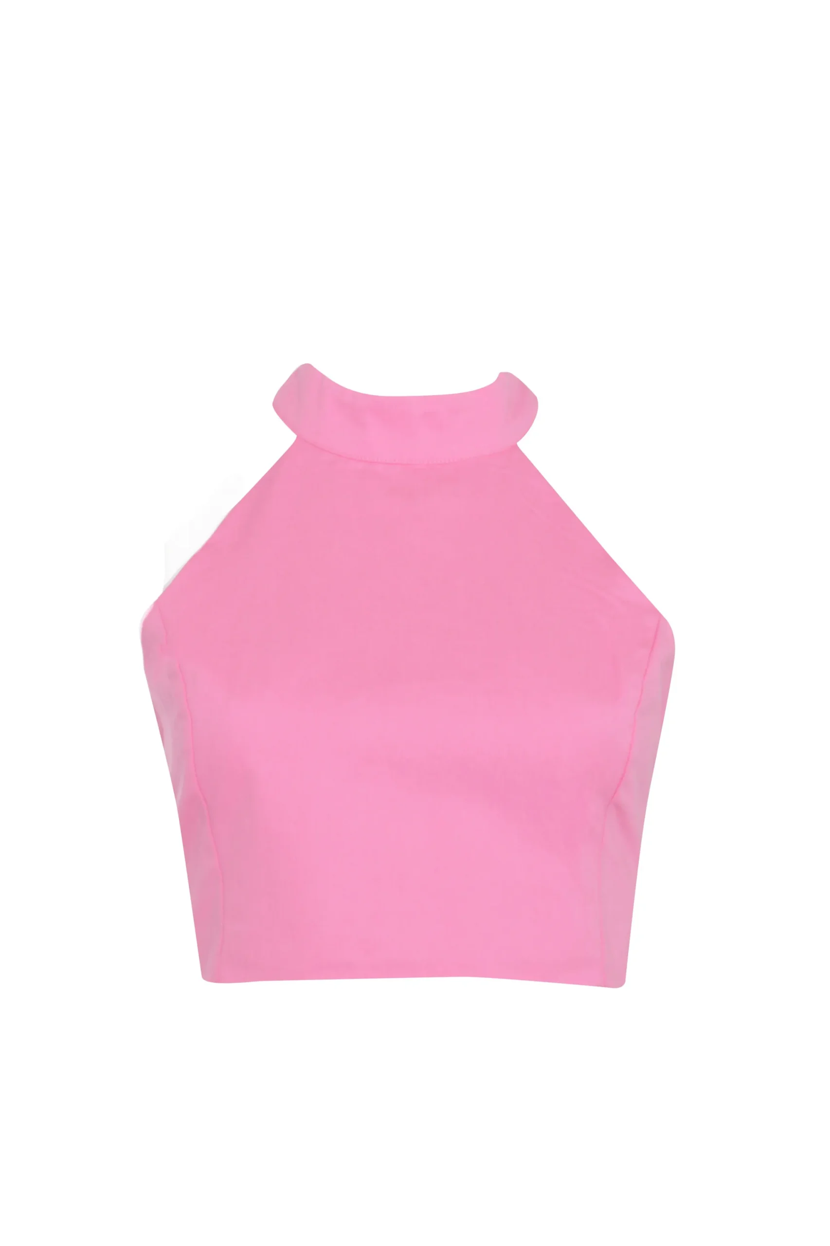 Glamorous Pink Carnation High Neck Crop Top. Refresh your wardrobe with this super cute crop top in this seasons must have colour, bright pink! Featuring high neck halter neck shape and crop length, looks great teamed with the matching mini skirt. Style with strappy sandals for long summer days or dress up with statement heels and a clutch for elevated evenings.
