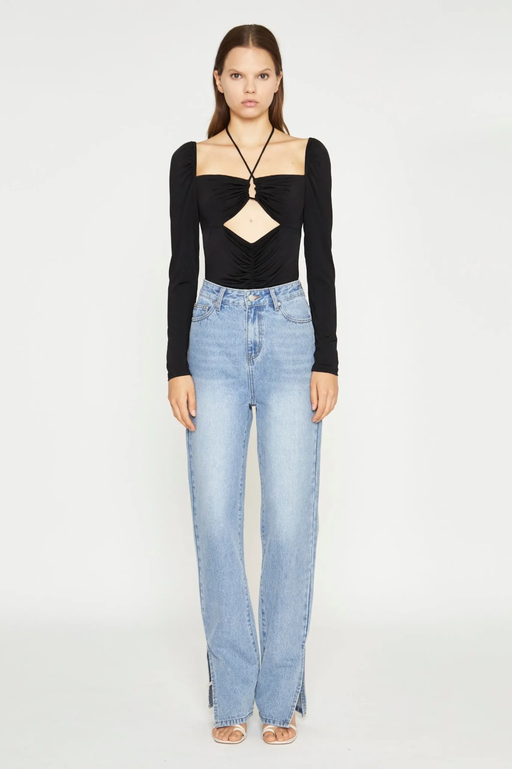 Glamorous Womens Black Long Sleeve Cut-Out -Bodysuit. Our Black Long Sleeve Cut-Out Bodysuit offers a figure-flattering fit thats perfect for any occasion. With a halterneck strap and cut-out details, youll feel both comfortable and stylish. Super versatile, you can pair this bodysuit with anything to elevate your look and create and instantly trendy outfit!
