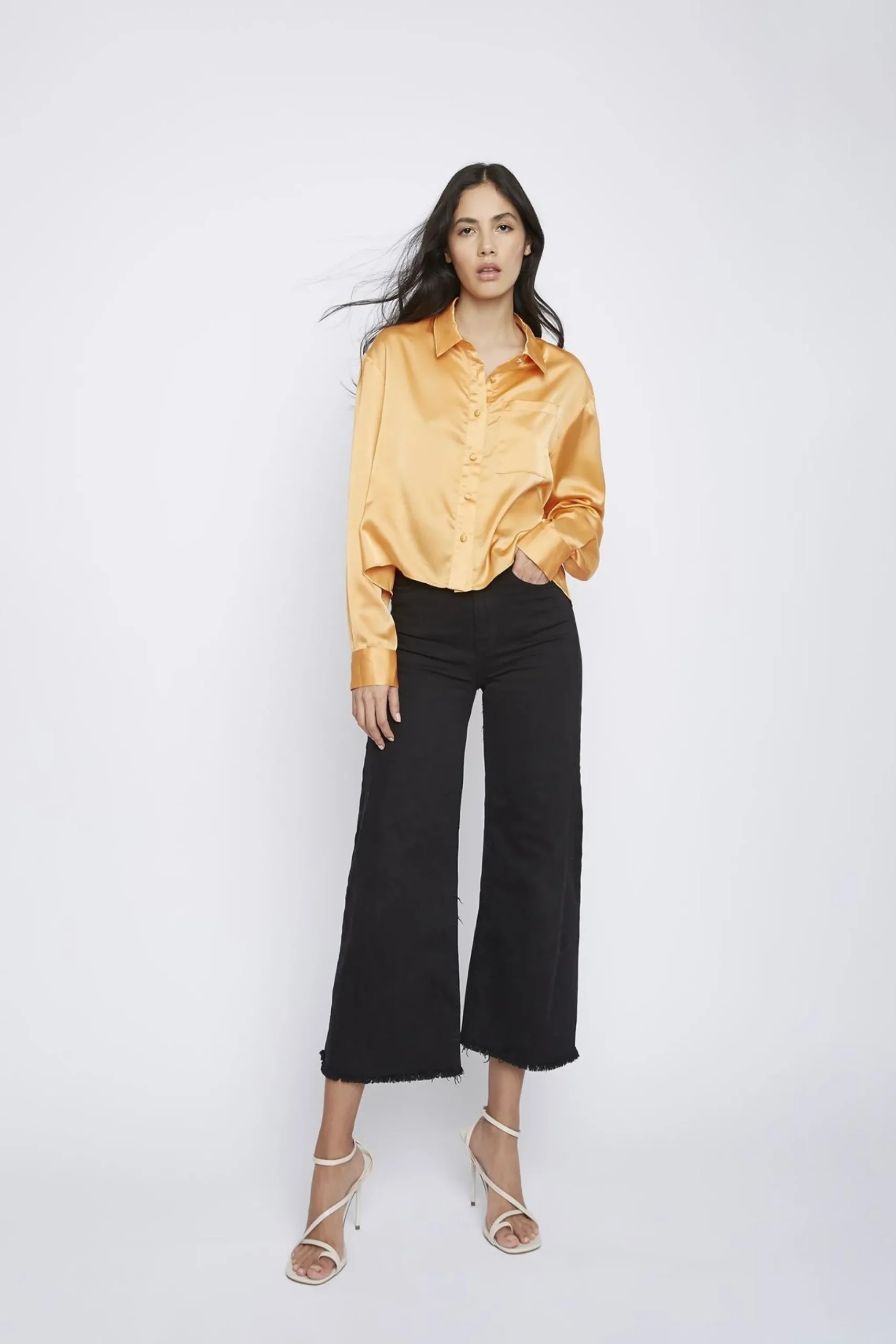 Glamorous Women’s Light-Orange Long-Sleeve Shirt. Add a touch of laid-back luxury to your wardrobe with our Light Orange Satin Long Sleeve Shirt. This beauty is like a sunset in clothing form – soft, warm, and utterly captivating. The light orange hue is a refreshing twist on classic neutrals, bringing a subtle glow to your look. Made from luxurious satin fabric, it feels as good as it looks, draping elegantly and catching the light with every move. The button-front design and collar give it a polished edge, making it versatile enough for both work and play. It’s the kind of shirt that makes you feel put-together without trying too hard. Pair it with your favourite jeans for a casual-chic vibe, or tuck it into a pencil skirt for a more formal setting. The long sleeves can be rolled up for a relaxed look or left down for a sleeker appearance. This shirt is like a secret weapon in your closet – it’s comfortable enough for all-day wear but stylish enough to make you feel like you’ve got your life together, even on your most hectic days.