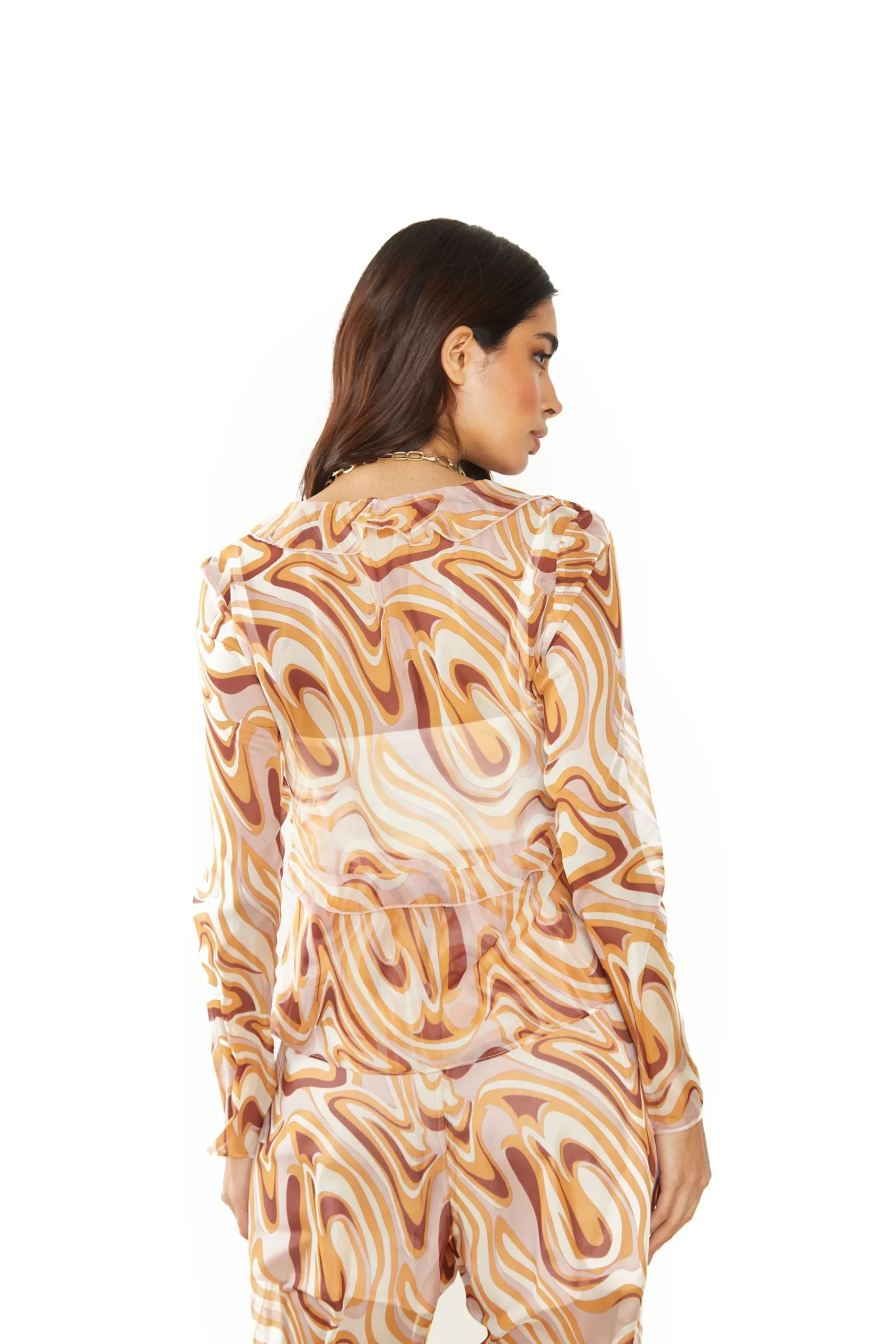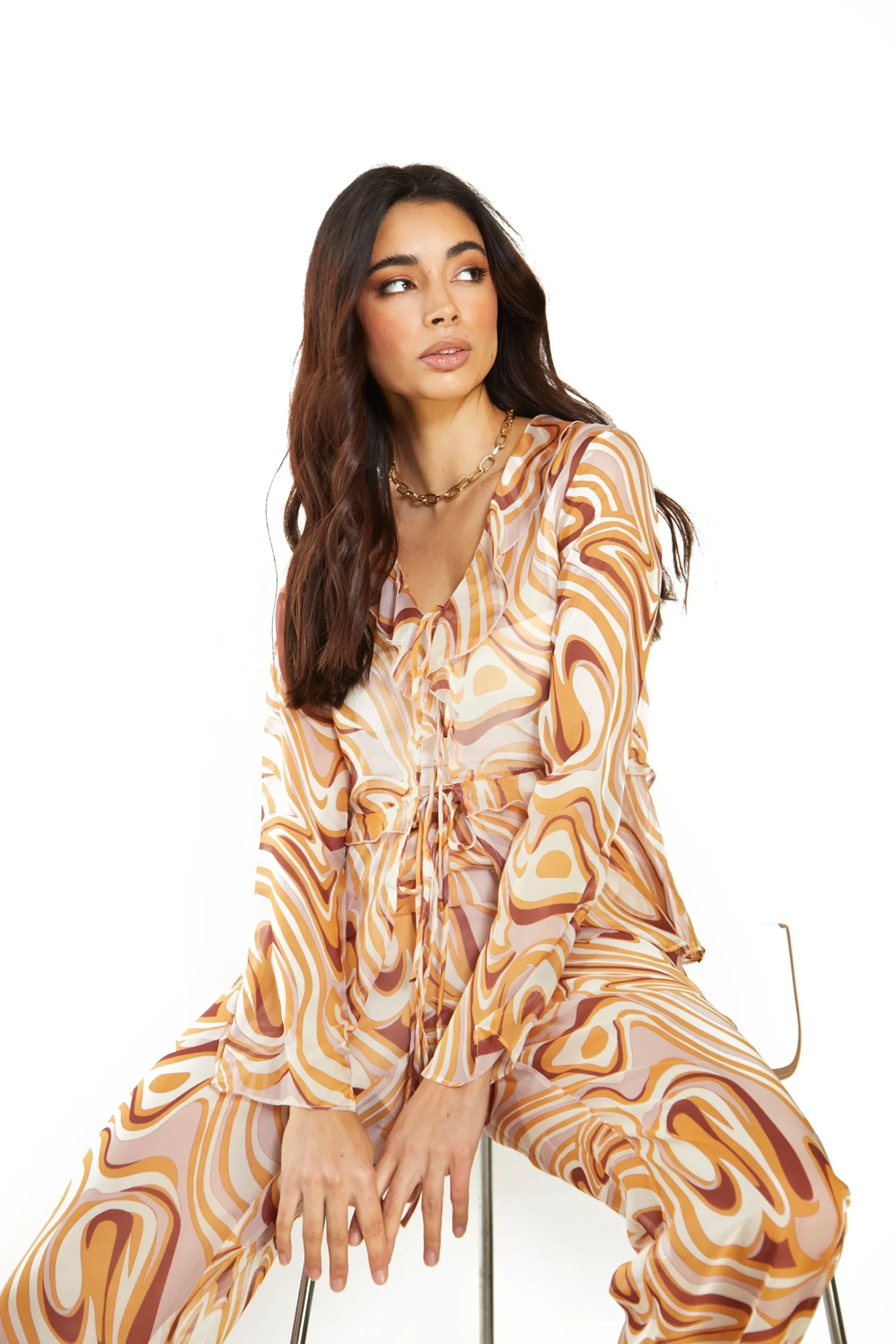 Glamorous Womens Retro Marble Tie Front Ruffle Sheer Blouse. This blouse is so on trend this spring season. Featuring a marble print and ruffle tie front finish, these wont fail to impress. Style with Matching marble flared trousers for the perfect co-ord this spring season.