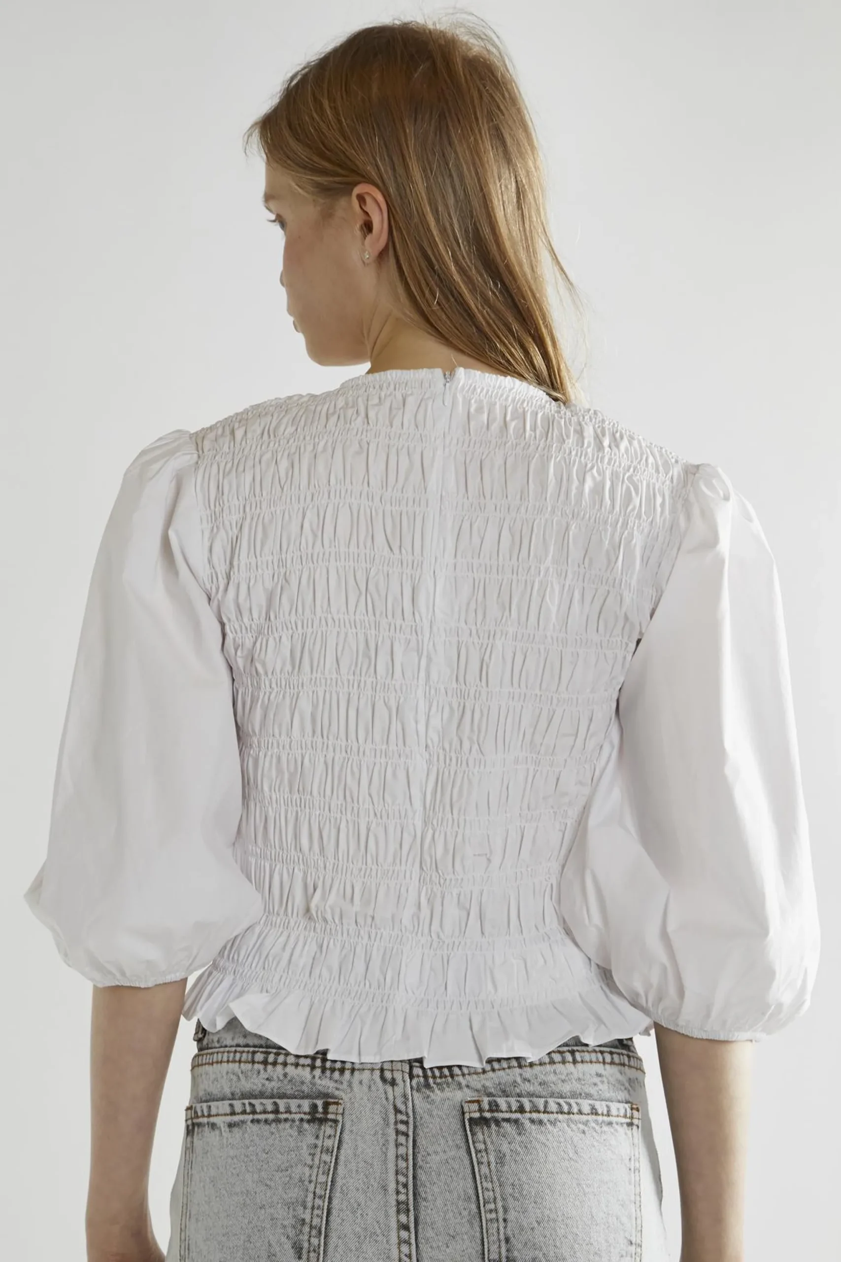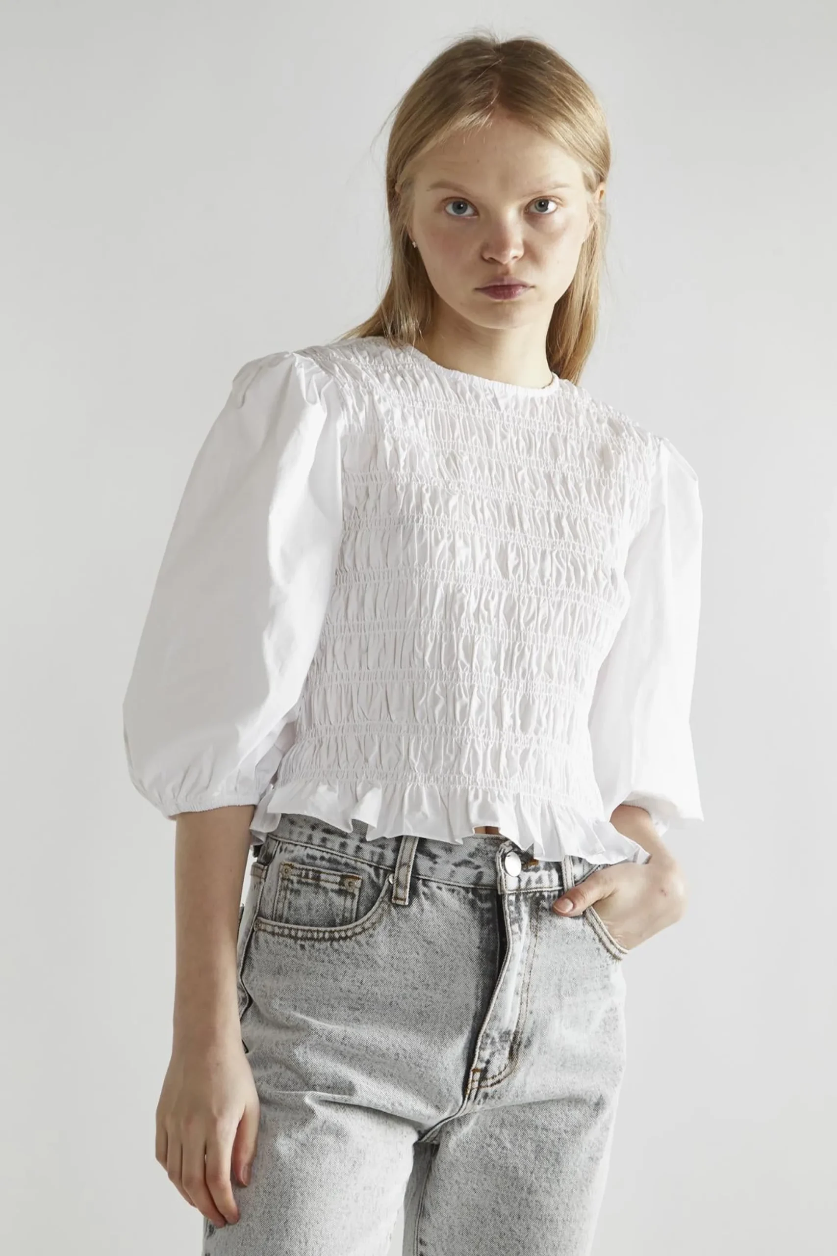 Glamorous Women’s White Shirred Top. Our White Shirred Top is a delightful blend of comfort and style. The shirred texture adds a unique, laid-back vibe to this versatile piece, making it perfect for both casual outings and relaxed office days. The puff sleeves bring a touch of whimsy, while the 3/4 length keeps things practical and seasonally flexible. A classic crew neck provides a timeless look, complemented by charming frill details that add a feminine flair. We’ve included a concealed zip fastening at the back for a smooth, polished finish. This top is a breeze to style – pair it with your favourite jeans for an effortless everyday look, or tuck it into a skirt for a more put-together ensemble. The crisp white colour makes it easy to accessorize with colourful jewellery or scarves. It’s the kind of top that feels special without being fussy, perfect for those who appreciate a bit of texture and detail in their wardrobe staples. The shirred fabrication is not only stylish but also forgiving, making it a great choice for travel or busy days when you want to look good without much effort.