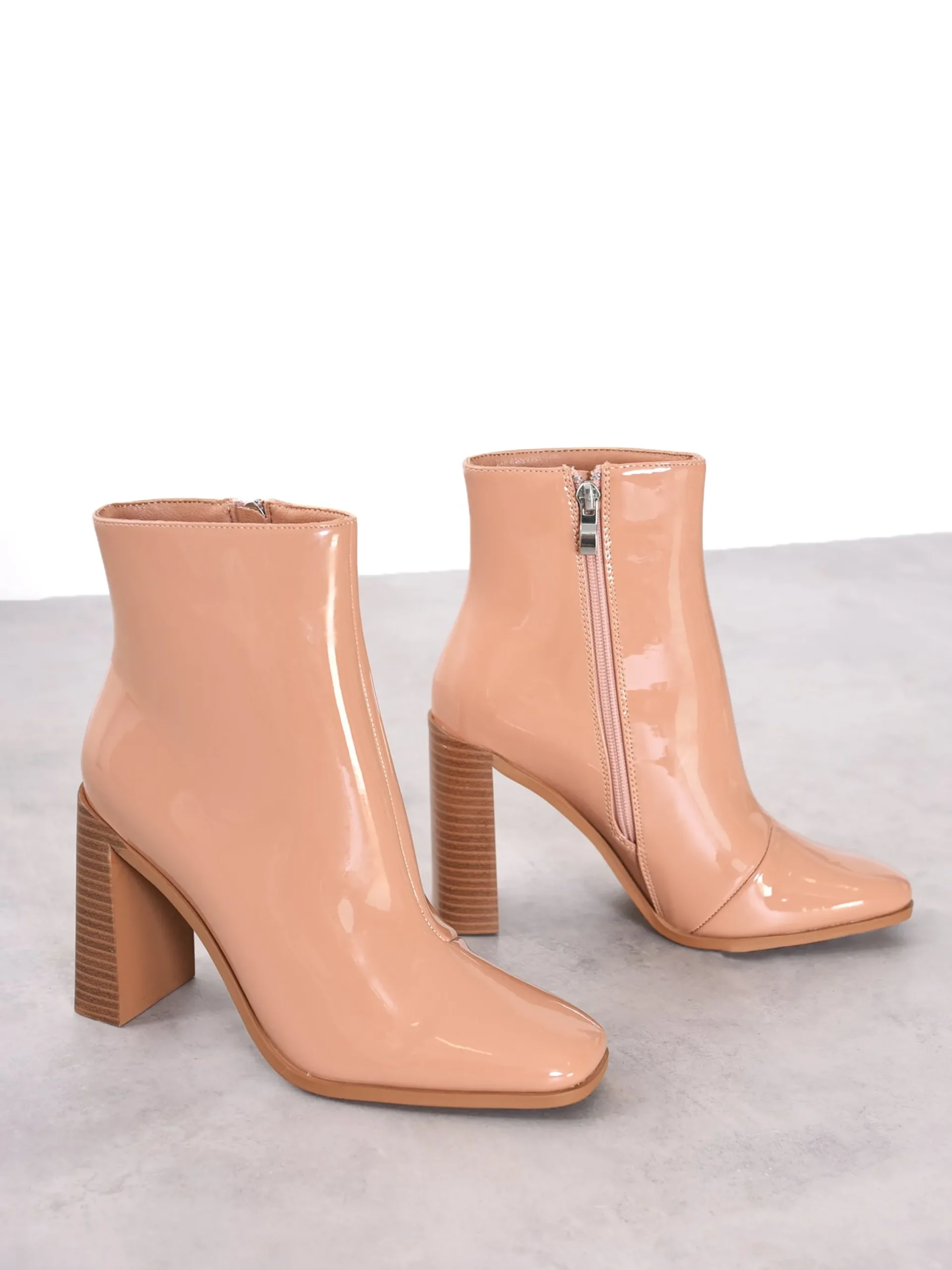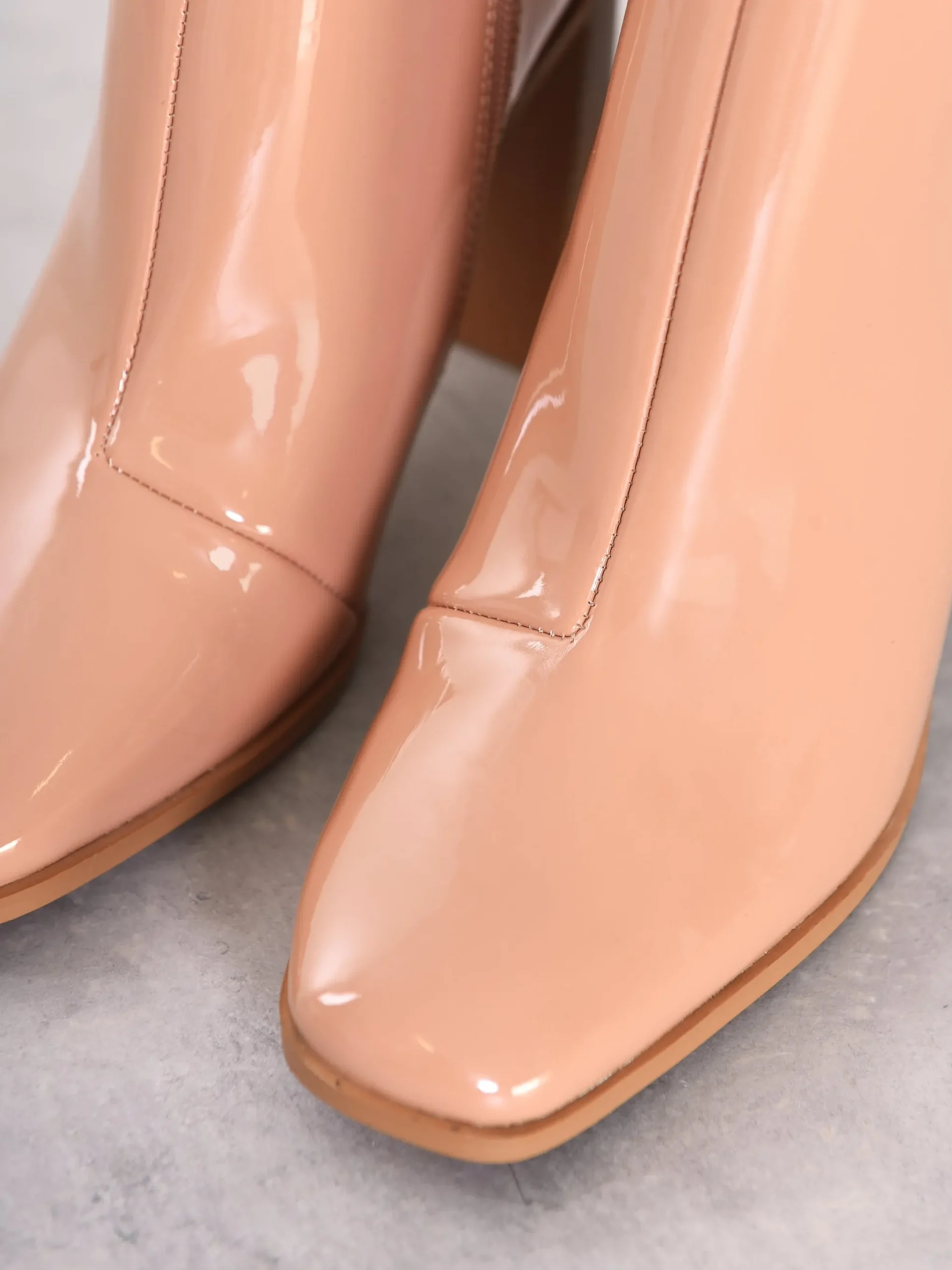 Some of the key features of our Glamorous Beige Patent Square-Toe Chunky Heel Boots include: