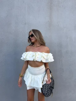 Collective the Label Women’s Arabella Co-ord RaRa Mini Skirt -Cream. Introducing the Arabella Co-ord! This adorable coordinated look creates the perfect look for brunch with the girls. The tiered, multi ruffle layers and smocked, elasticated waistband of the rara skirt create the most flattering silhouette to enhance your best features. Pair this skirt perfectly with the matching ruffle bardot crop top, for a complemented stylish look.