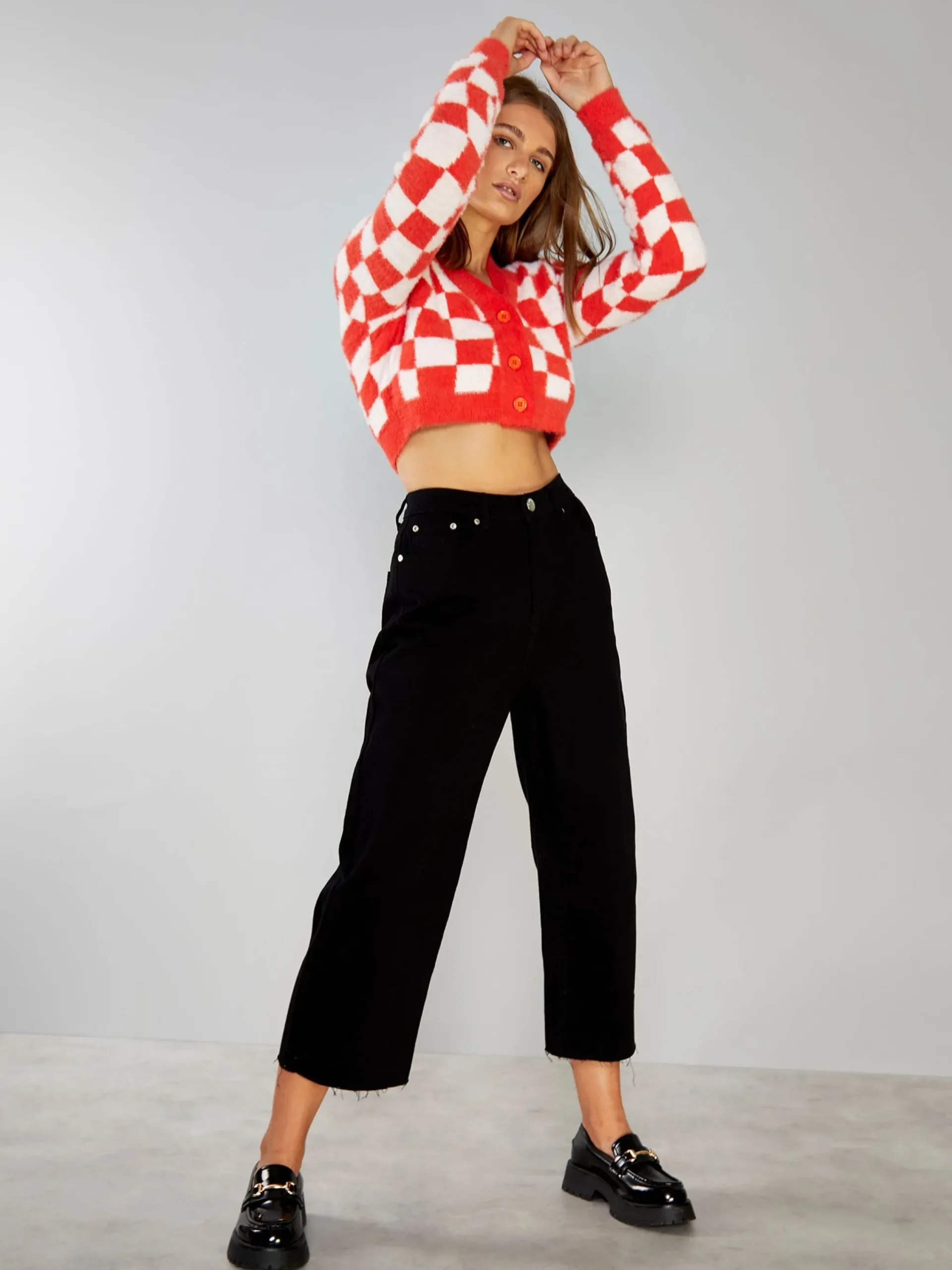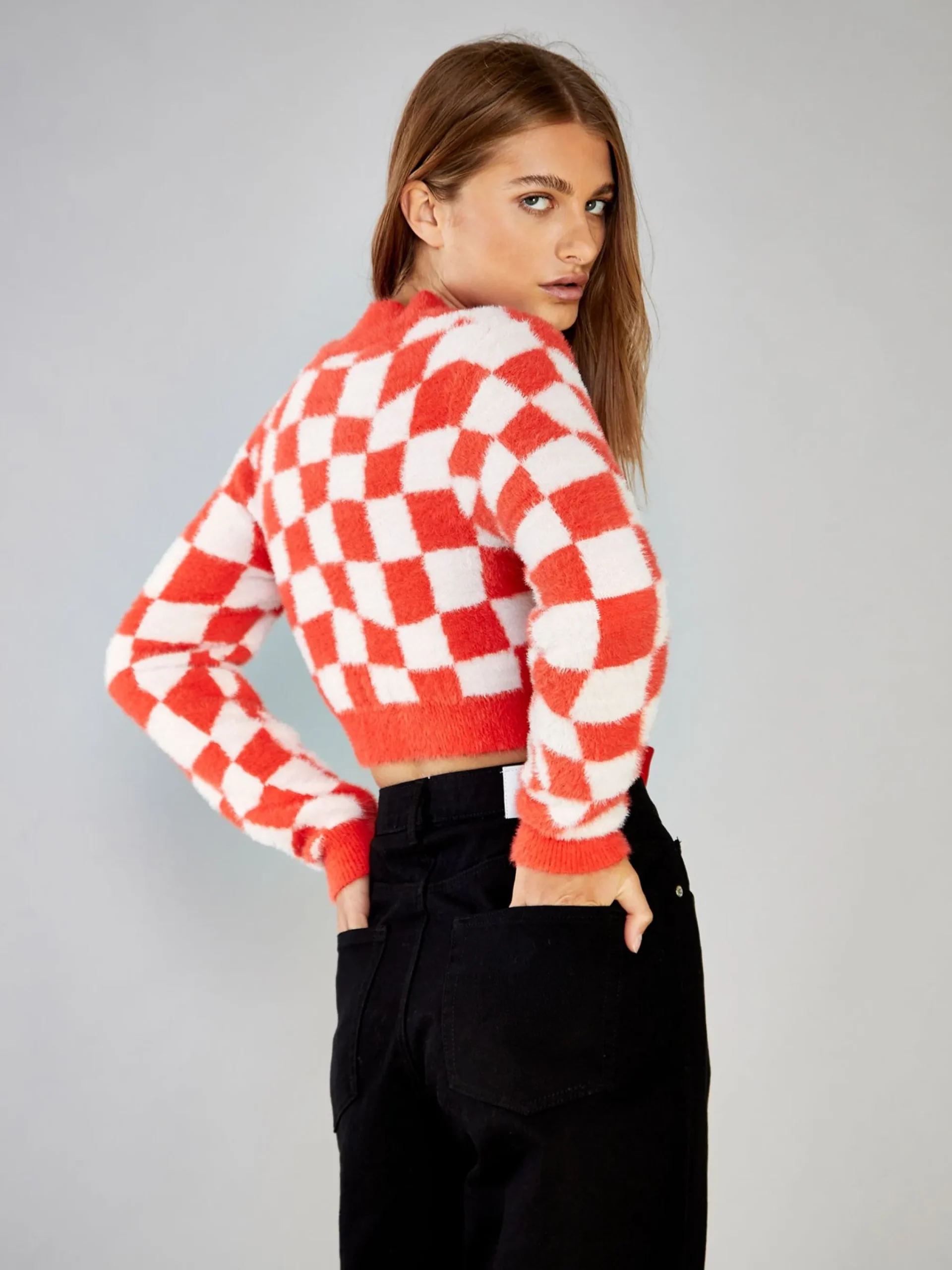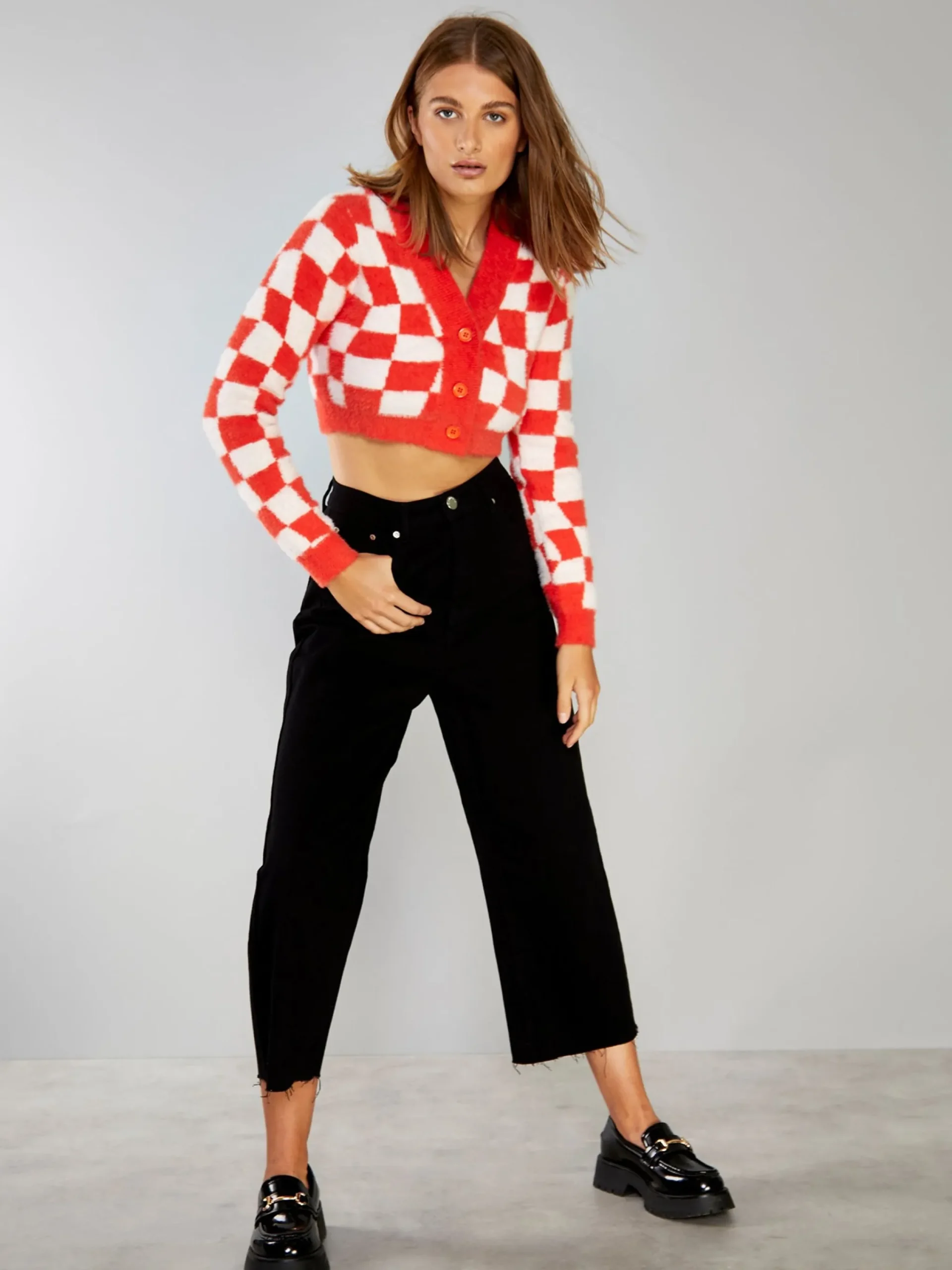 Glamorous Womens Spicy Orange Pale Pink Pattern Knit Cropped Cardigan. This gorgeous cardigan is perfect for your wardrobe this Autumn season. Featuring Check Pattern detail and contrasting colours, this flattering piece will look great on you! Pair with some relaxed white trousers and mule sandals for a fashion forward daytime look.