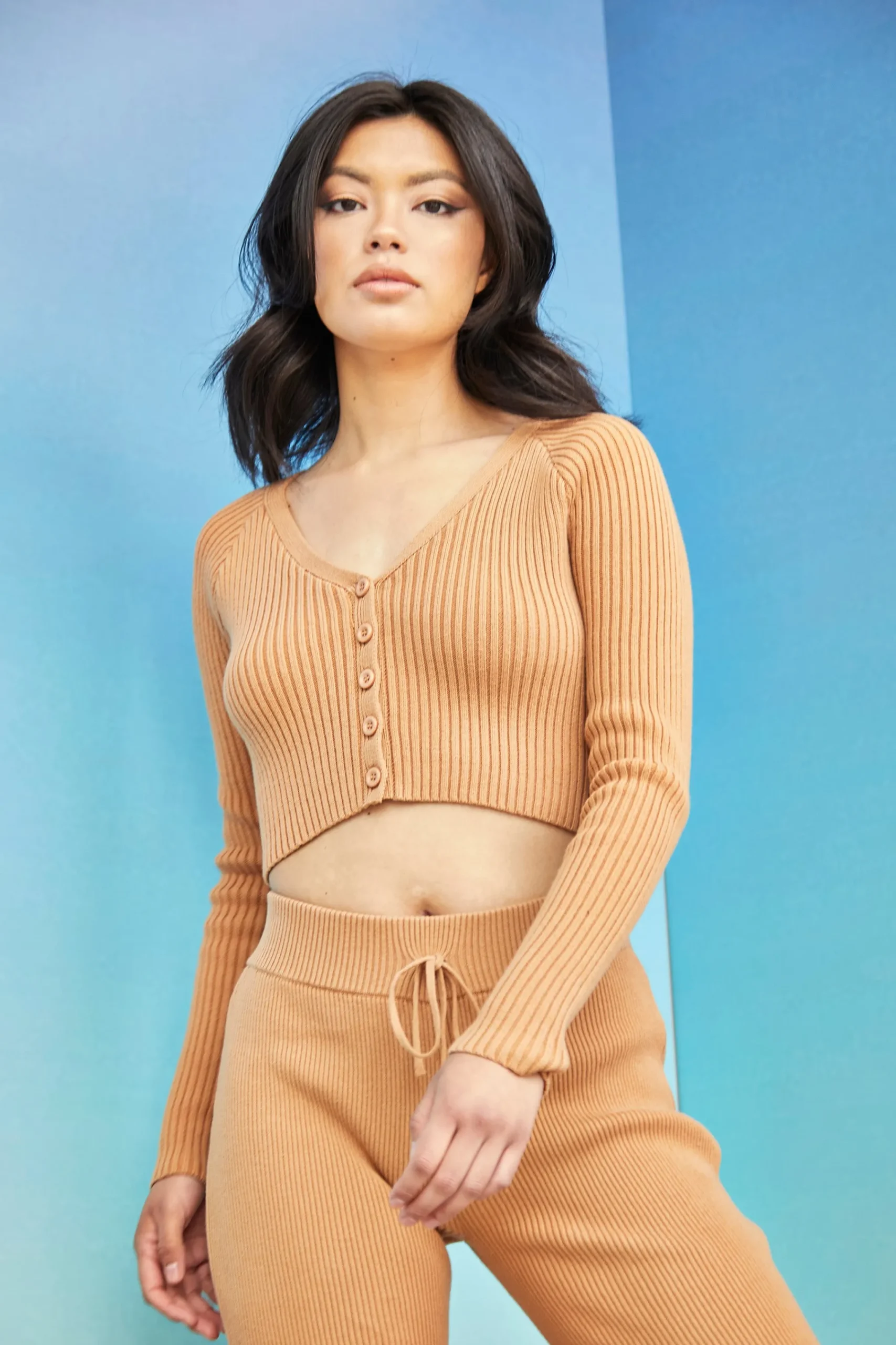 Glamorous Care Womens Tan Button Up Ribbed Cardigan. This super flattering cardigan features a ribbed finish is bringing all the fashion forward sustainable feels feels. Style with matching trousers, chunky boots for the ultimate day time look!
