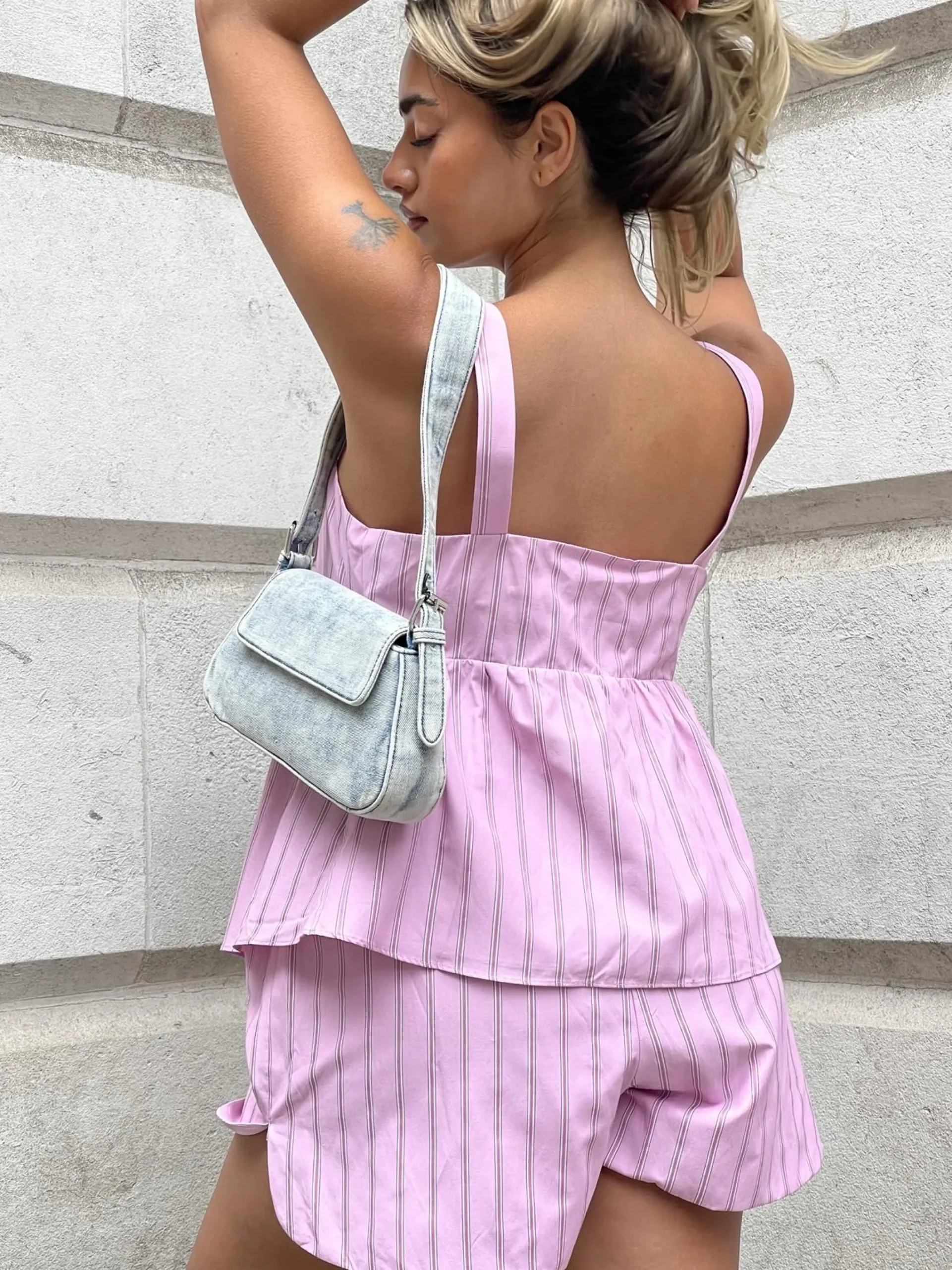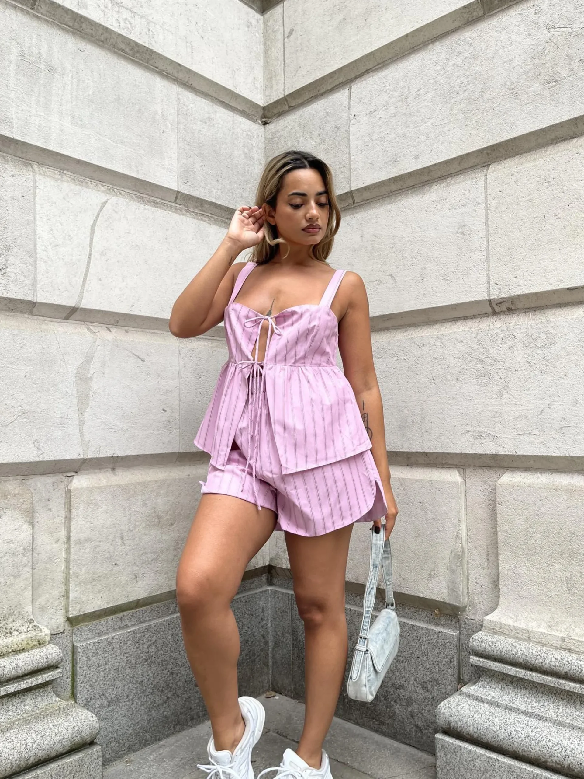 Glamorous Women’s Pink Vertical-Stripe Tie-Front Smock-Top. Get ready to turn heads in this playful Pink Vertical-Stripe Tie-Front Smock-Top! The tie-front detail and gathered smock silhouette give it a flirty, fun feel, while the thick straps and full lining provide comfort and support. Perfect for adding a splash of colour to any outfit.