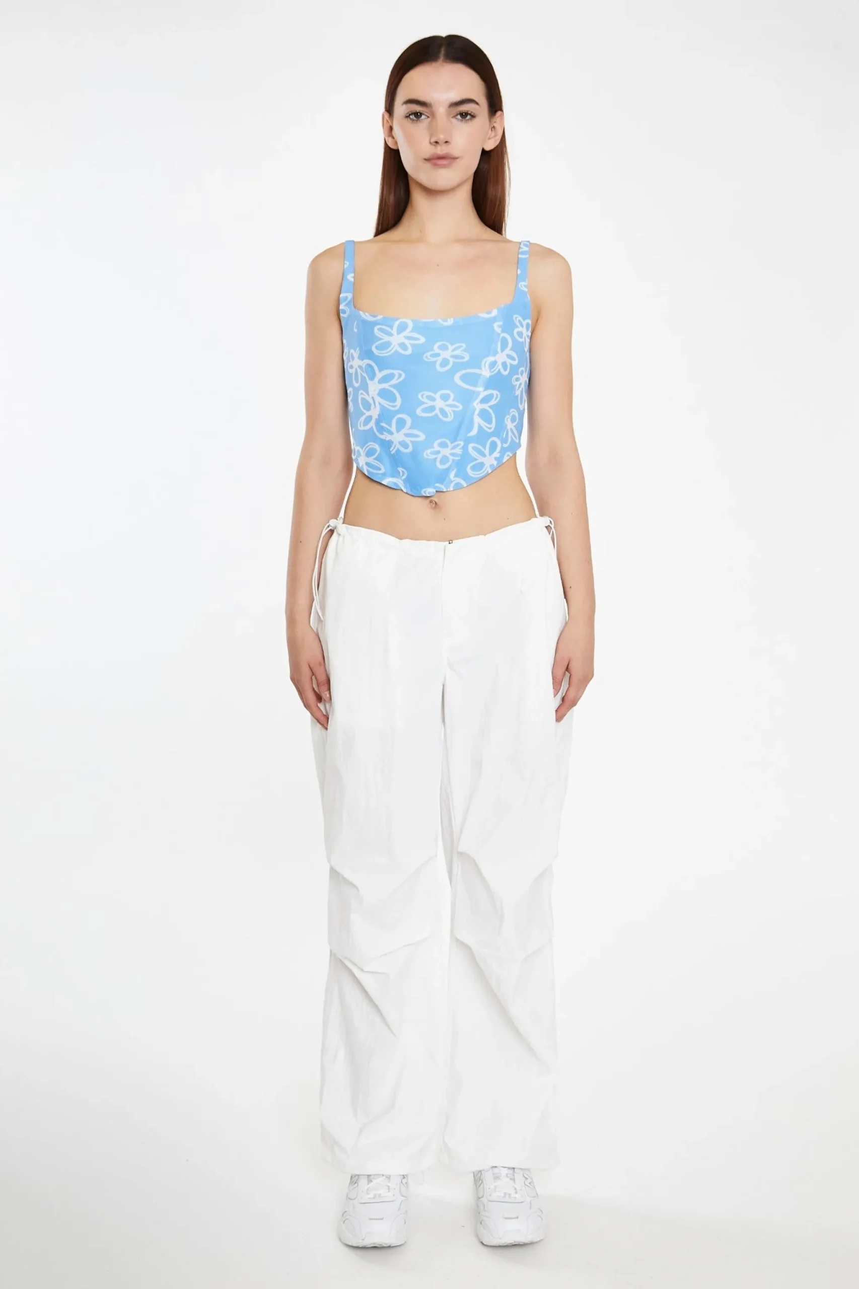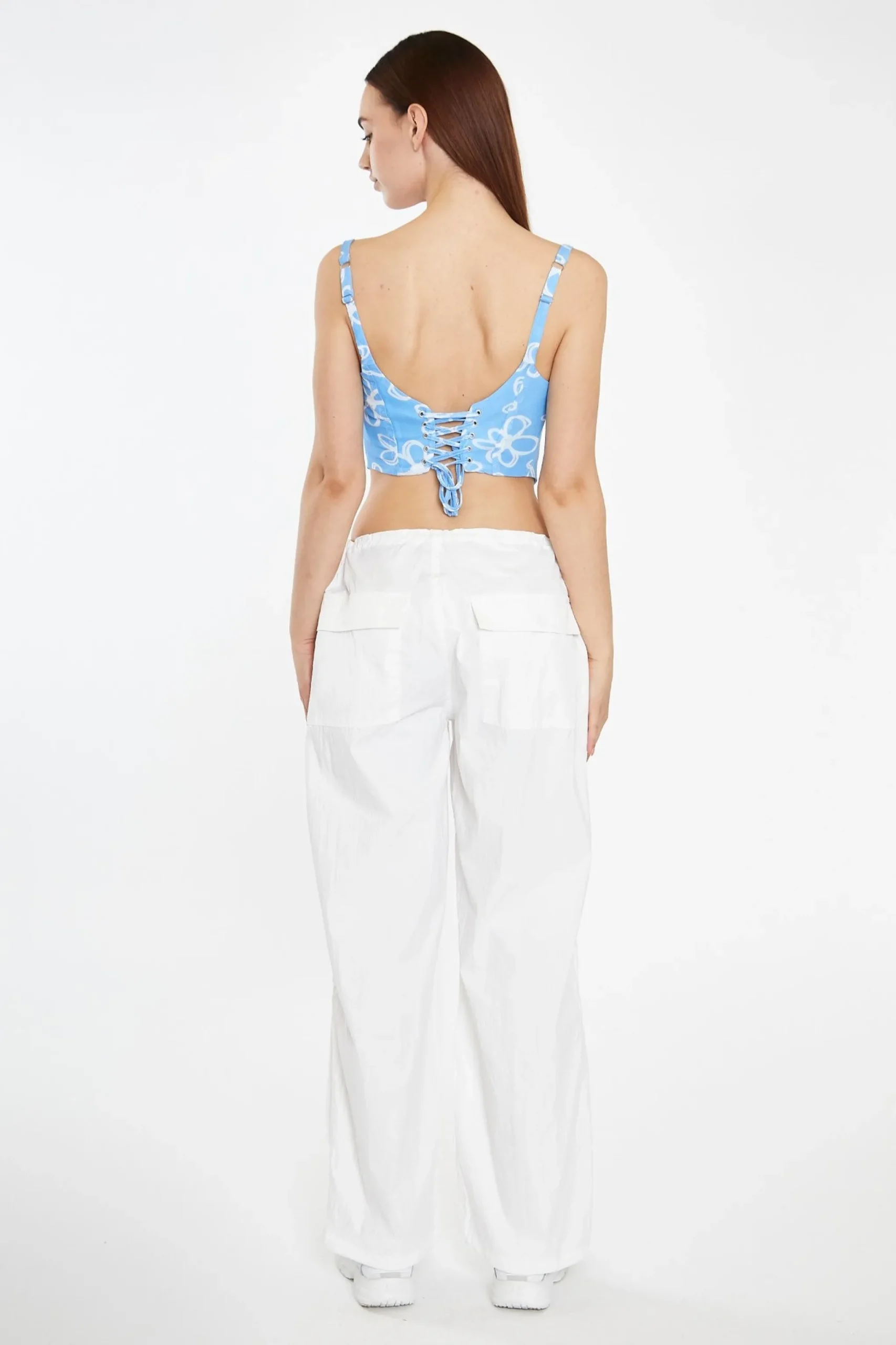 Glamorous Womens Blue Scribble Daisy Mesh Lace-Up Corset Top. This super on trend Top is a must have! Featuring a figure hugging corset design, with boning details and a lace-up back, this top is a wow staple piece. Perfect for any occasion, dress this with Jeans and chunky trainers for an edgy day time look, or dress up with a sleek bias cut midi skirt and heels. So versatile, we love it!