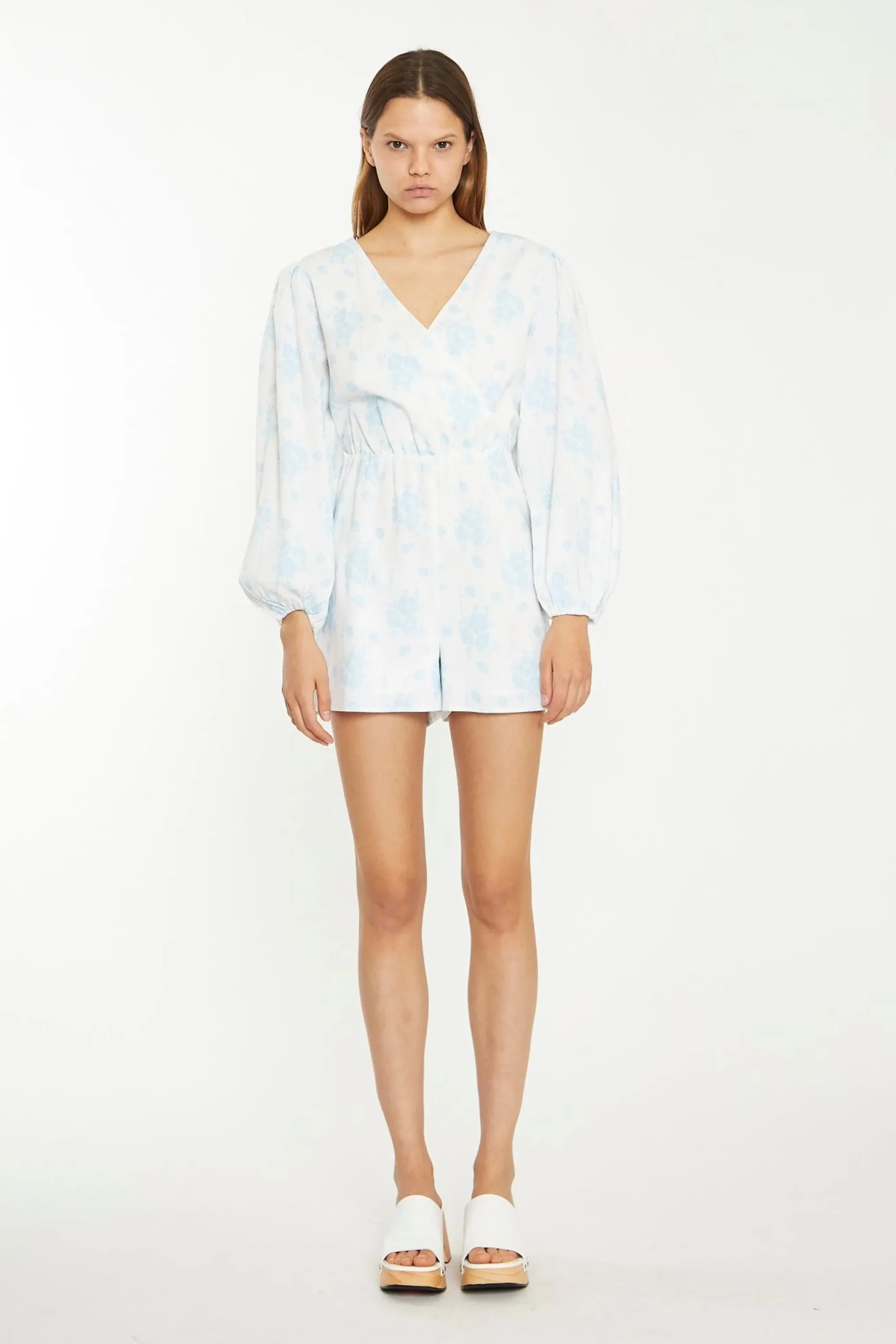 Glamorous Womens Blue Wallpaper Floral Wrap Playsuit. This playsuit in a gorgeous blue wallpaper floral print is a style worth having in your wardrobe. Featuring a flattering wrap over design with a V-neckline and balloon sleeves, this piece will look great on you! Elevate the look with some mule sandals and a cute strappy bag for an on-trend vibe.