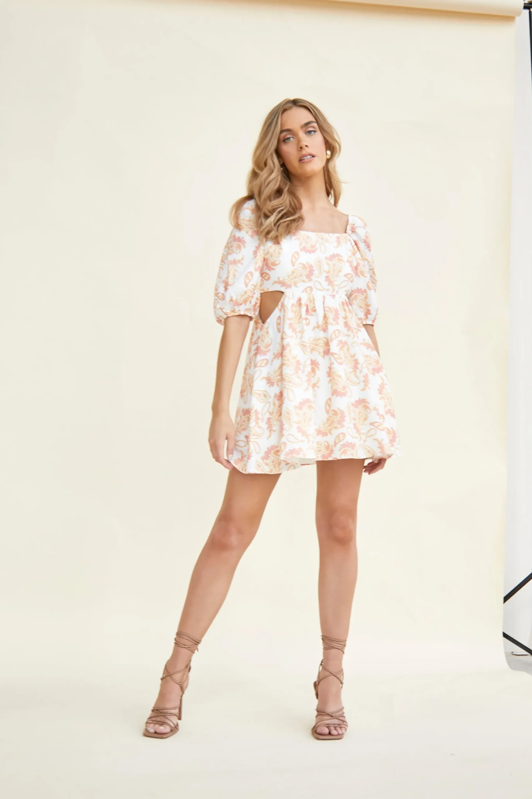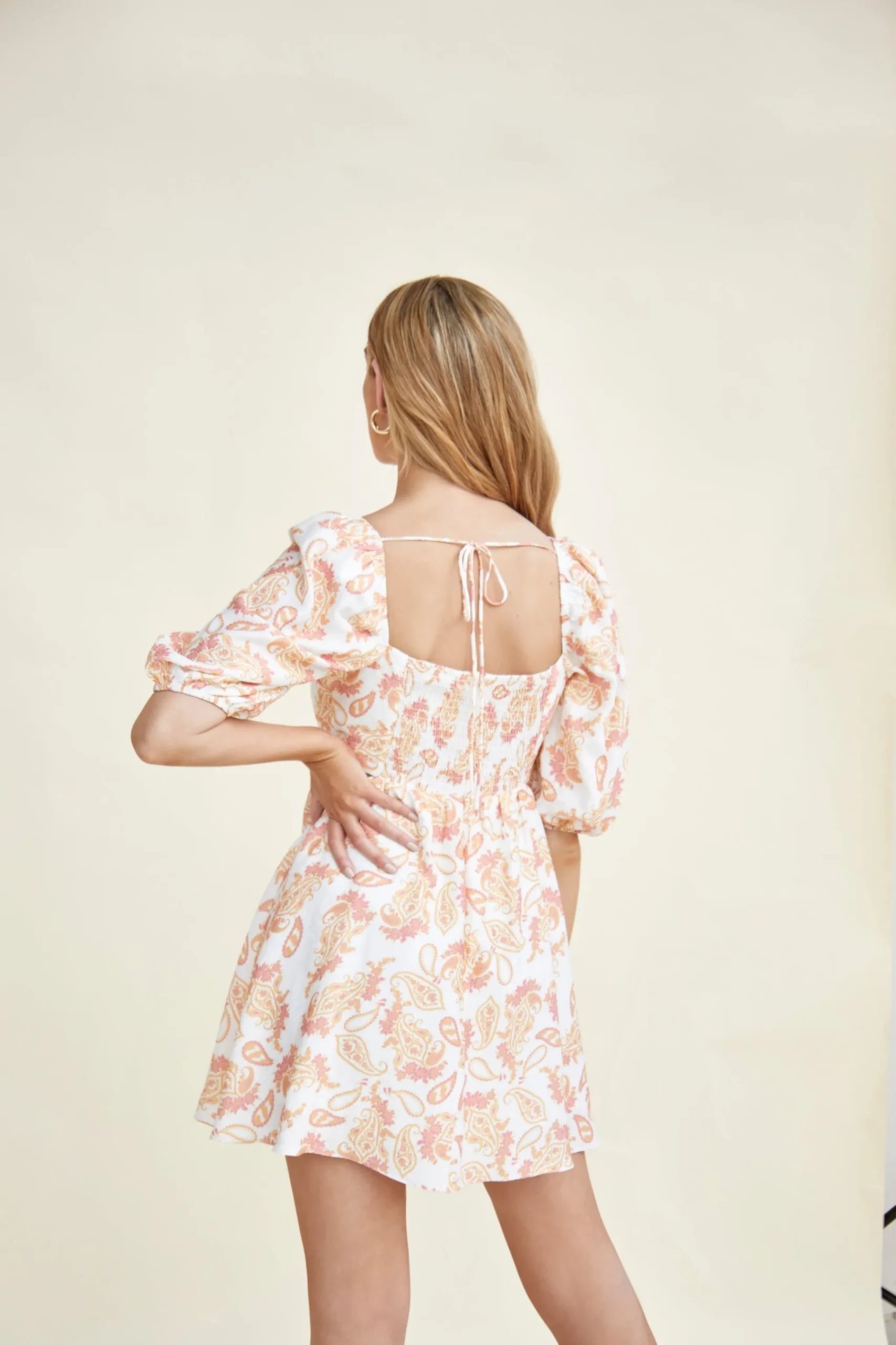 Glamorous Paisley Floral Tie-Back Babydoll Mini Dress. This super flattering babydoll dress features cut out sides, a shirred back panel, puff sleeves and a tie back. With a simple change of shoe, this is a perfect day to night dress.