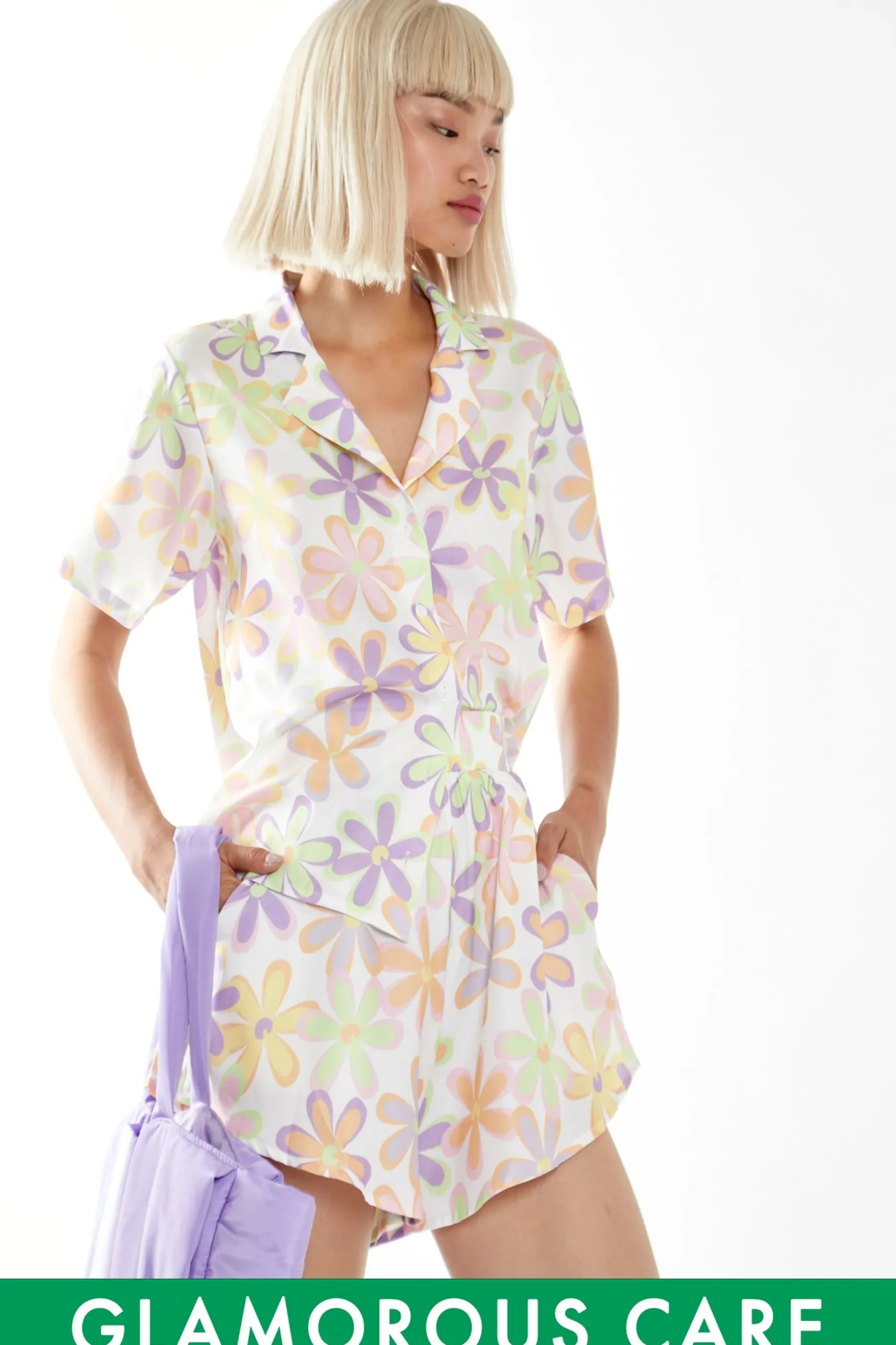 Glamorous Care Womens Pastel 60s Floral Shorts. Discover an earth-friendly fashion statement with our unique shorts and matching shirt set. These shorts will keep you looking cool and feeling comfortable with an elasticated waistband and handy inseam pockets. Pair with your favourite white trainers for a comfortable but chic day time look.