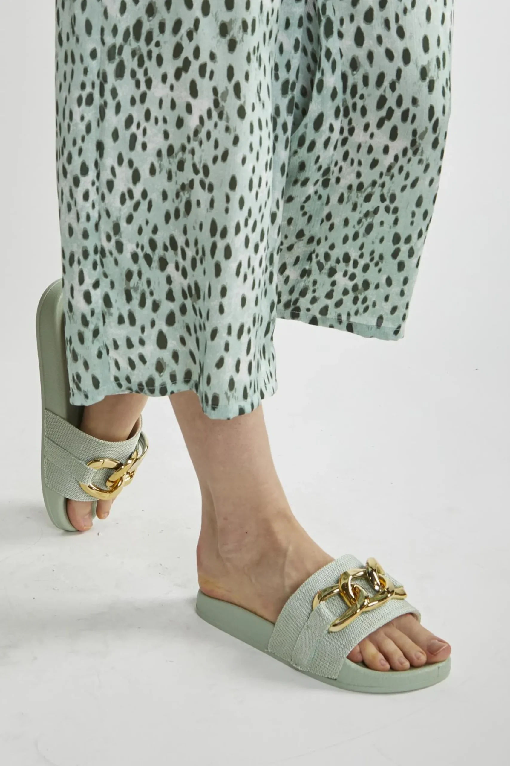 Be the first to review “Glamorous Chic Escapes|Mint Sliders with Gold Chain Strap –” Cancel reply