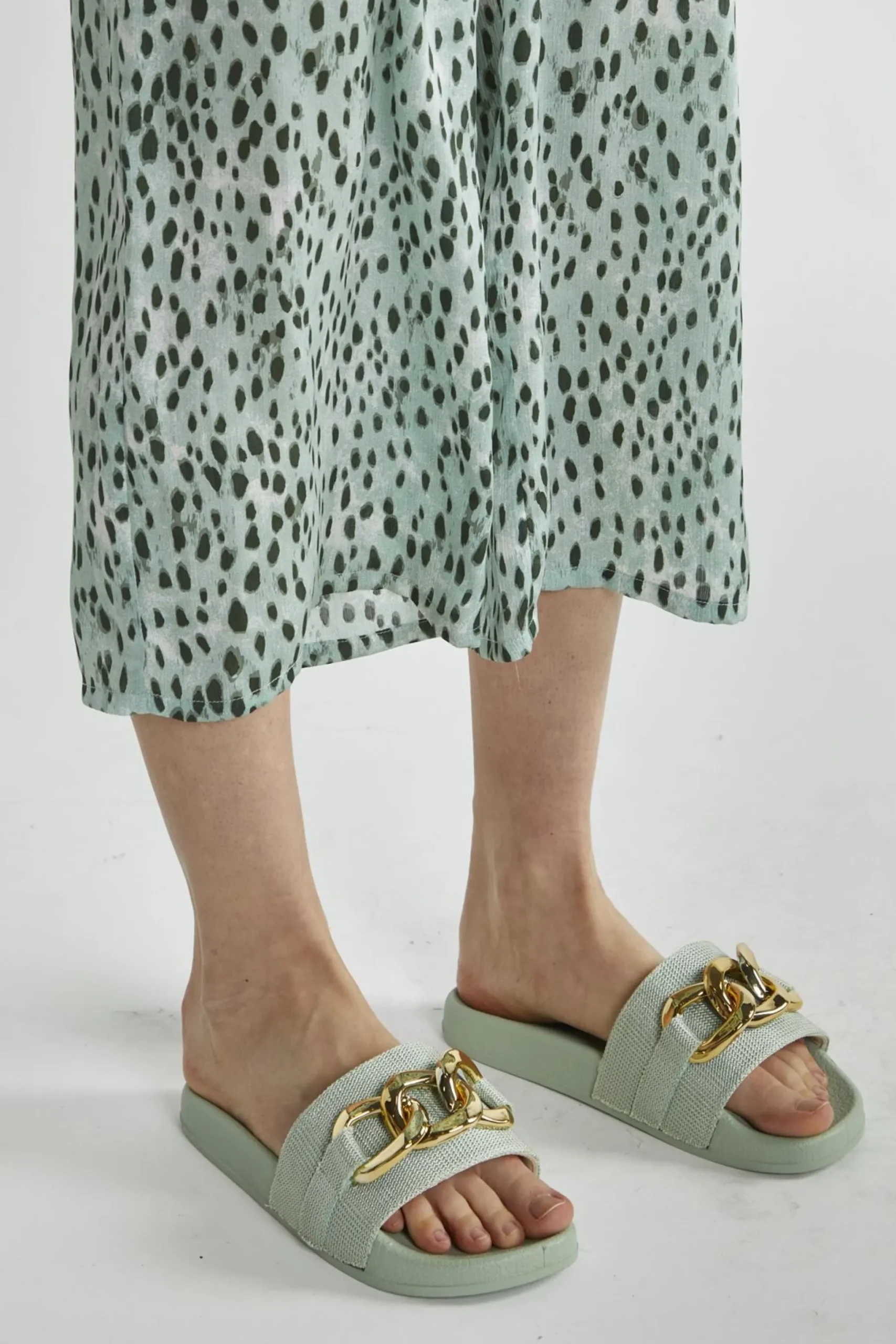 Glamorous Mint Sliders with Gold Chain Strap. A summer must have, these chic sliders will go with everything in your wardrobe. Featuring a wide strap with gold chain detail in a slip-on style, these sliders are comfy and on-trend. The perfect basics to finish off any outfit with a summer luxe vibe! Heel Height: 2cm Composition: Upper: 100% Textile, Inner: 100% PU, Outer: Thermoplastic Rubber