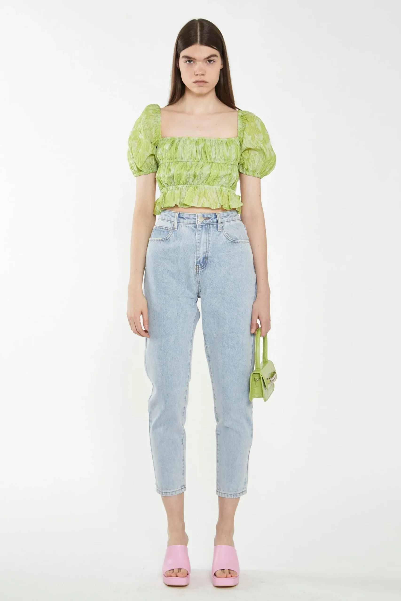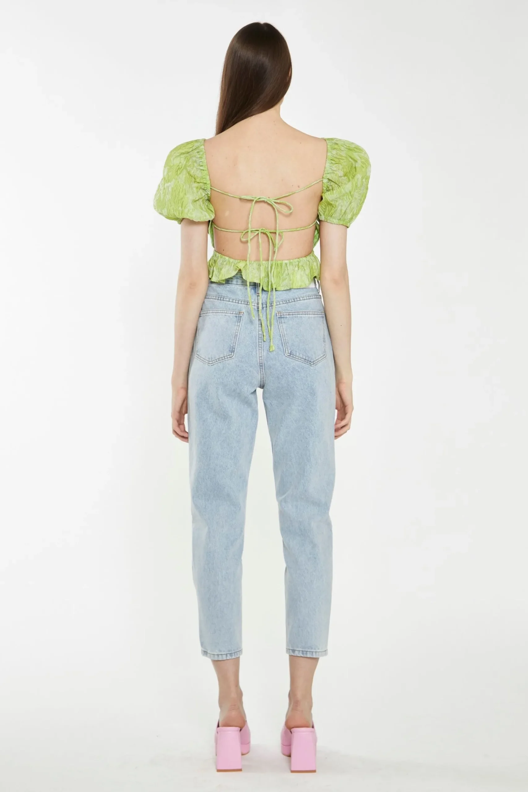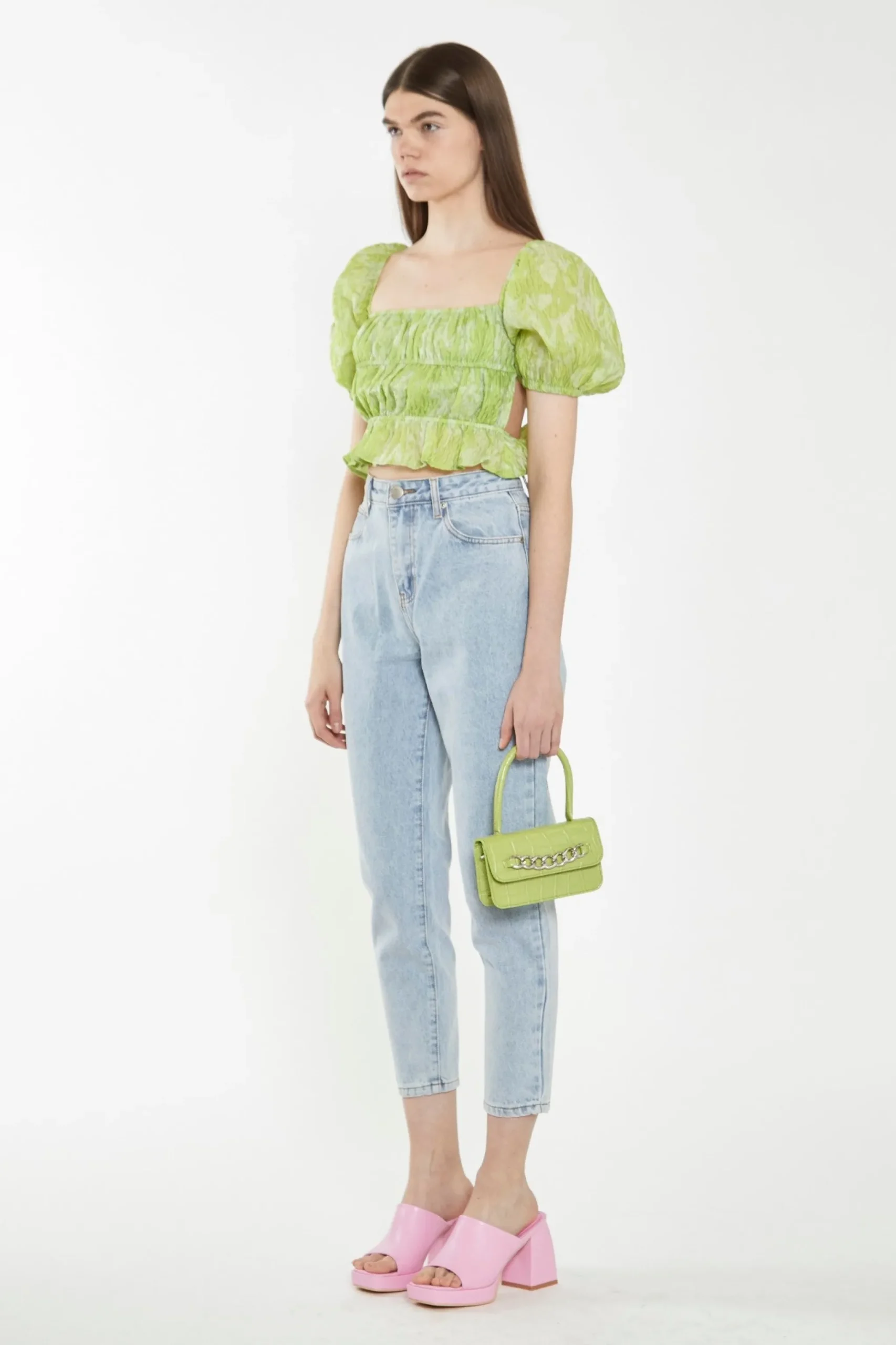 Glamorous Womens Lime Organza Jacquard Open-Back Top. This cute crop top will look great on you this Spring. Featuring a gathered bodice, puff sleeves and an open back with tie detail, this piece is a super flattering addition to your wardrobe. Looks fab paired with your favourite jeans and some heeled mules for the ultimate stylish look!