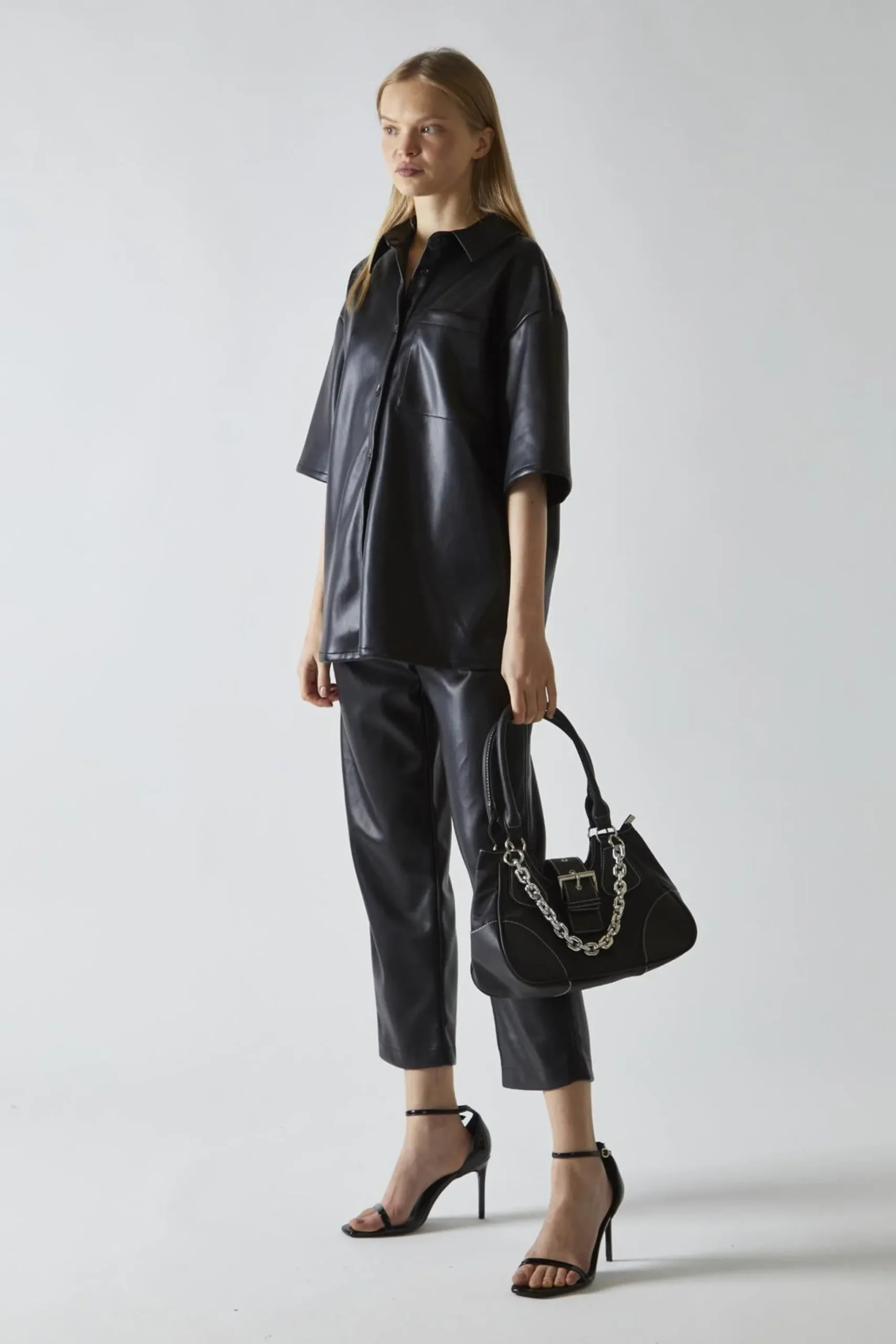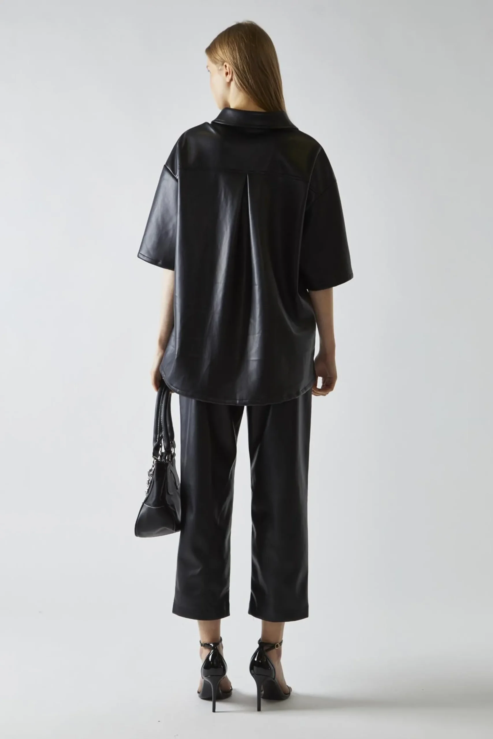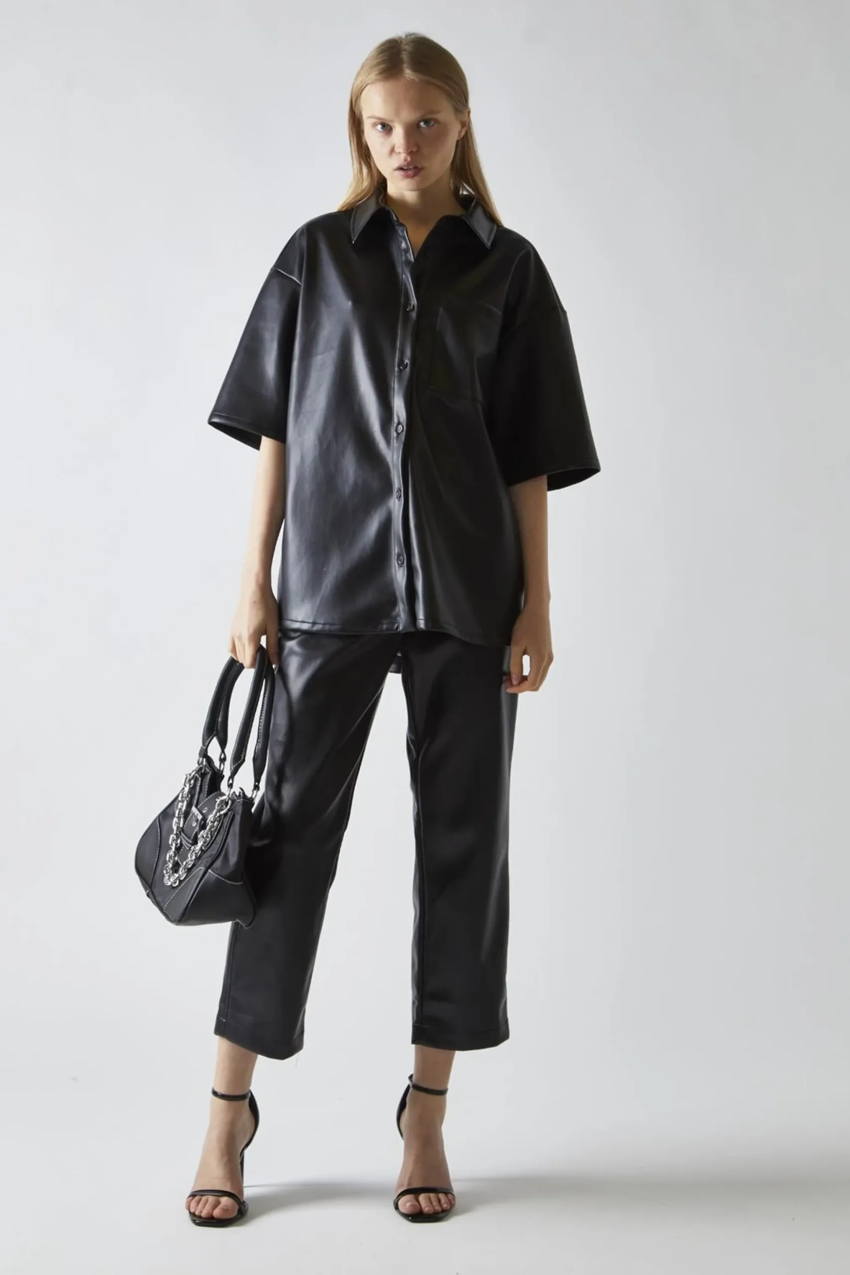 Glamorous Women’s Black-PU Boxy Oversized-Shirt. Meet your new wardrobe MVP: the black PU boxy oversized shirt. This cool and edgy piece takes the classic shirt silhouette and gives it a modern twist with its roomy, relaxed fit. Made from sleek PU fabric, it adds a touch of rebel chic to any outfit. The oversized design means you’ll stay comfy all day long, whether you’re running errands or heading out for drinks with friends. It’s a versatile powerhouse that can be styled countless ways – leave it unbuttoned over a crop top for a laid-back vibe, or button it up and tuck it into high-waisted jeans for a more polished look. For a coordinated ensemble, pair it with the matching PU trousers for a head-turning monochrome outfit. This shirt is perfect for those days when you want to feel effortlessly cool without trying too hard..