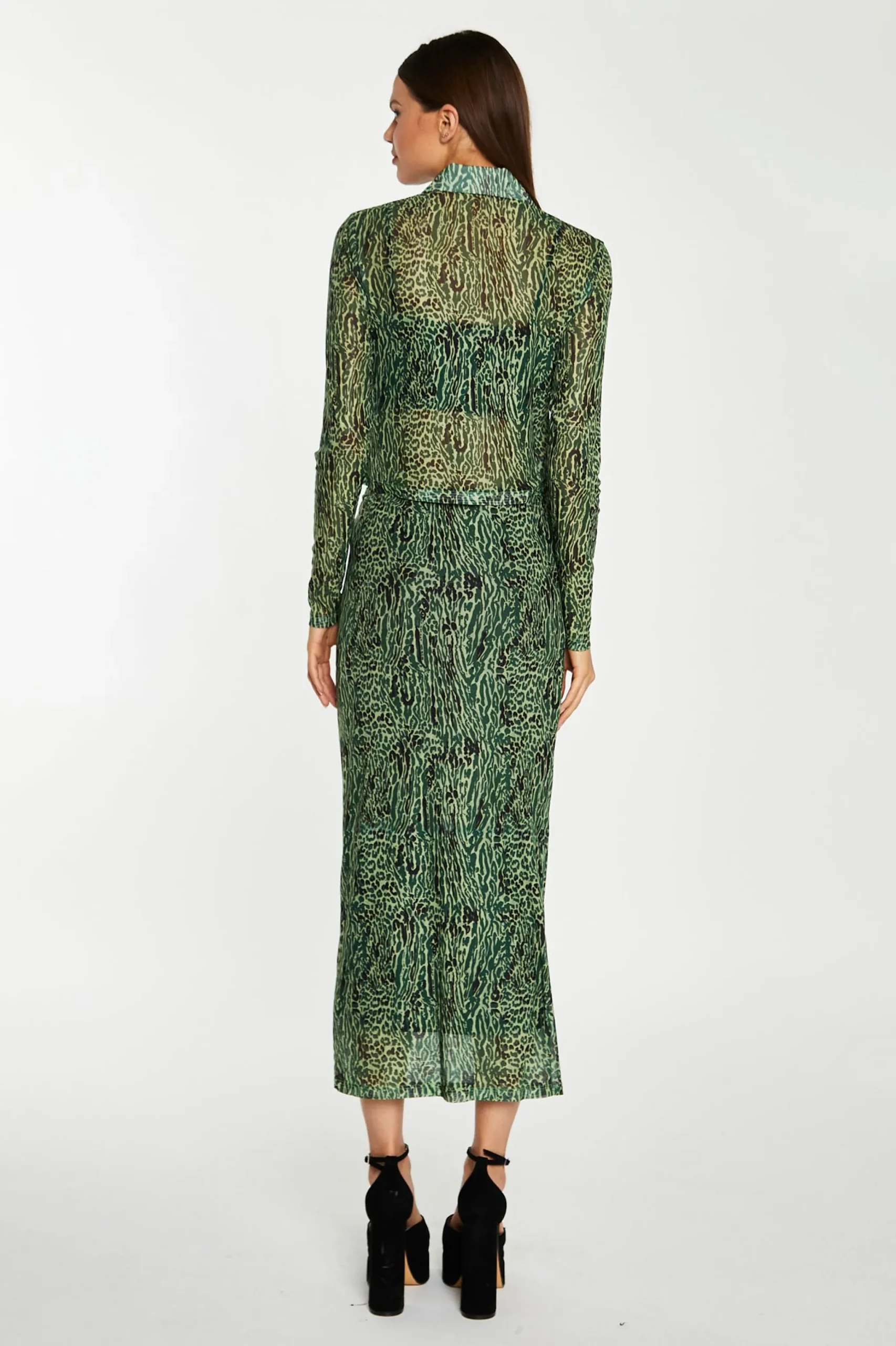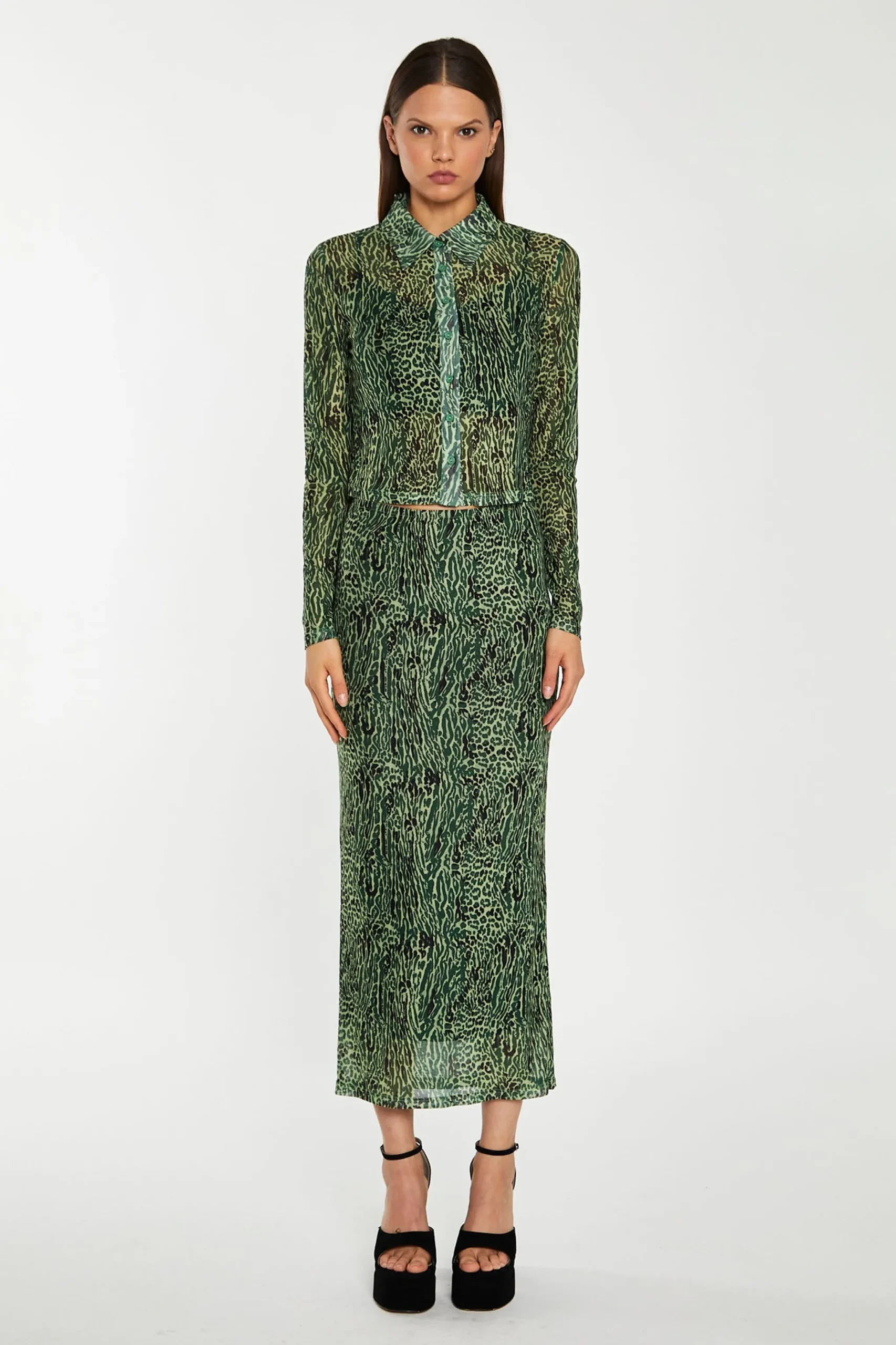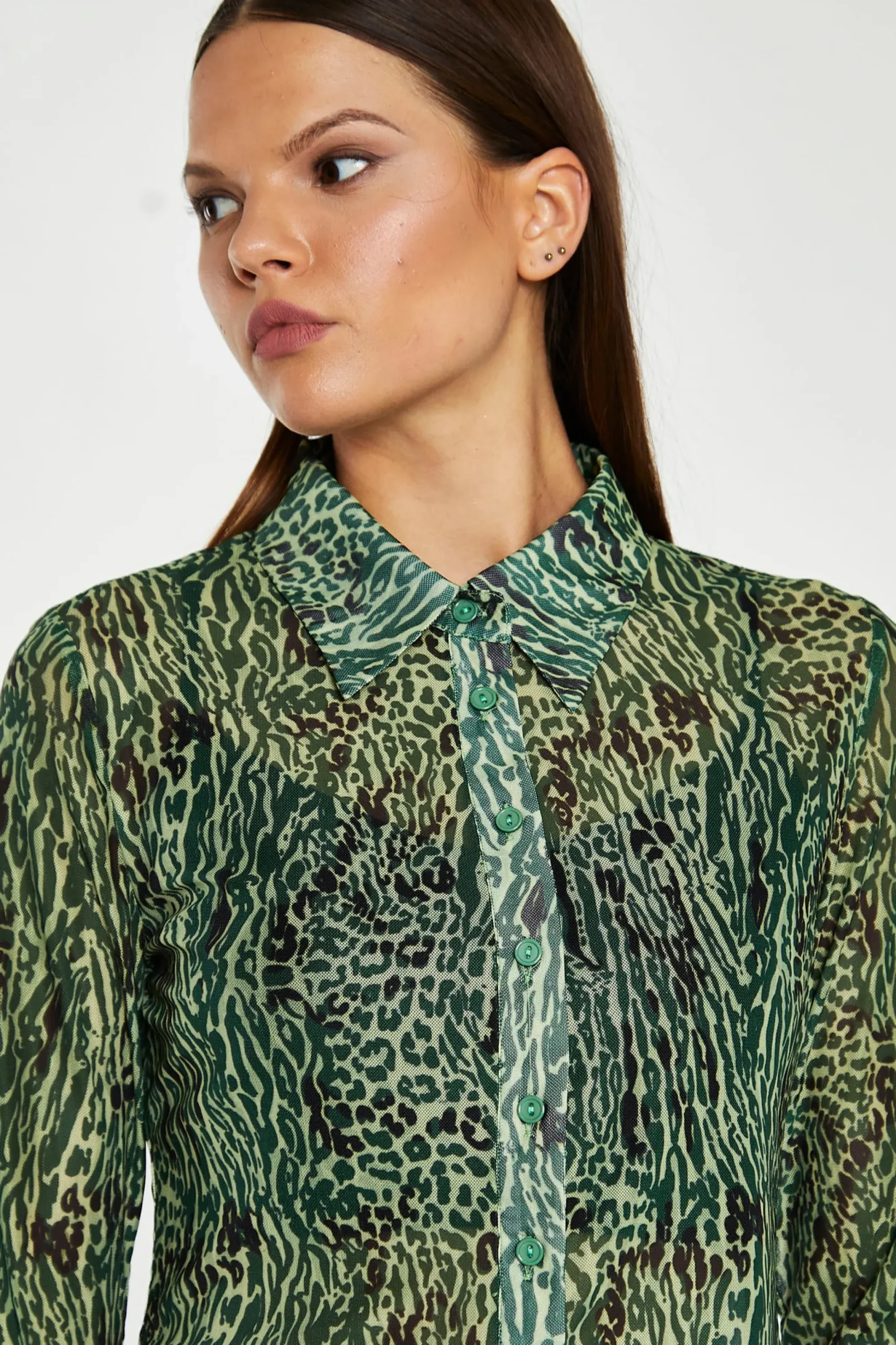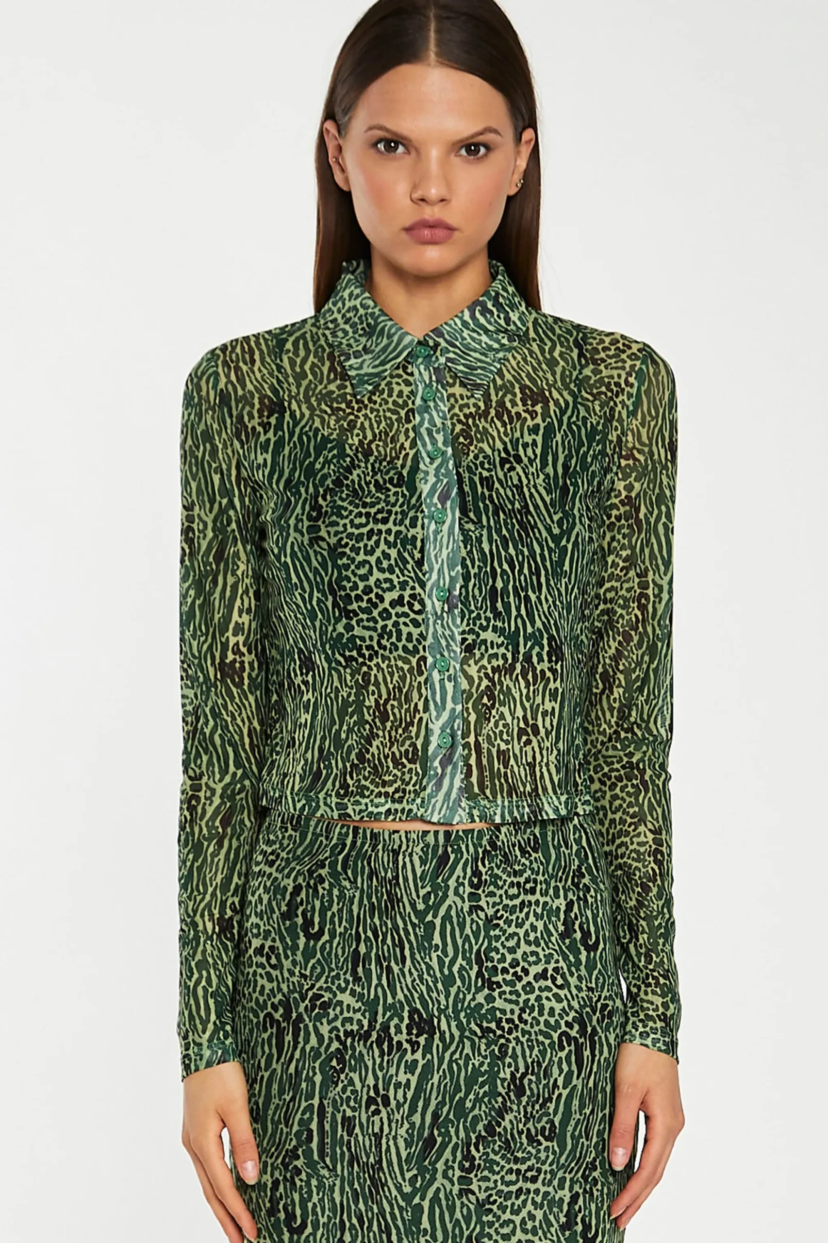 Glamorous Womens Green-Black Animal Mesh Skinny Fit -Shirt. This stylish Mesh Skinny Fit Shirt and Matching Skirt combo will have you looking fierce and fashion-forward! With its classic slim fit design and breathable mesh fabric, youll be looking fierce and fashionable all day long. Looks great paired with jeans, or with the matching skirt!