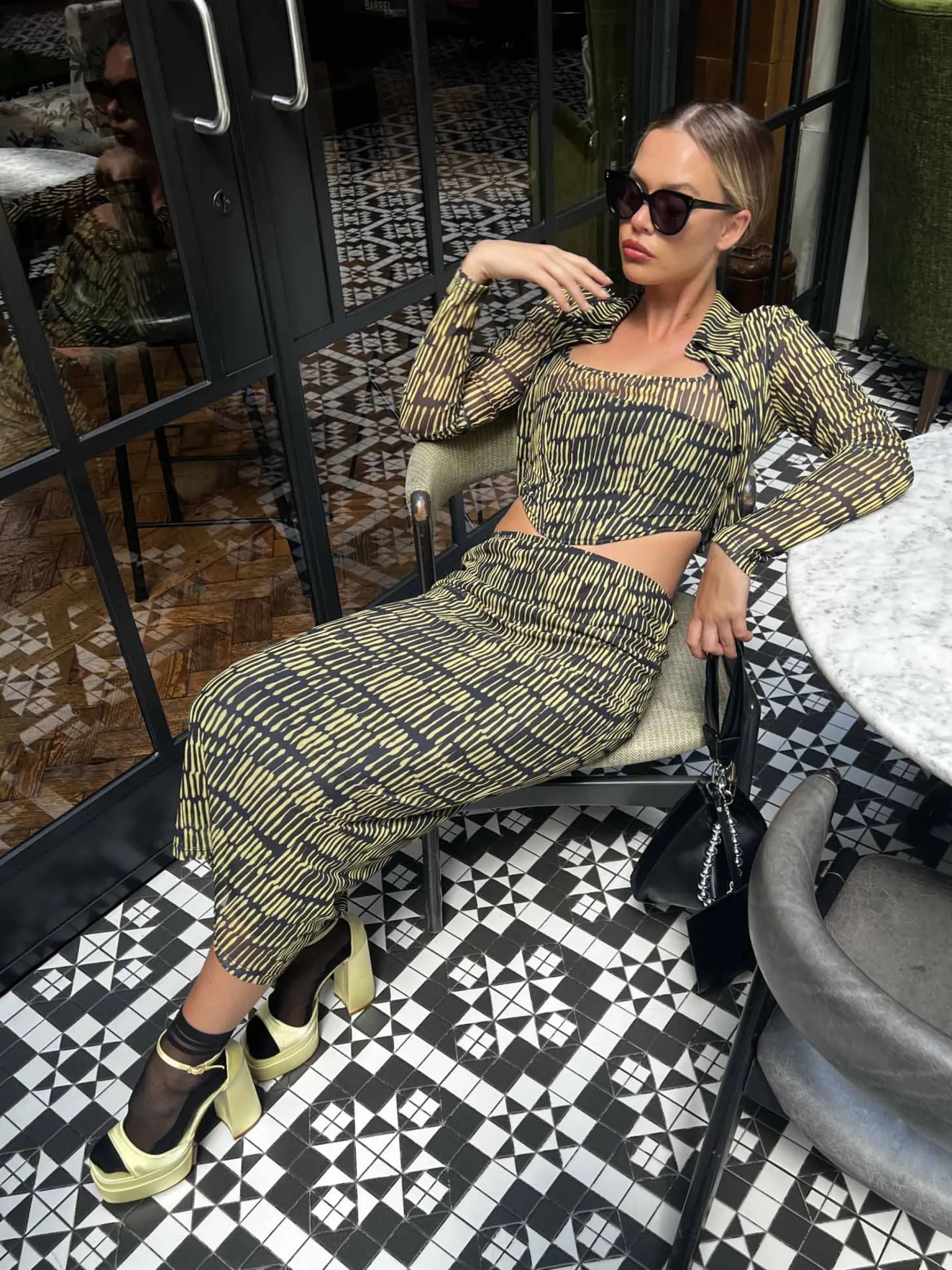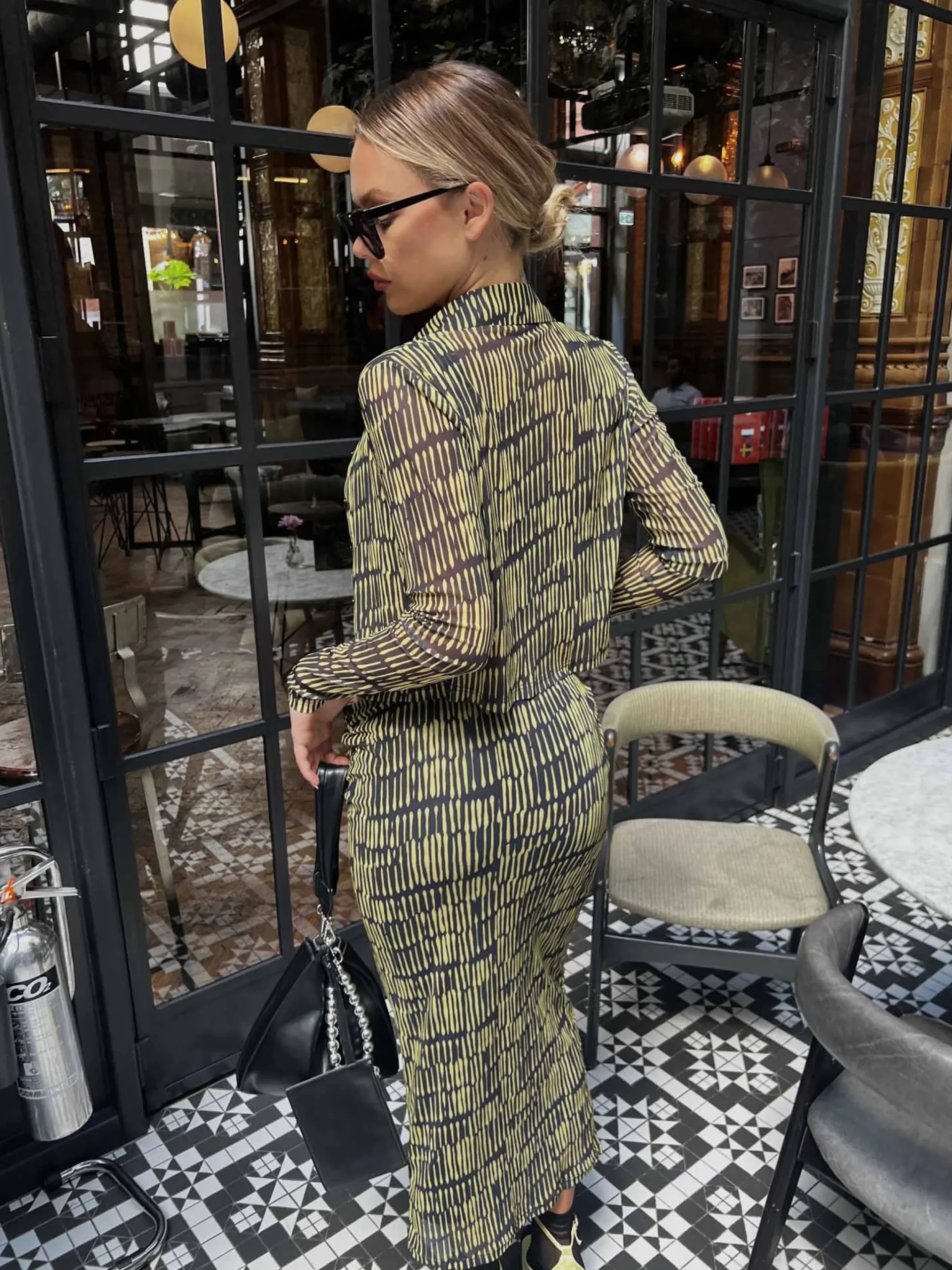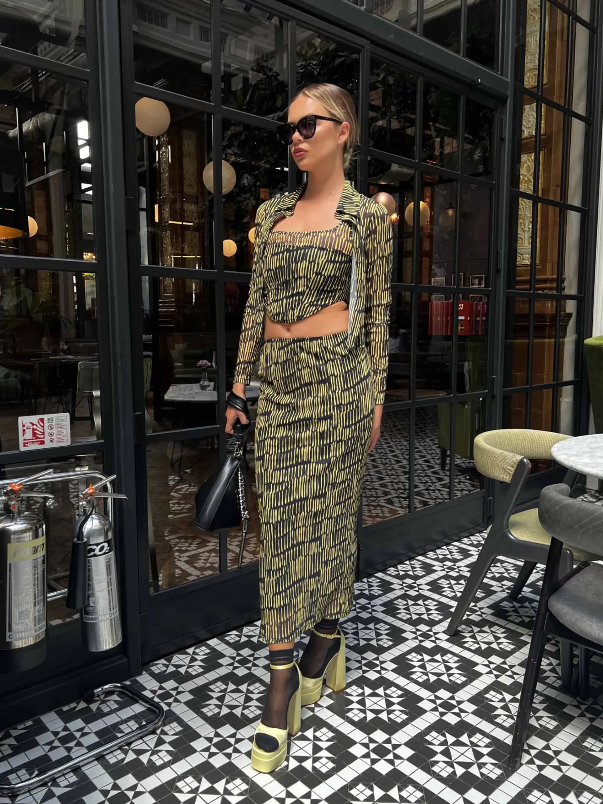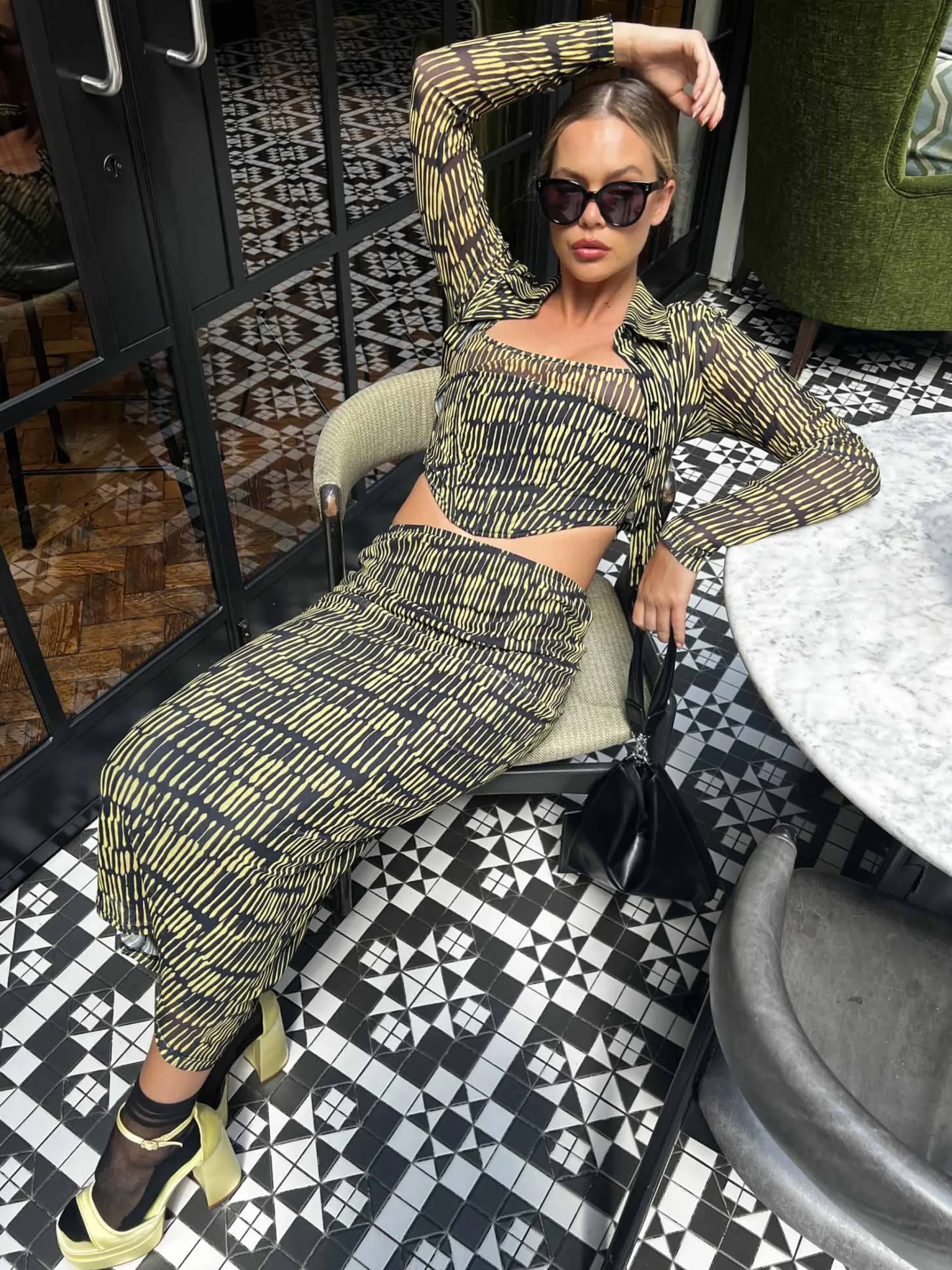 Glamorous Yellow Sketch Stripe Mesh Skinny Fit Shirt. We cant get enough of this skinny fit shirt in this unique printed mesh fabric. Pair with the matching midi skirt and chunky heels for an effortless co-ord look.