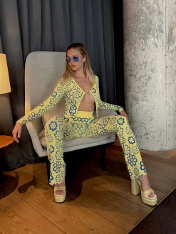 Glamorous Blue Yellow Intarsia Knit Chain Fastened Top. This open front top is so on trend this season. Featuring a colourful floral knit design, and chain fastening detail, we love this statement piece here at Glamorous. Pair with matching flared trousers for the ultimate trendy look.