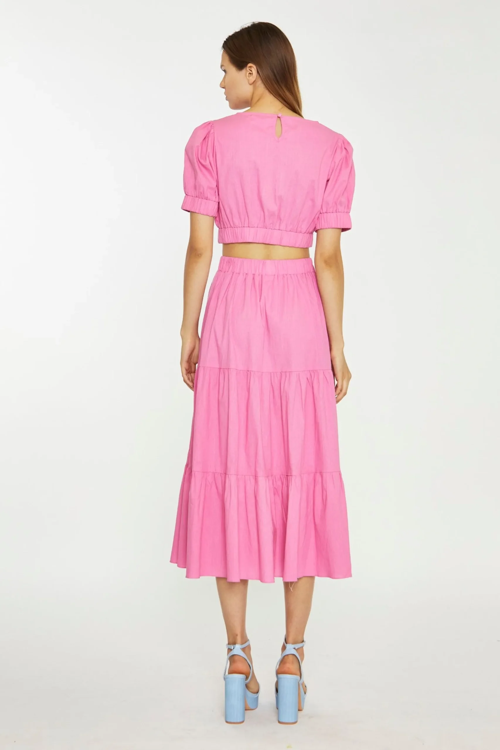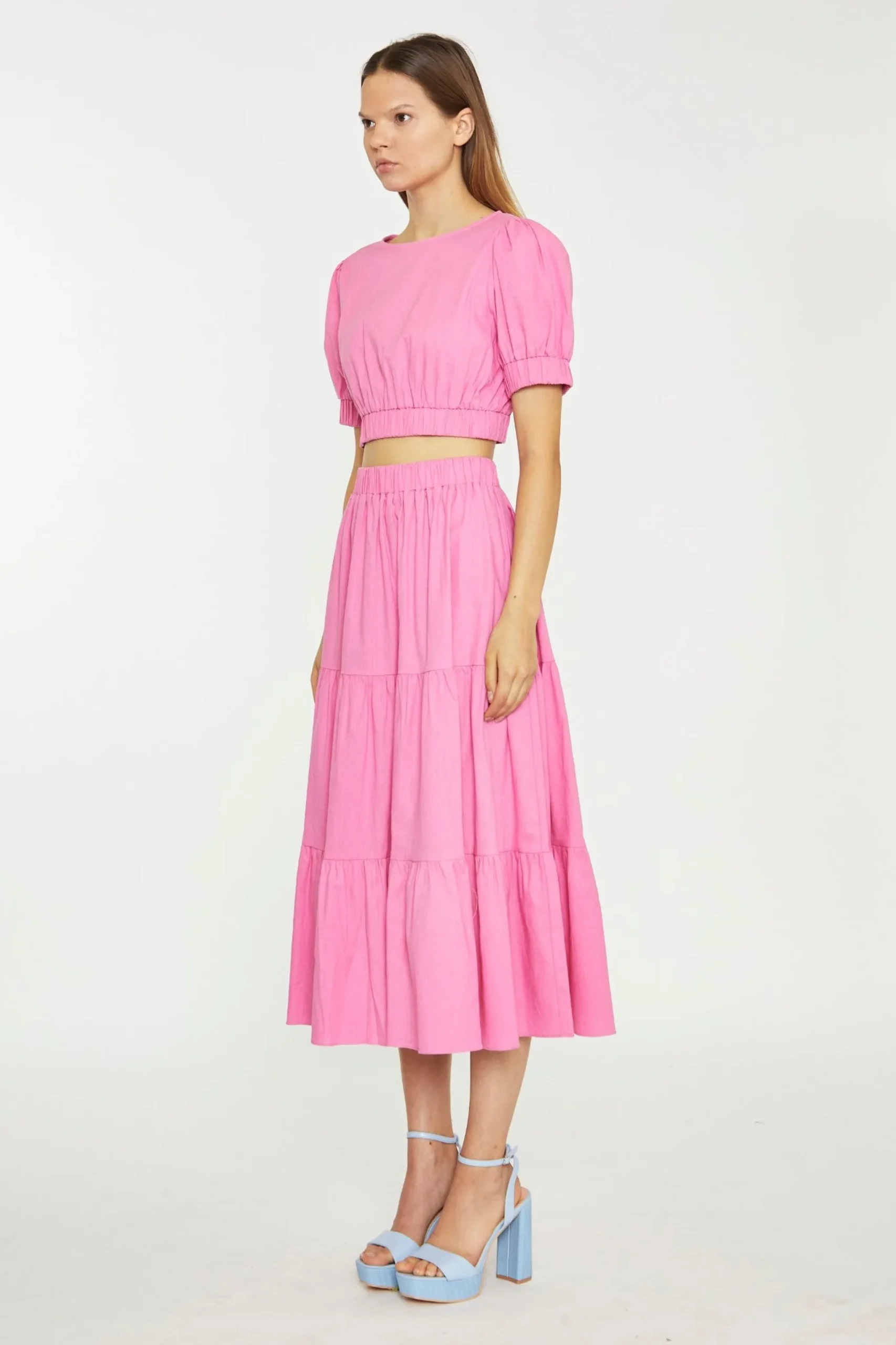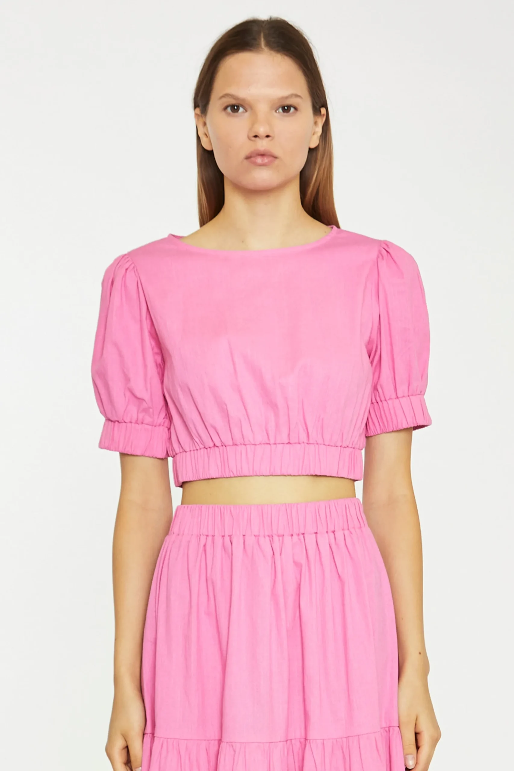 Featuring a beautiful Azalea pink colour and puff sleeves, this crop-top is both trendy and unique. The fitted silhouette and crop length provide a flattering fit while the back zip closure adds a touch of sophistication and style.