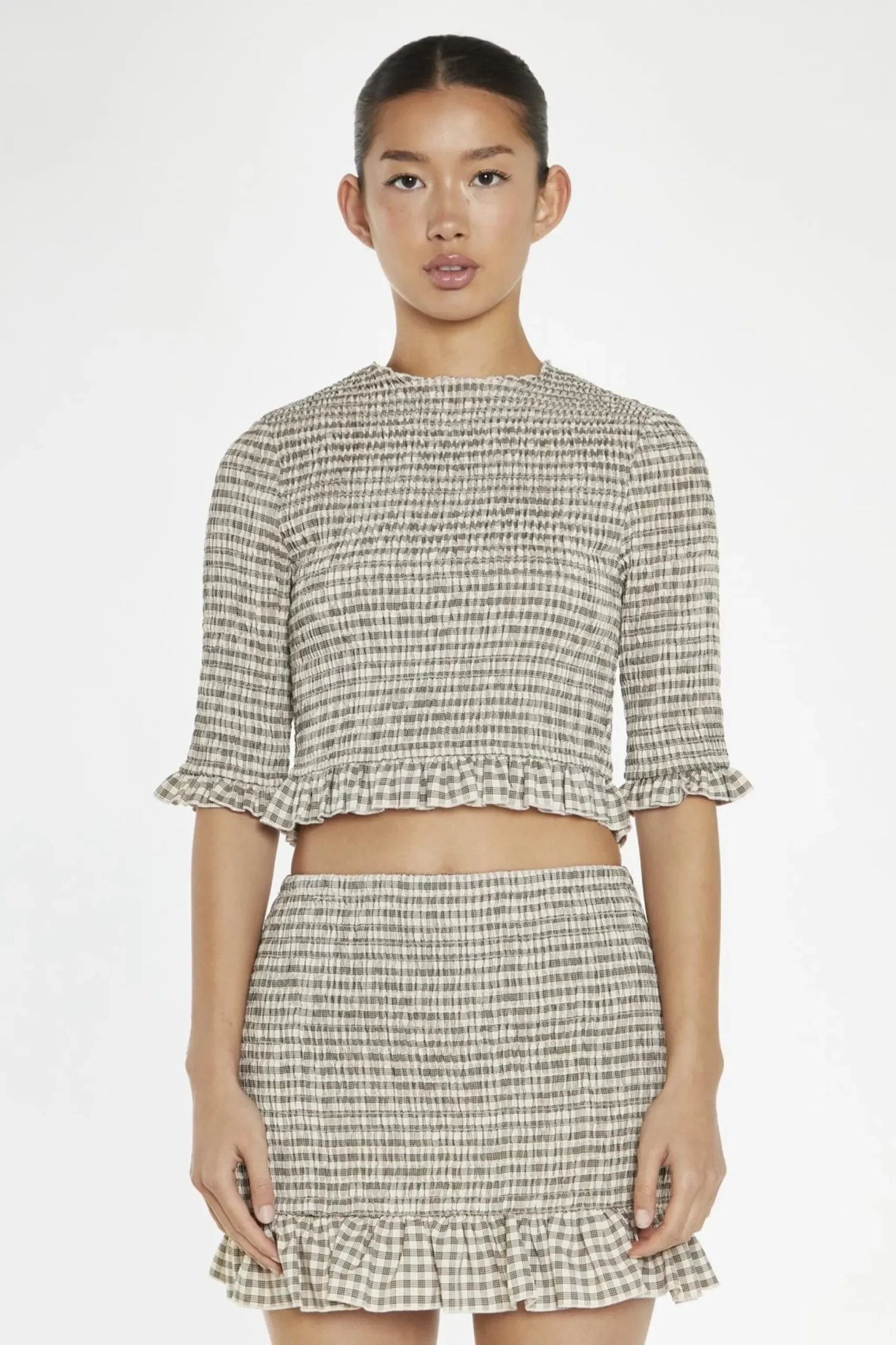 Glamorous Women’s Beige-Black Check Shirred Crop-Top. Embrace the cozy charm of autumn with our Beige-Black Check Shirred Crop-Top! This stylish piece features a shirred bodice that hugs your curves in all the right places, while the frill hem detail adds a playful touch. The high neckline provides a touch of sophistication, while the cropped length keeps you feeling confident and comfortable. Pair it with your favourite jeans or the matching skirt for a chic, laid-back look that’s perfect for any autumn adventure. Get ready to turn heads and feel fabulous in this must-have addition to your wardrobe!