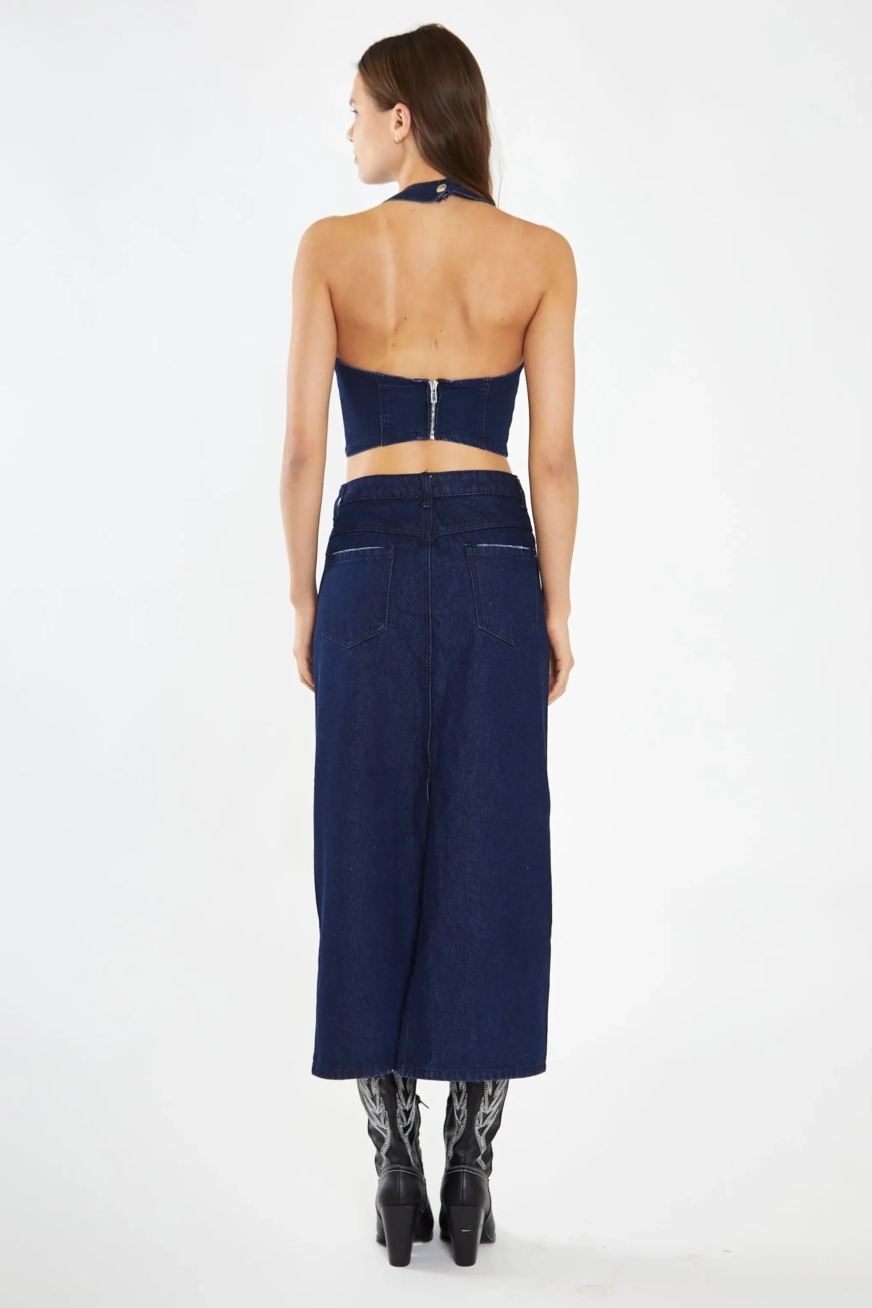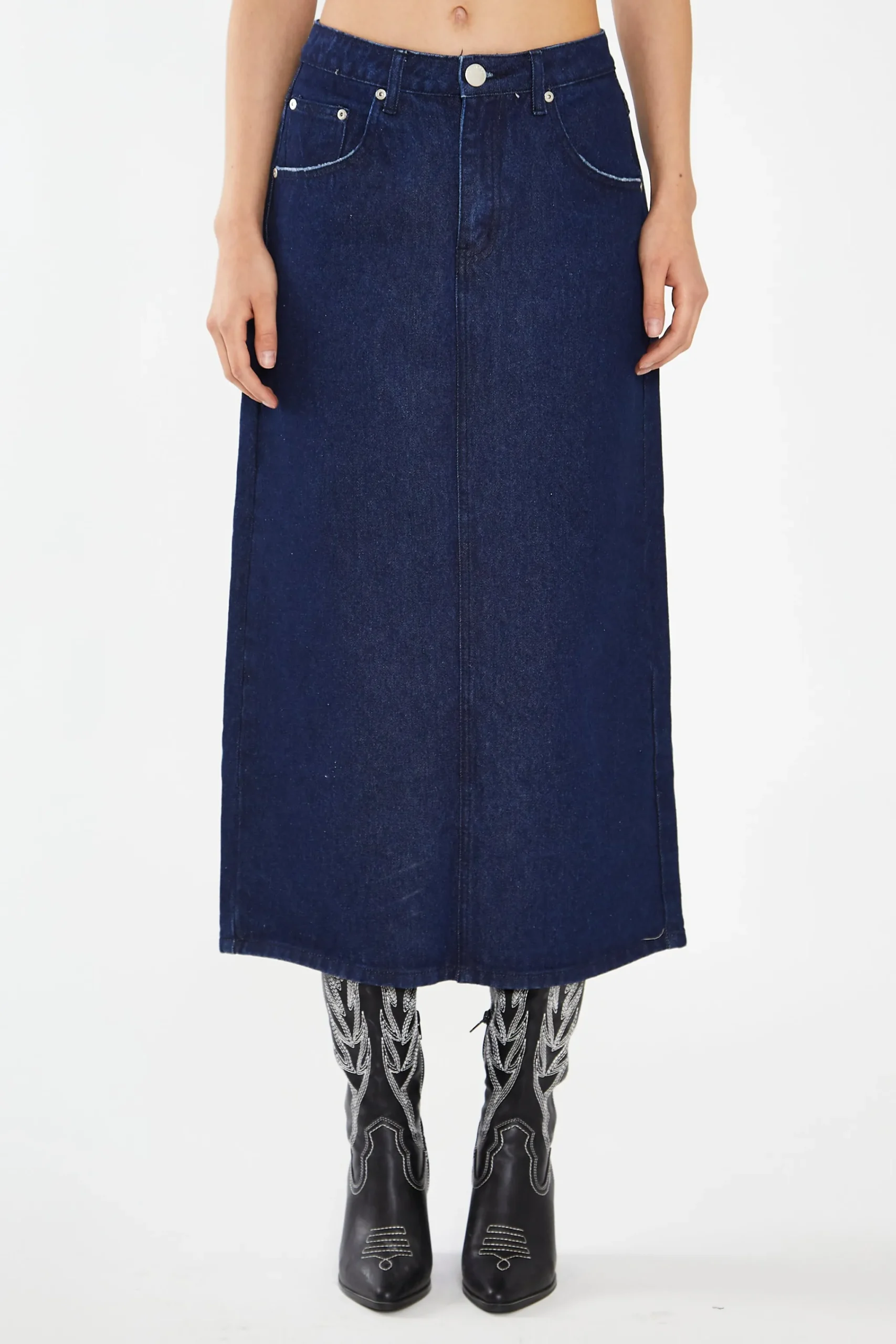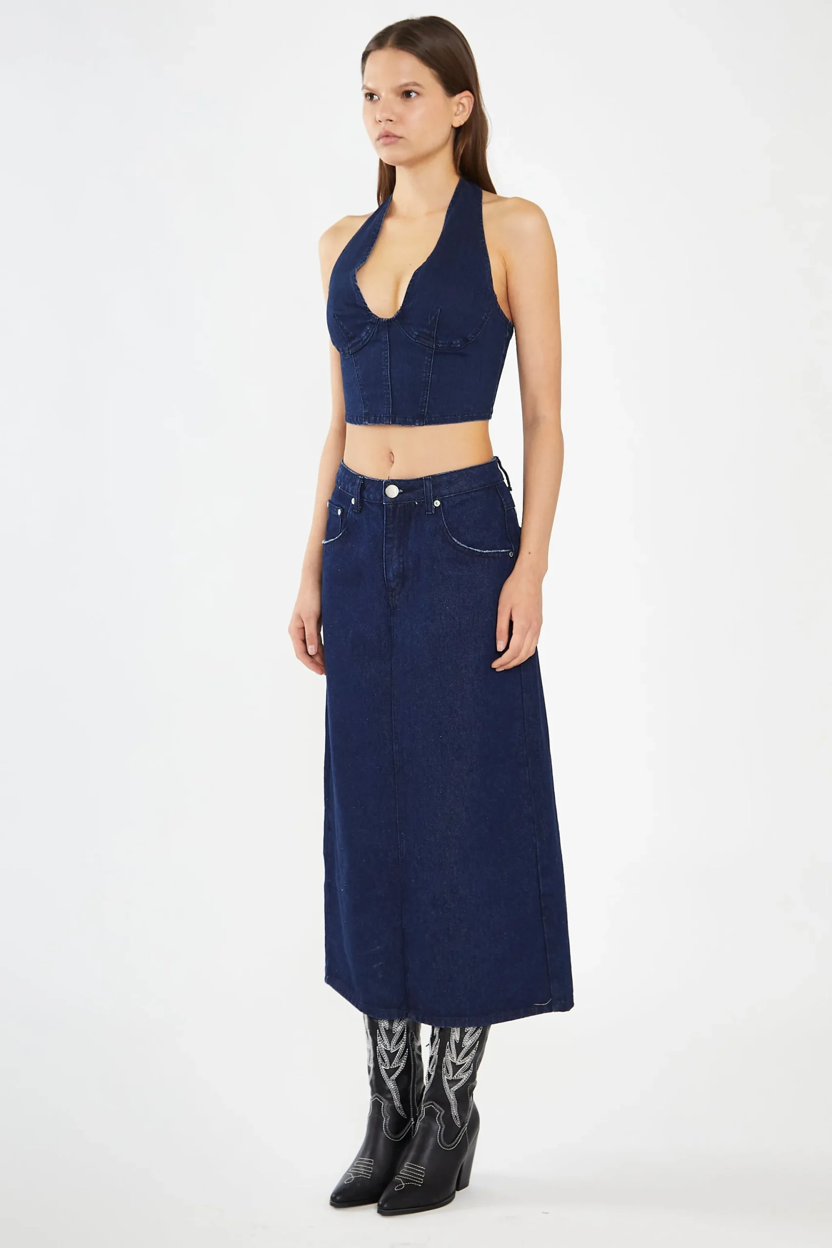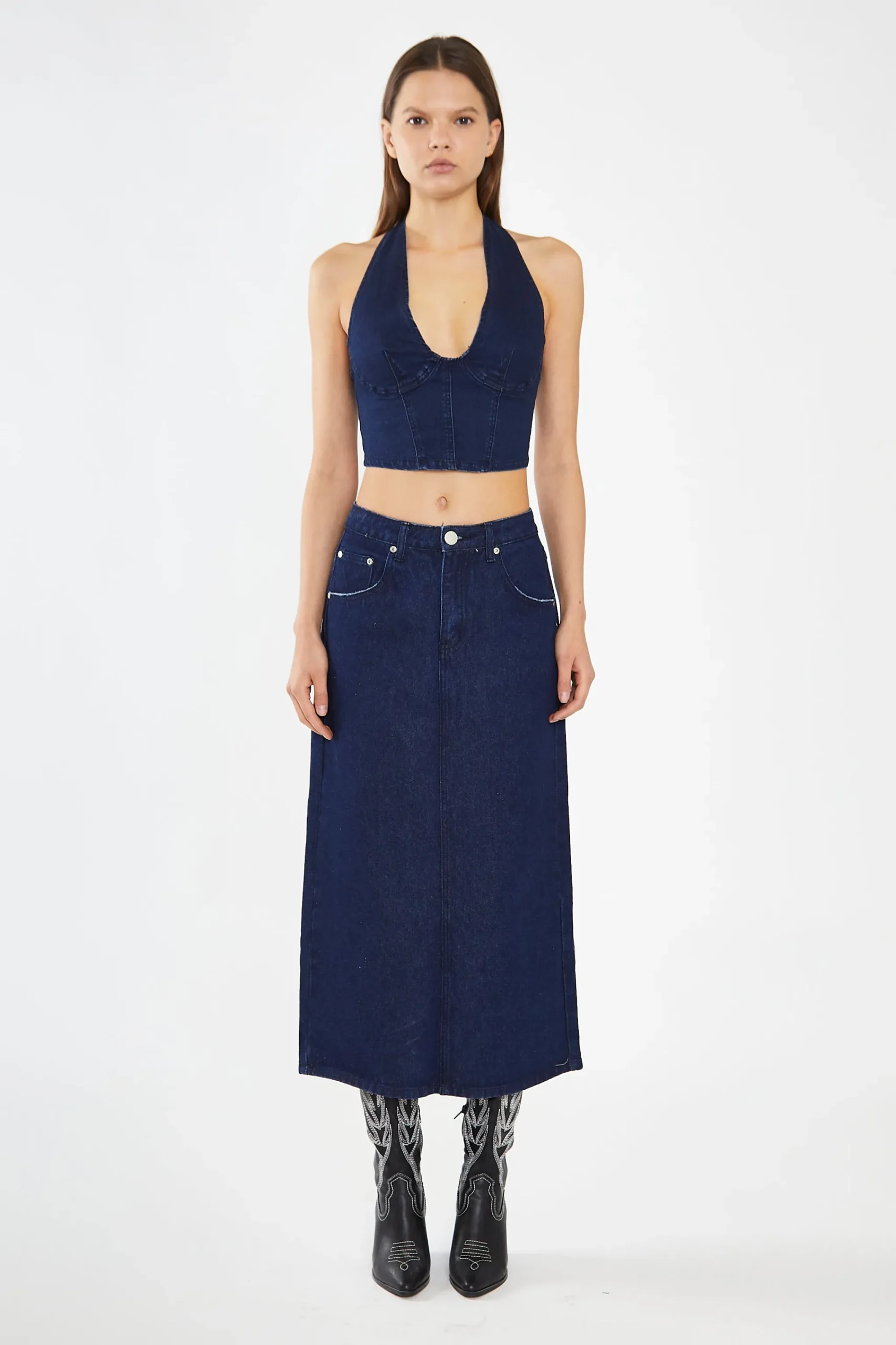 Glamorous Womens Indigo-Blue Front Split Denim Maxi-Skirt. Add a pop of colour to any look with this versatile denim midi skirt! In a stylish indigo hue, this denim skirt pairs perfectly with crop top and trainers for an effortlessly chic look. Outfitted with pockets and a comfy waistband, this skirt lets you look good and feel great all day long.