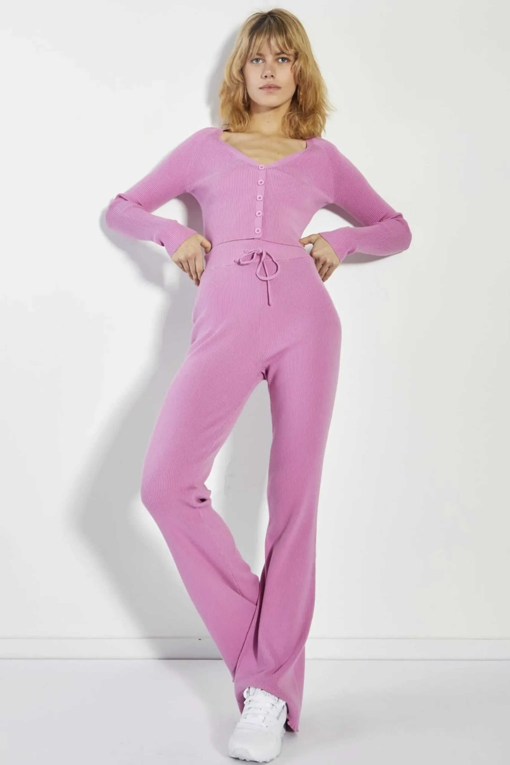 Glamorous Women’s Mauve-Pink Knitted Flared-Trousers. Crafted from a comfortable knit fabric, these mauve-pink flared trousers offer a stylish and versatile addition to your wardrobe. The flattering flared leg design elongates the silhouette while the knitted material provides a soft and stretchy fit. Perfect for any occasion, these trousers offer both comfort and sophistication.