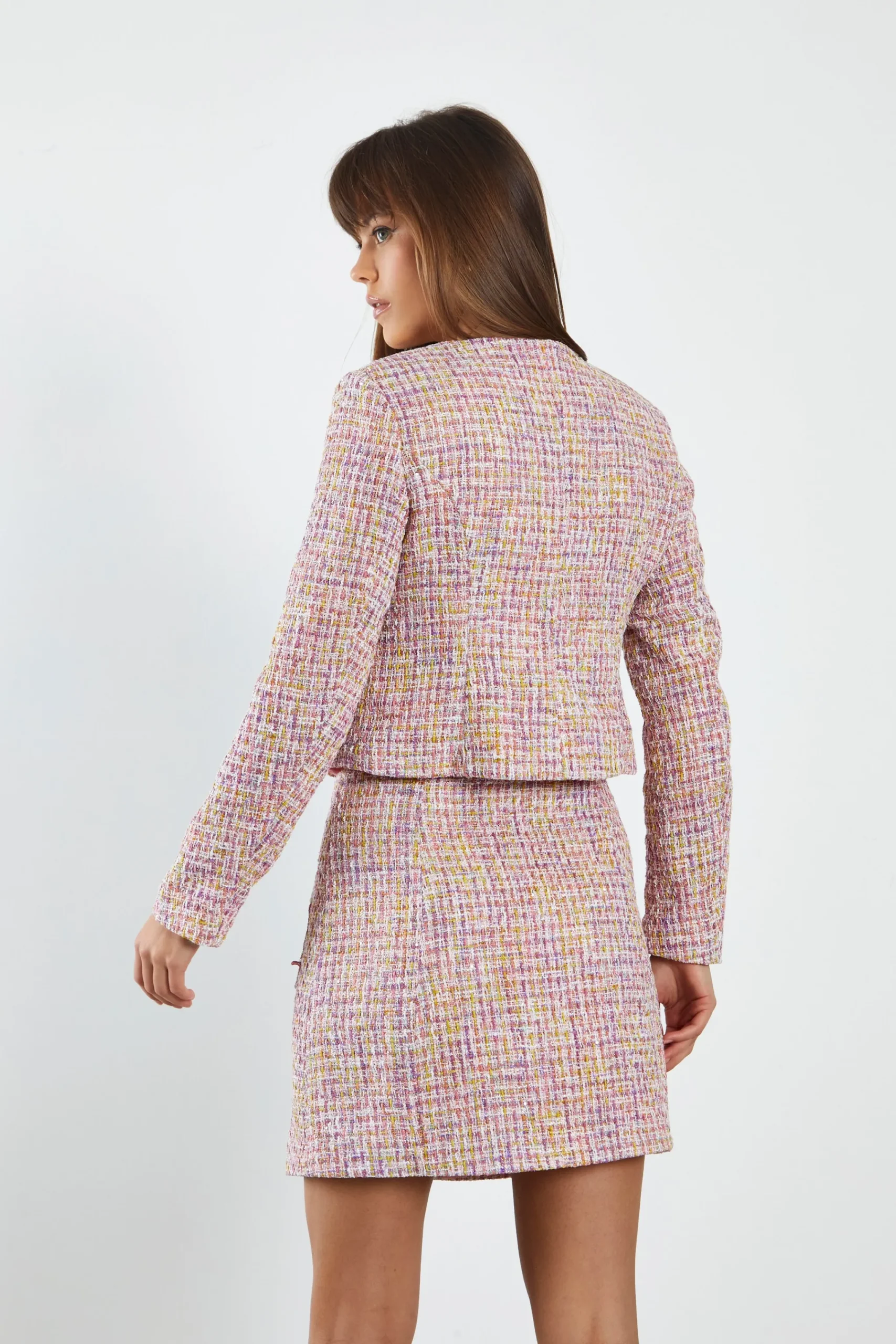 Glamorous Pink Multi Tweed White Jacket with Contrast Trim Pockets. This elegant tweed jacket is perfect for any occasion. Featuring a tailored fit, with contrasting trim pockets and gold buttons , this luxe tweed jacket is the perfect way to elevate your look for autumn. Pair with matching co-ord mini skirt and chunky heels and a shoulder bag for the ultimate fashion forward sustainable look.