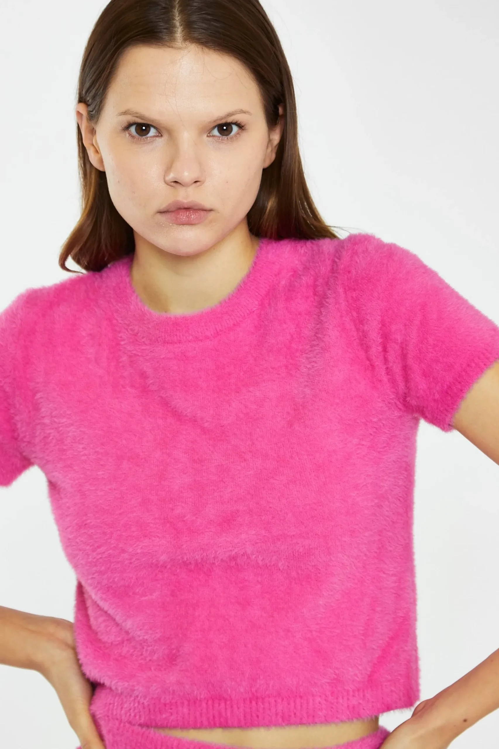 Glamorous Womens Hot Pink Short-Sleeve Knitted Crop-Top. Stay cosy yet fashionable with this hot pink knitted top, perfect for this autumn season. Featuring a simplistic round neckline style and short sleeves, this top is super flattering addition to your closet! This stylish piece can be pair with the matching skirt, or dressed down with denim jeans for an all day look.