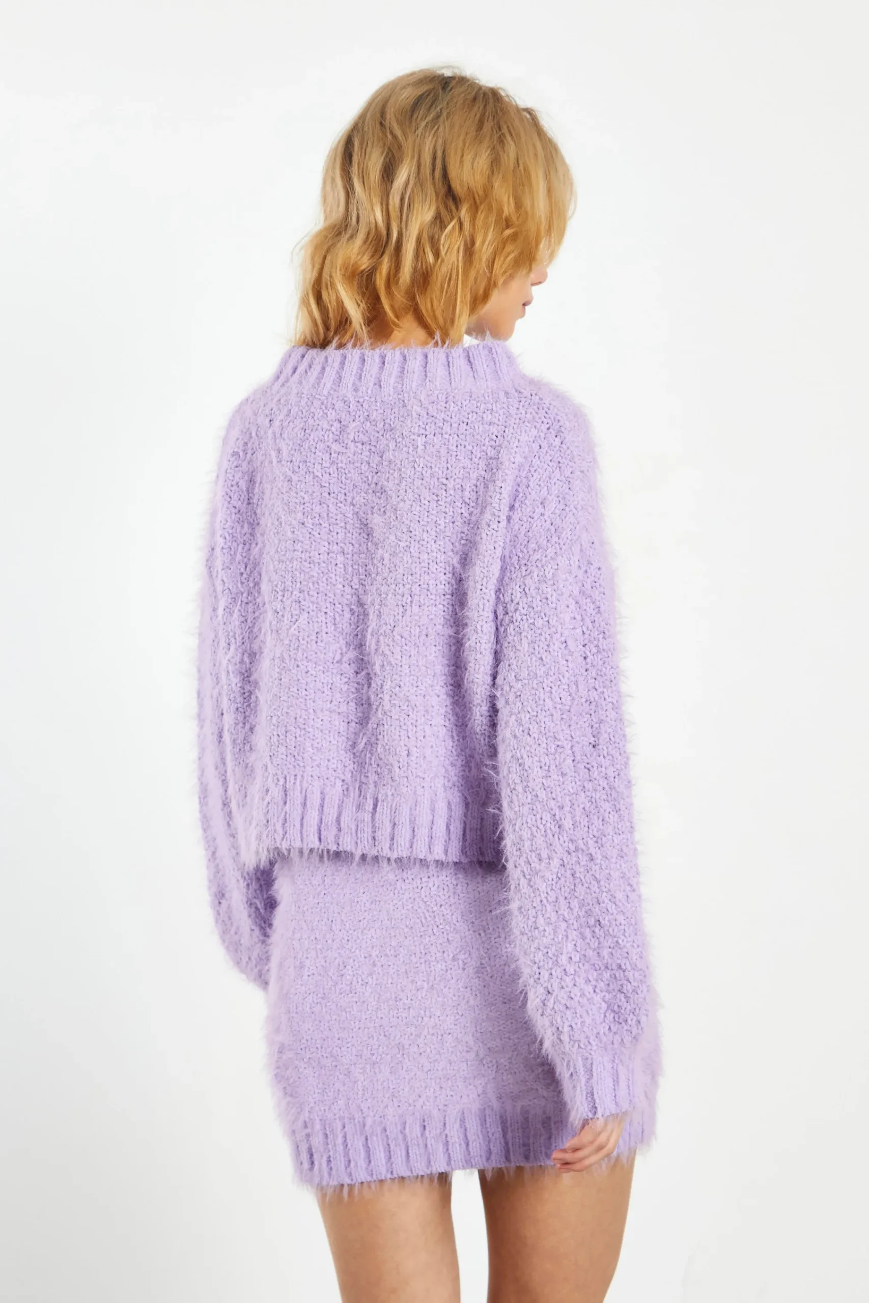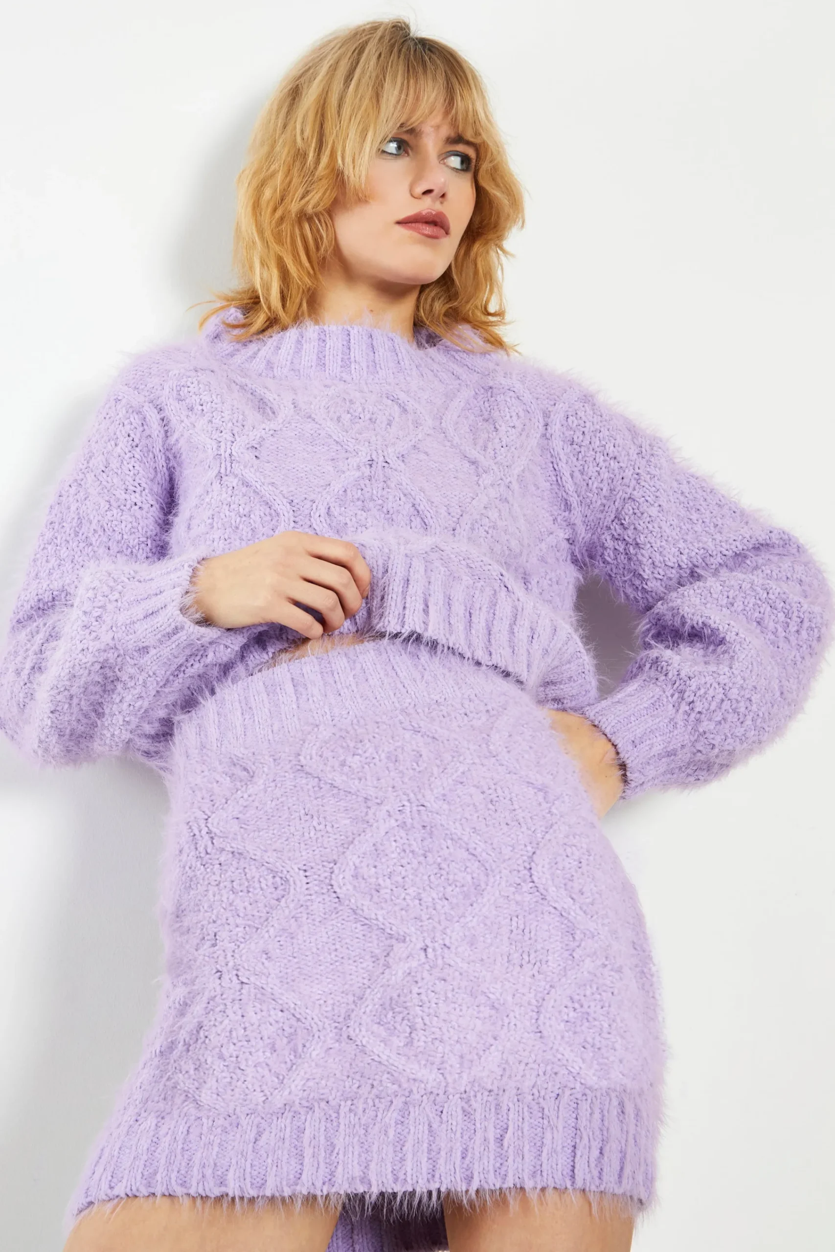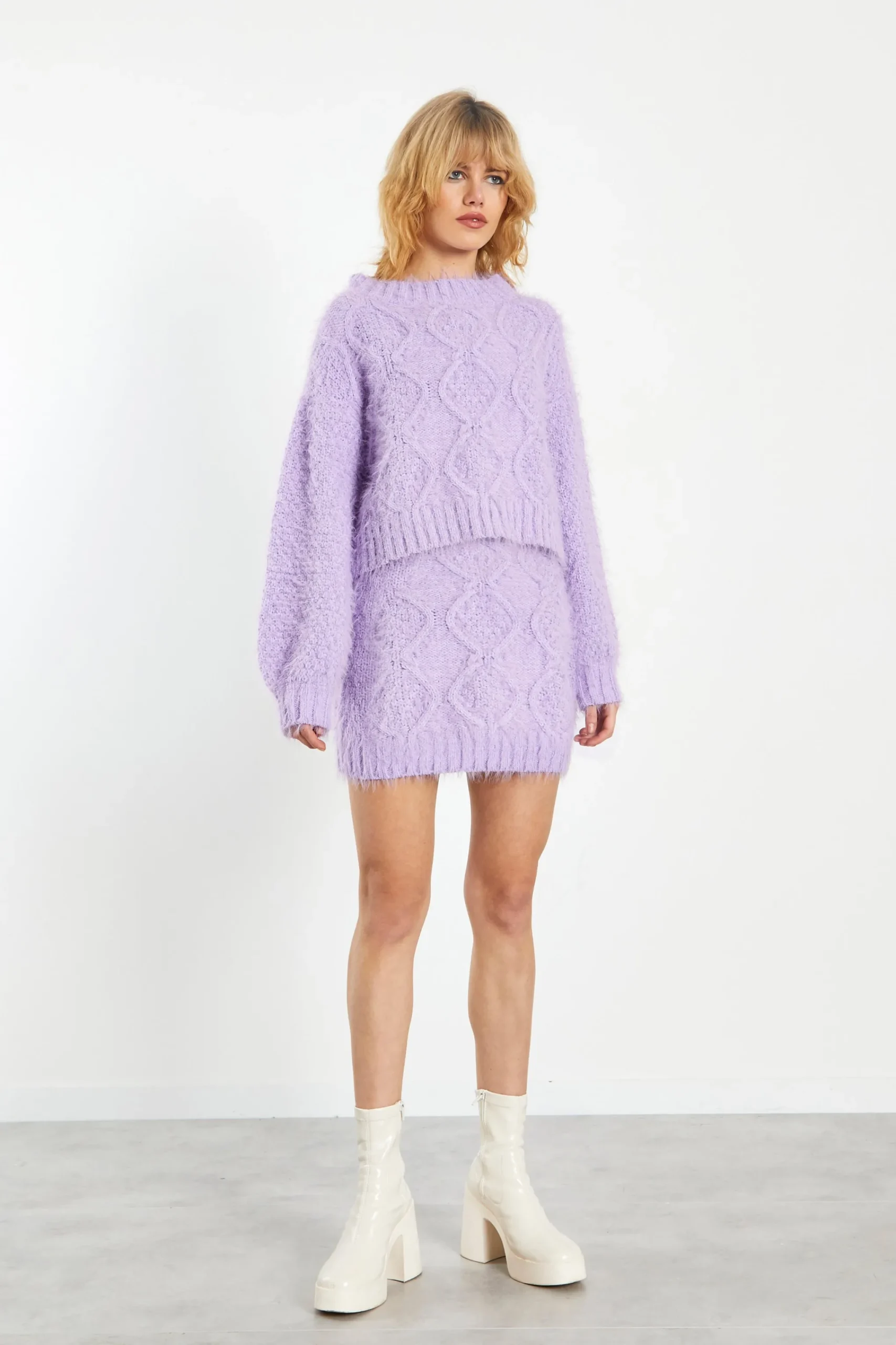 Glamorous Lilac Mini Skirt with Front Cable Knit Detail. This knitted skirt is the perfect addition to your wardrobe. Stay cozy yet fashionable and style with matching knitted jumper for the perfect winter look this season.