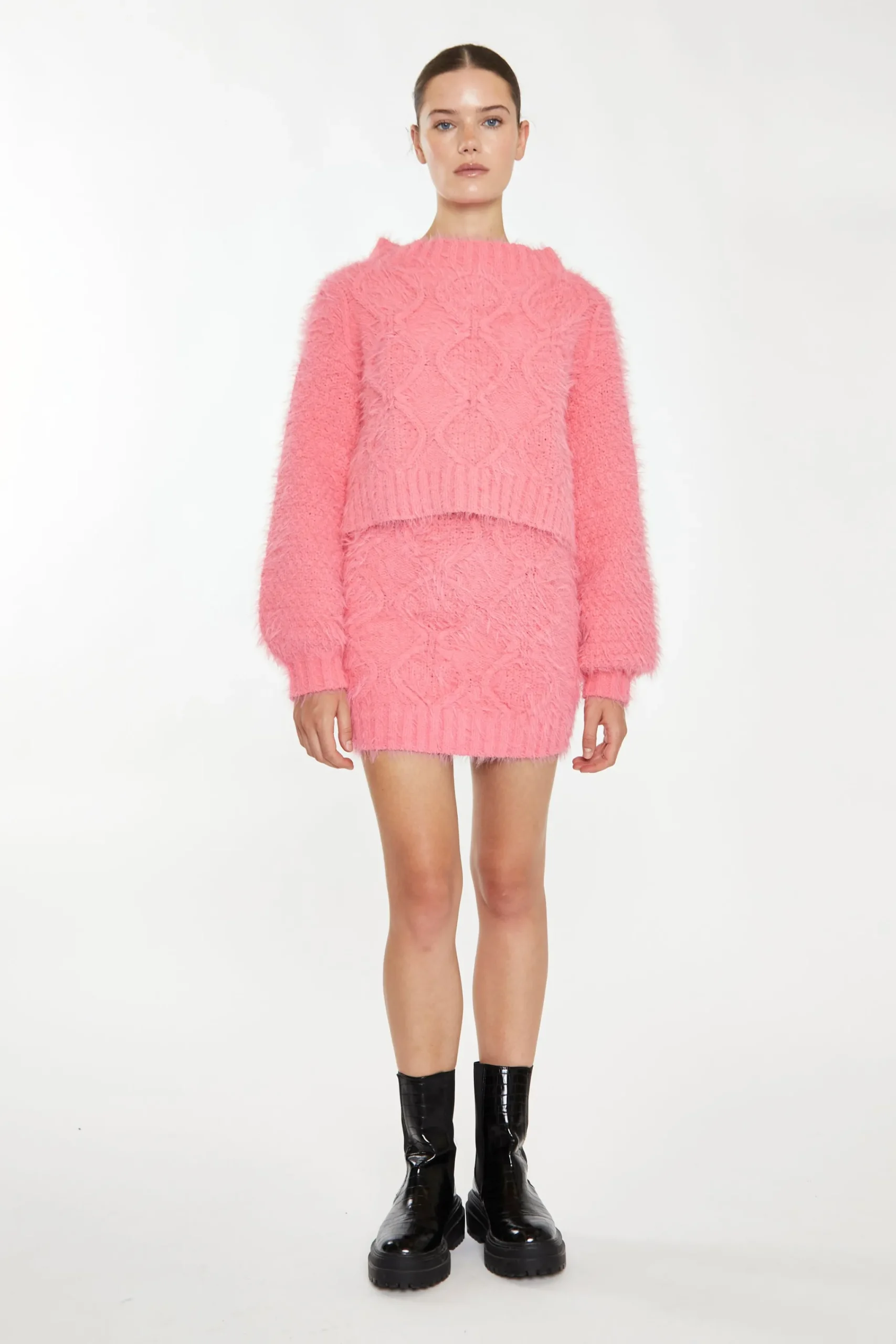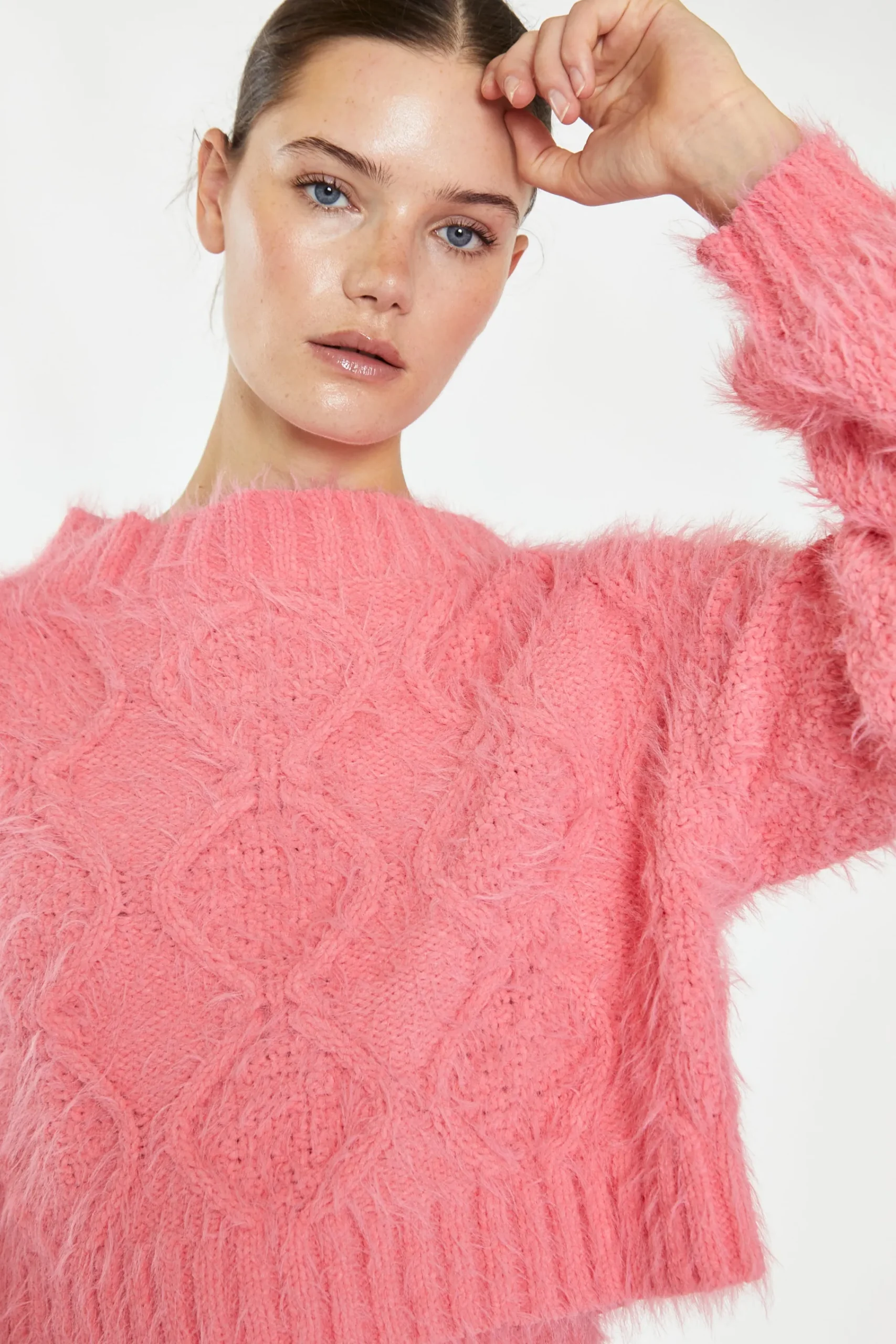 Glamorous Pink Knit Long Sleeve Jumper. This cosy jumper is sure to elevate your cool casual collection to the next level. Featuring a flattering fit with long sleeves in a cable knit style, this jumper is perfect for you! Team with our matching co-ord mini skirt for an effortless, yet on-trend look this season.