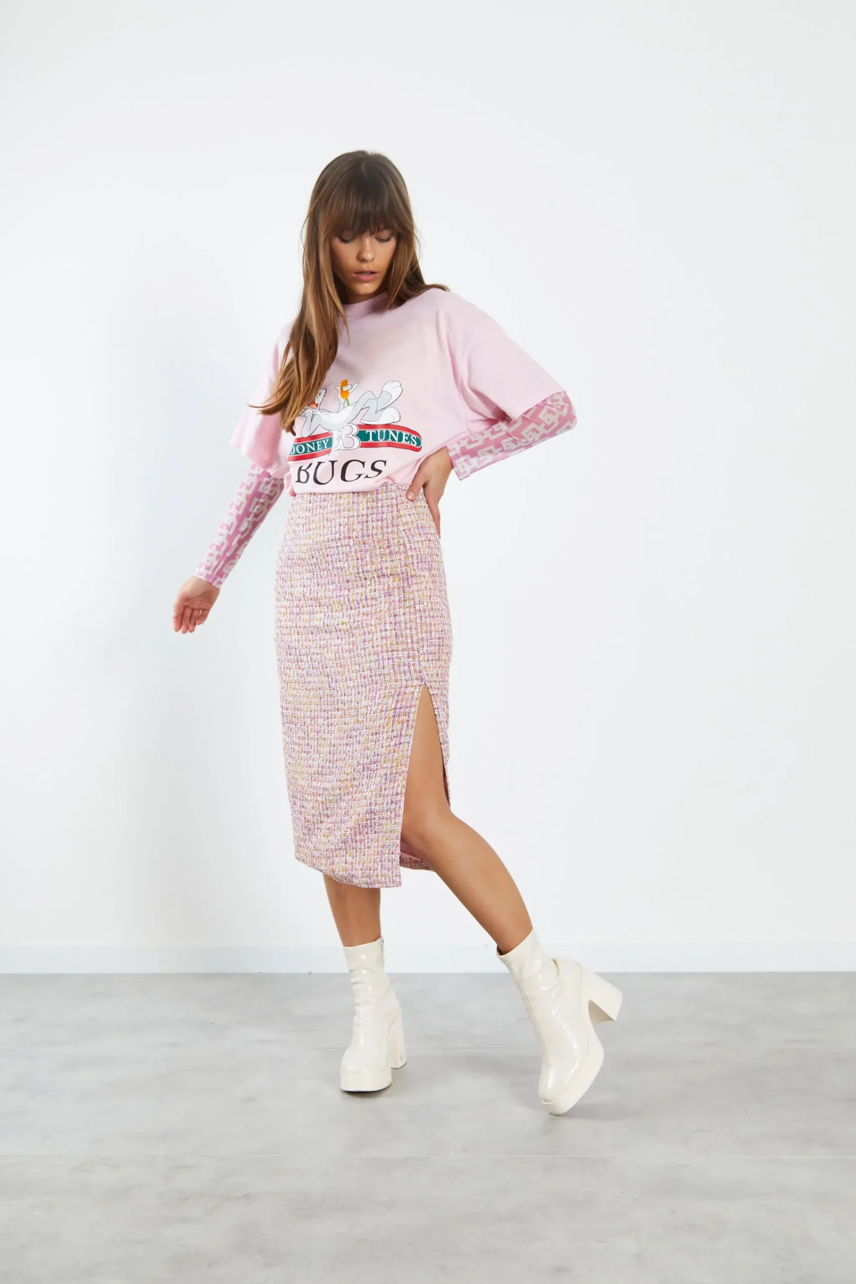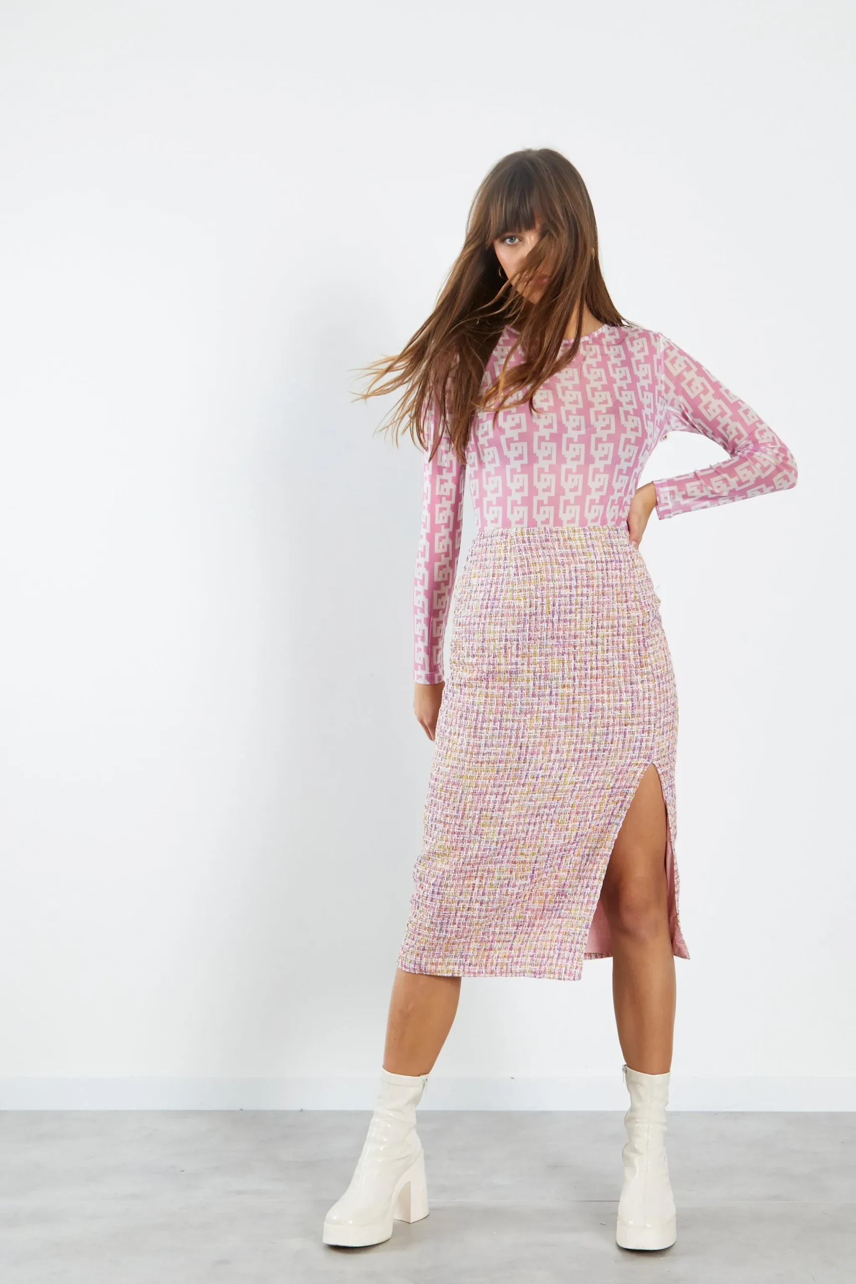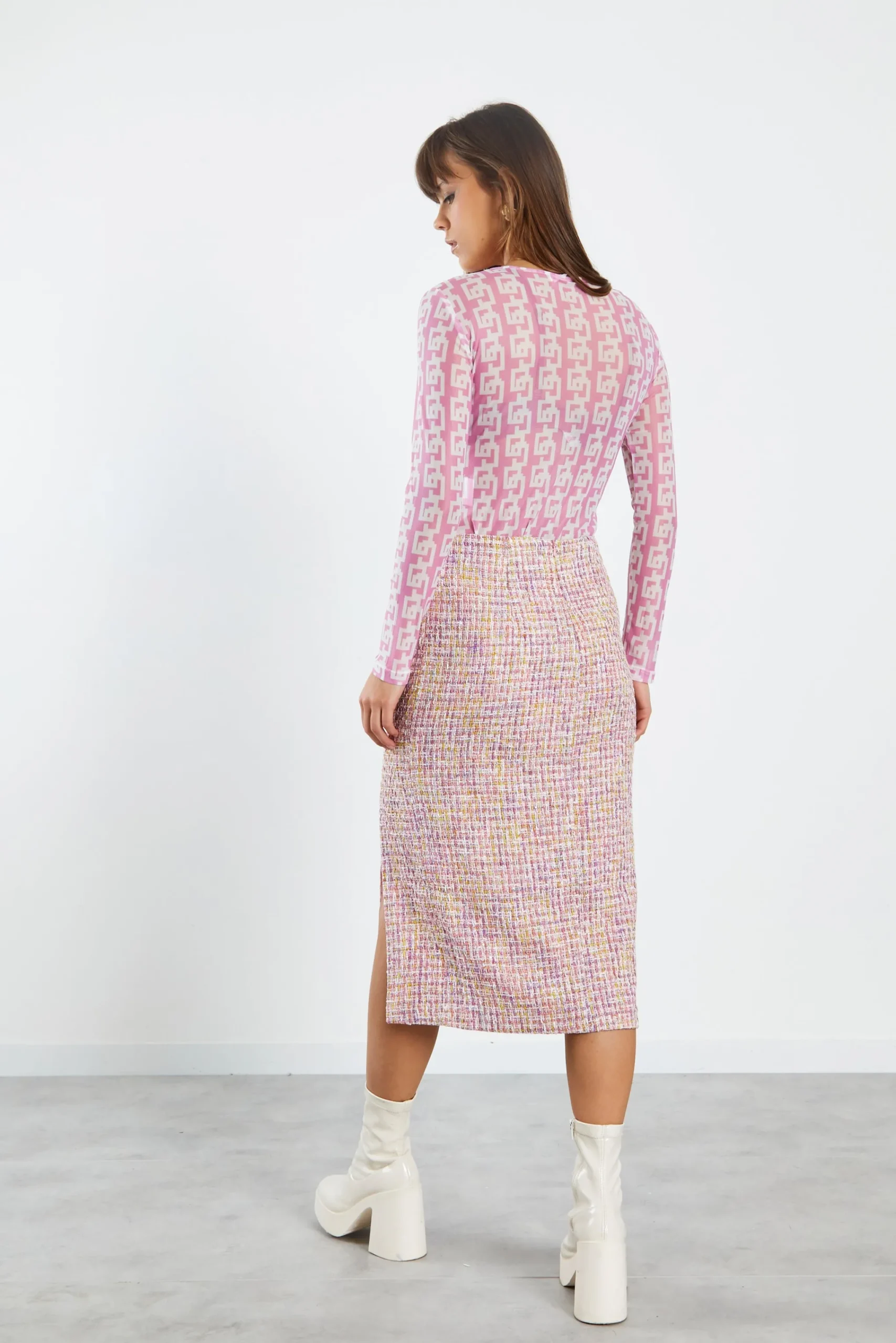 Glamorous Pink Multi Tweed Midi Skirt with Side Split. Fashion forward and chic we love this midi skirt here at Glamorous. Featuring a tailored, high waisted fit, and side split, this midi skirt wont fail to impress! Pair with matching jacket and some chunky boots for the ultimate daytime chic look.