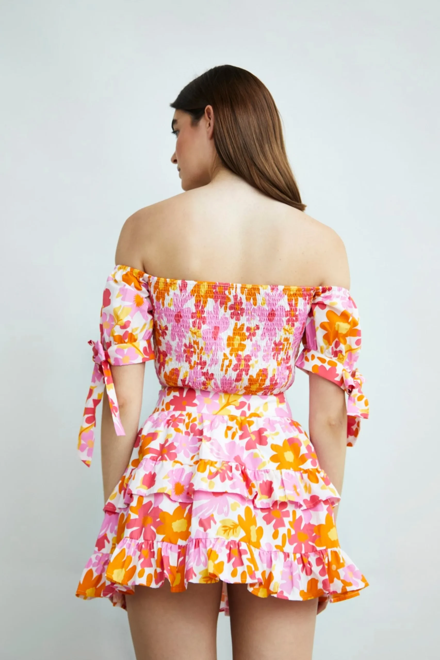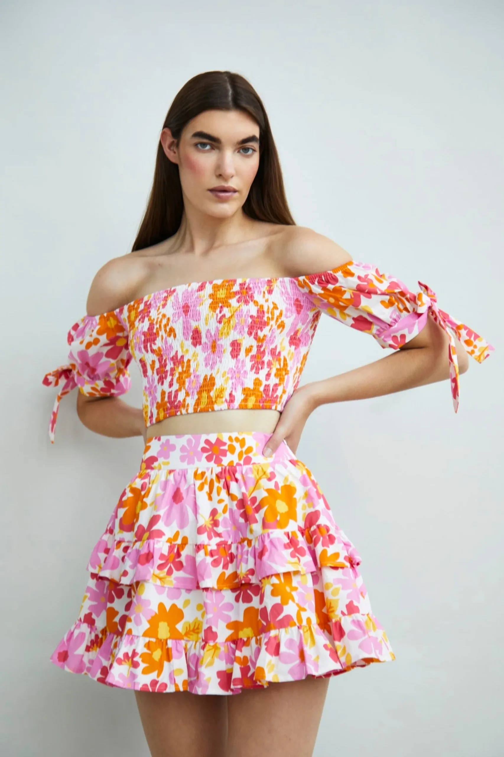 Glamorous Collection Pink Bright Floral Ruffle Mini Skirt. We love this cute mini skirt here at Glamorous! Featuring gathered tiers and ruffles, this skirt is super fun addition to your closet! Style with some the matching crop top and bold chunky heels for the perfect summer outfit.