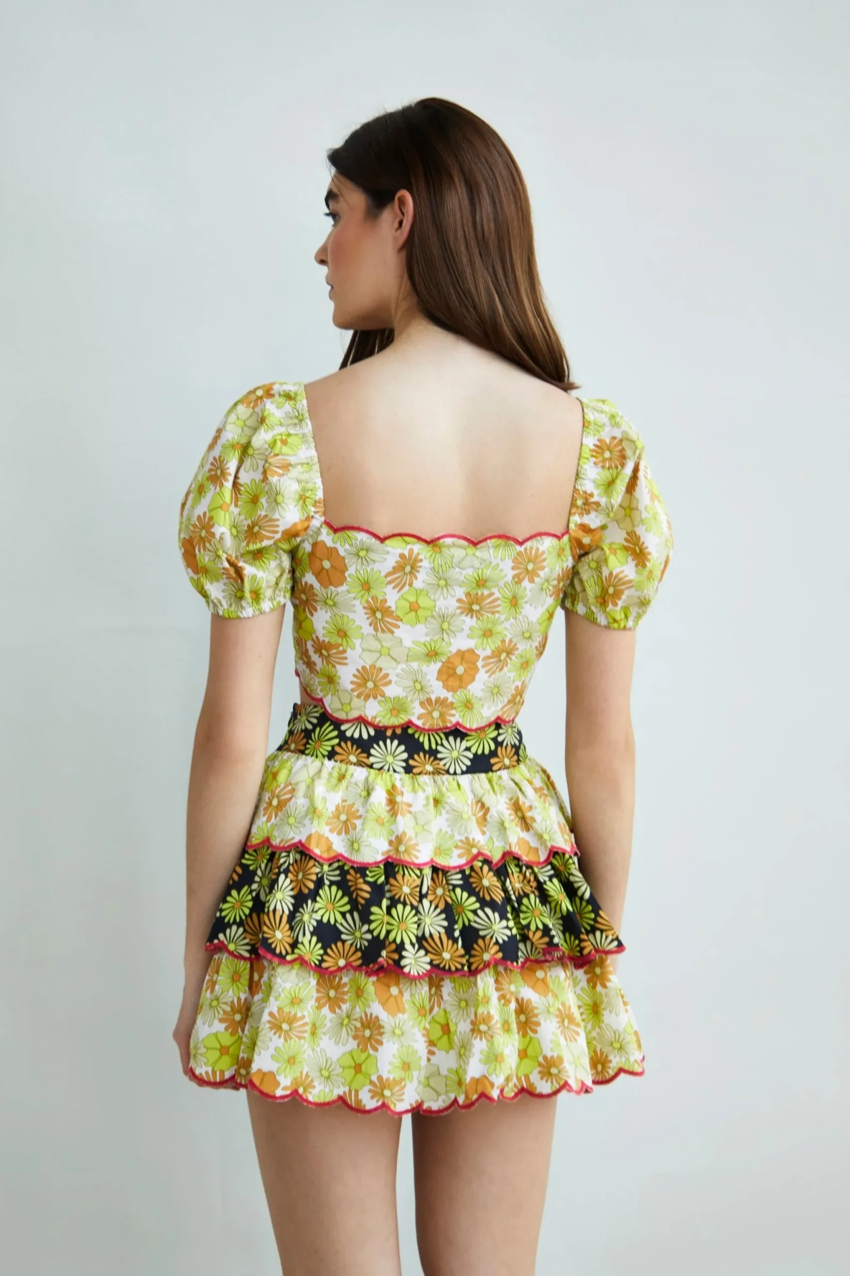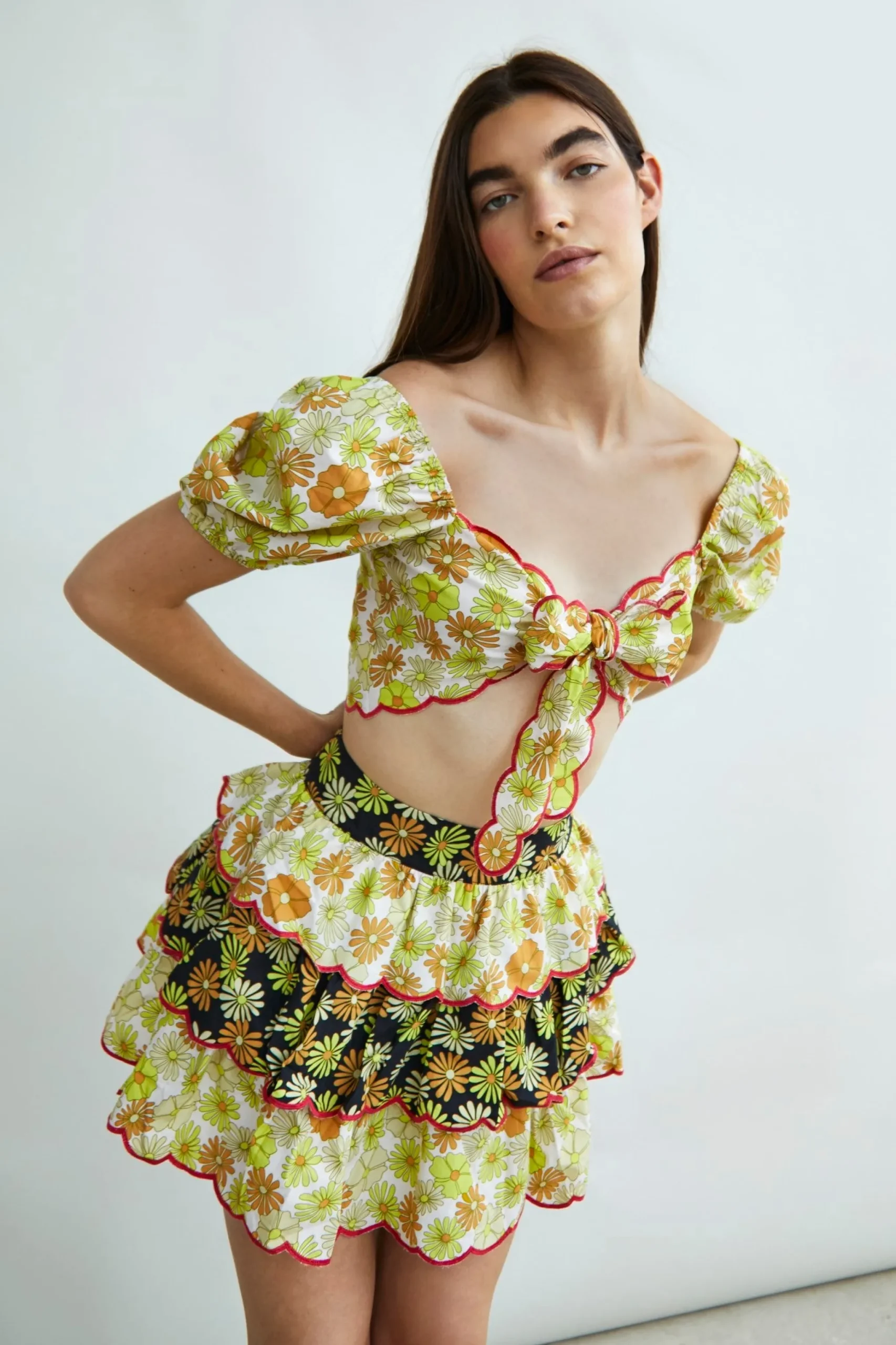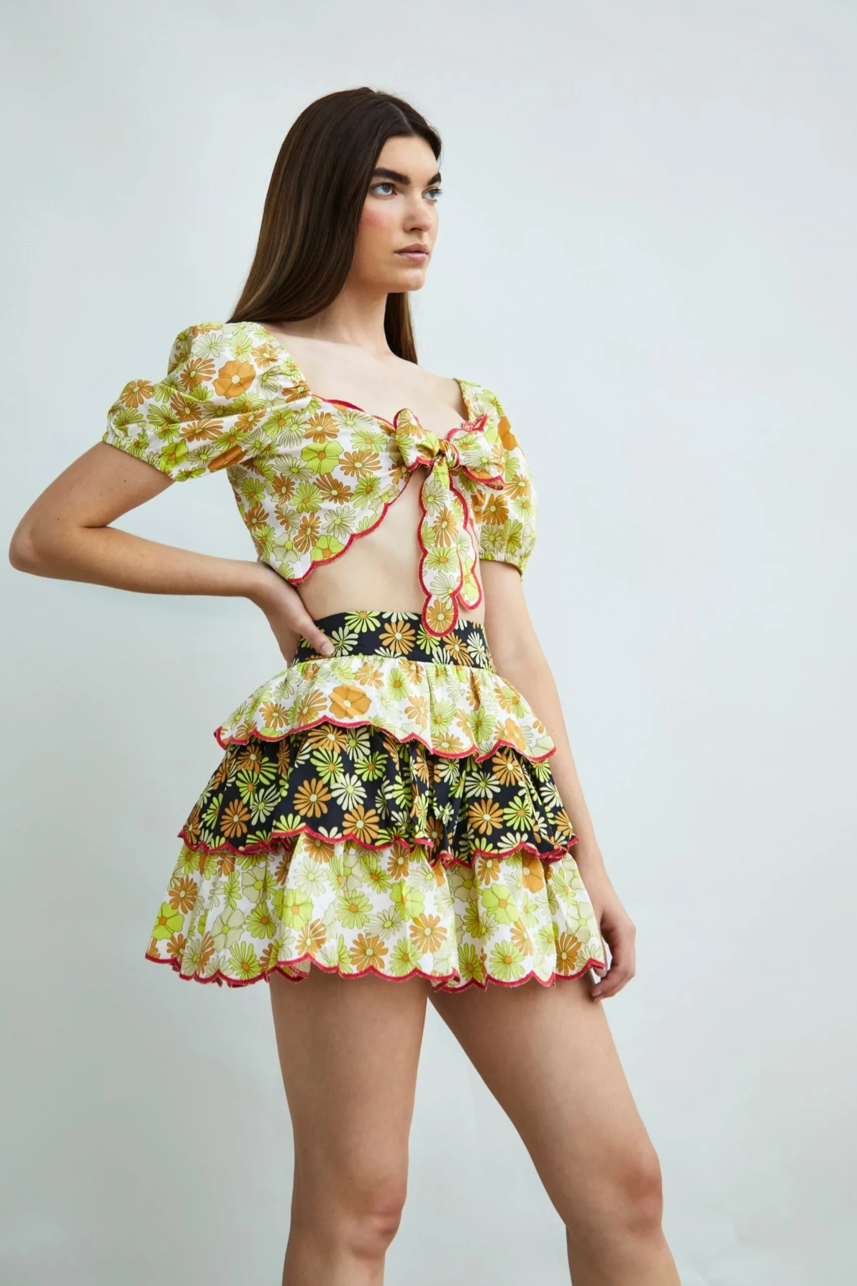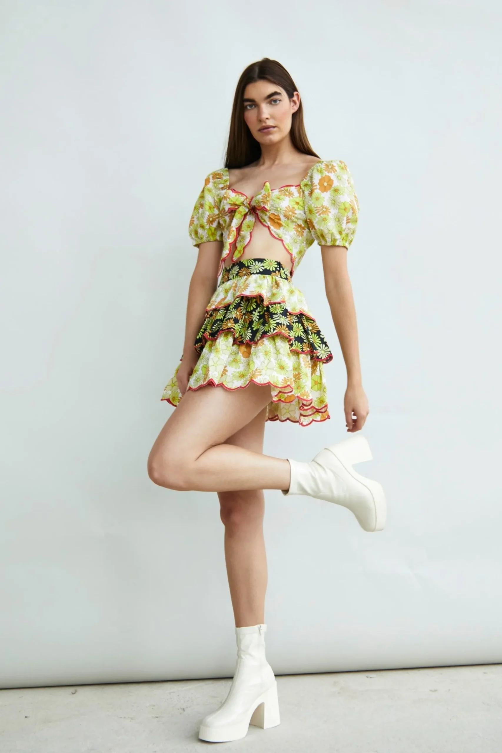 Glamorous Collection Retro Floral Mix Print Tiered Ruffle Mini Skirt. Opt for a retro floral print with this flattering mini skirt. Featuring a tiered ruffle design, this skirt is super flattering addition to your closet! Style with your favourite chunky boots and the matching top for an on trend look.